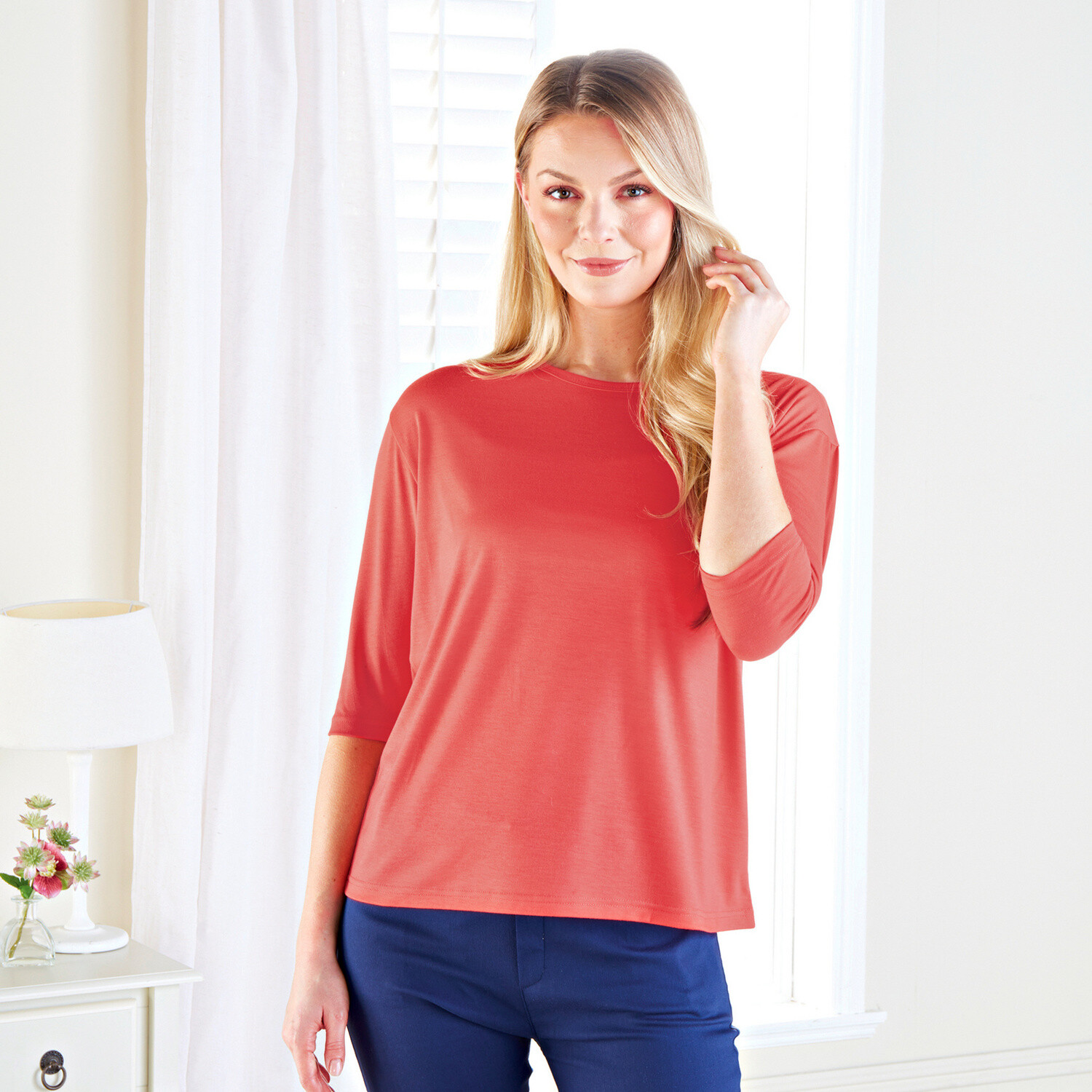 Módny hit: tričká v najnovších letných farbách: koralová, tyrkysová a námornícka modrá. Budete v nich vyzerať skvele! S krátkymi rukávmi a okrúhlym výstrihom - elastické a tvarovo stále.