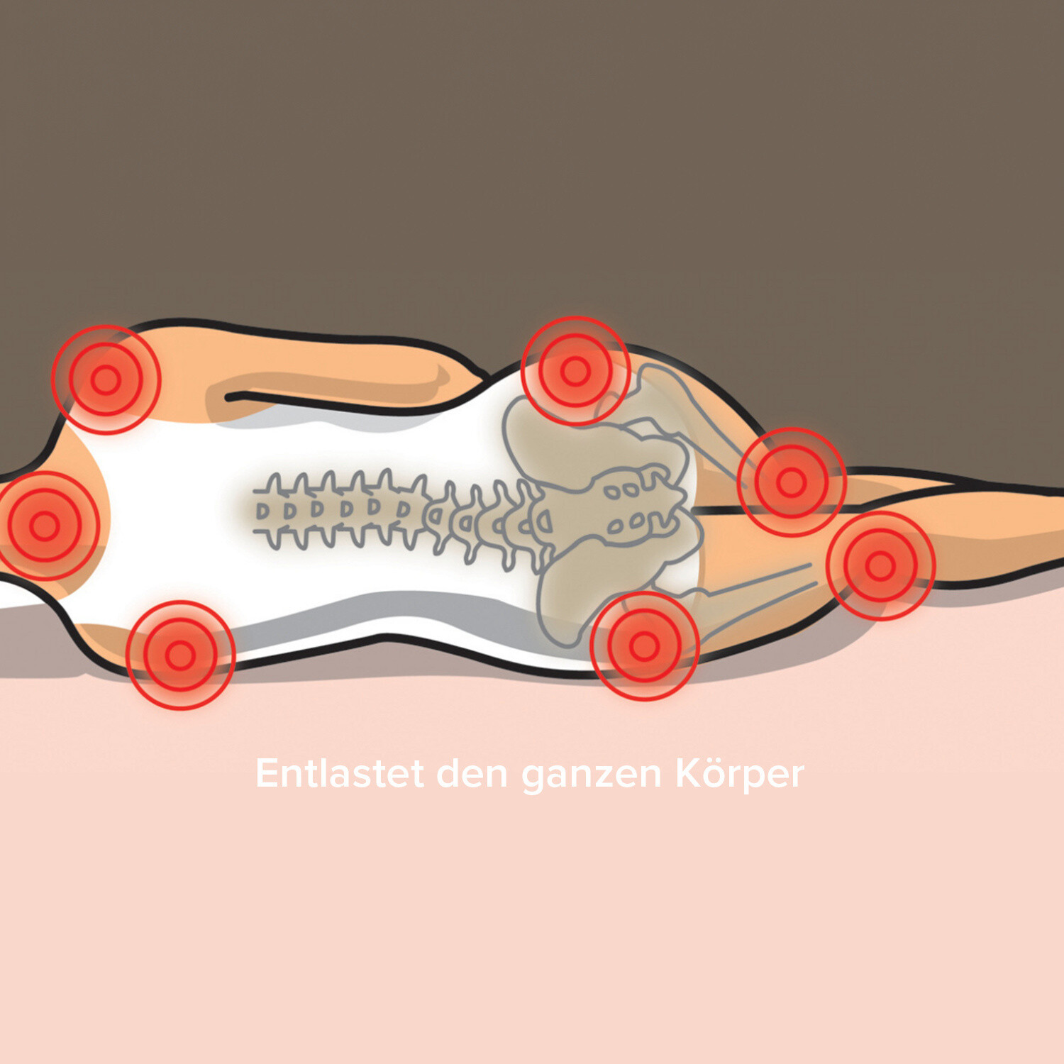Váš matrac už nie je najlepší? Prečo zbytočne utrácať veľa peňazí, keď je tu tento geniálny topper. S 5 strategicky rozmiestnenými zónami podoprie a uľaví celému telu - prakticky ako vodná posteľ. Vysokokvalitná pamäťová pena sa dokonale prispôsobí, aby rovnomerne rozložila Vašu hmotnosť a znížila tlak na hlavu a končatiny. Vaša chrbtica Vám za to poďakuje. Konečne budete opäť spať celú noc a prebúdzať sa svieži. Akonáhle vstanete, pena sa vždy vráti do pôvodného tvaru. Prečo teda kupovať nový matrac?