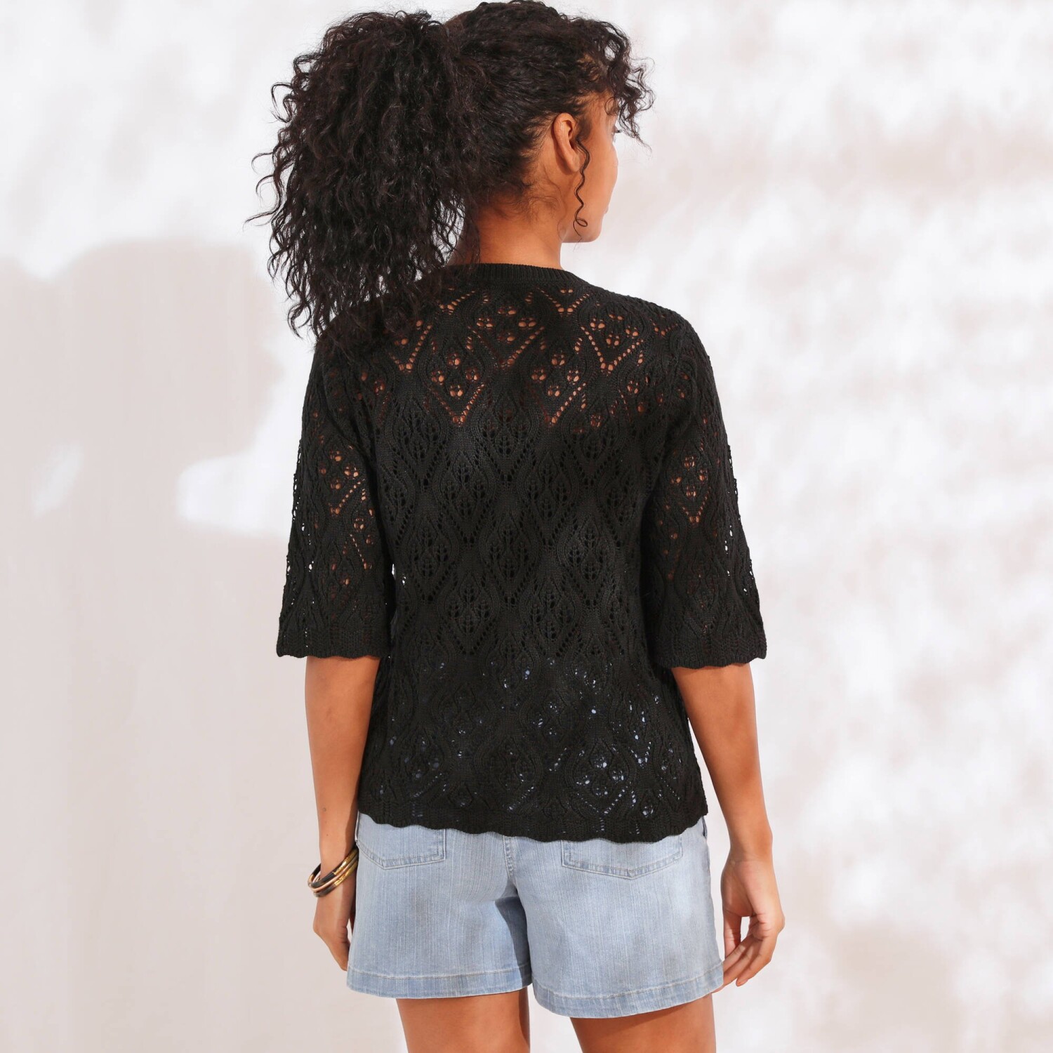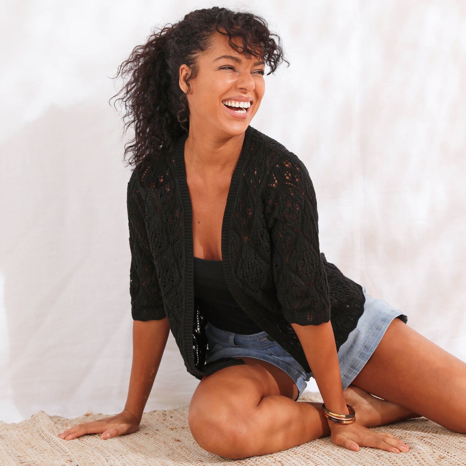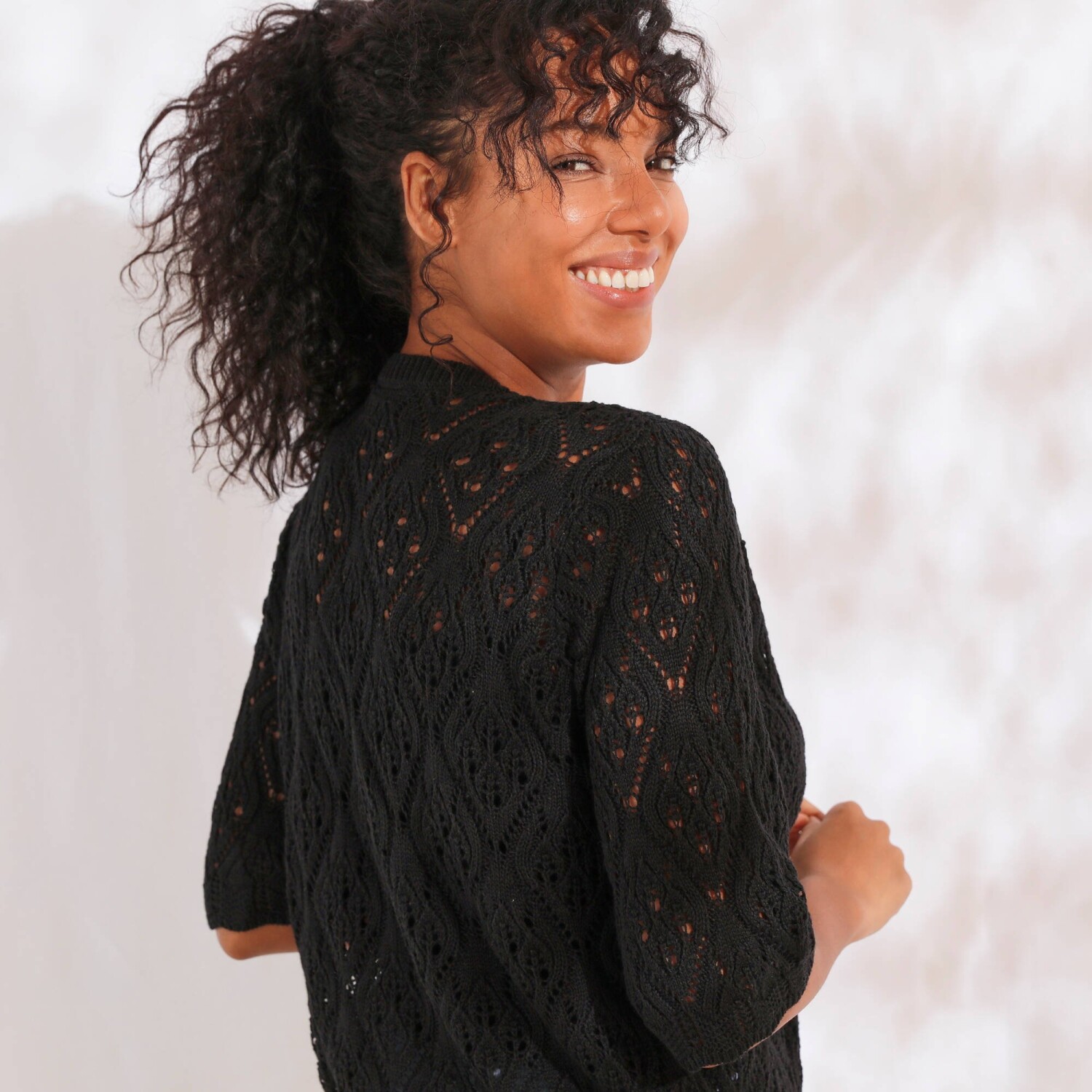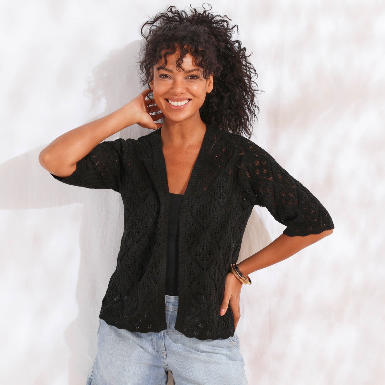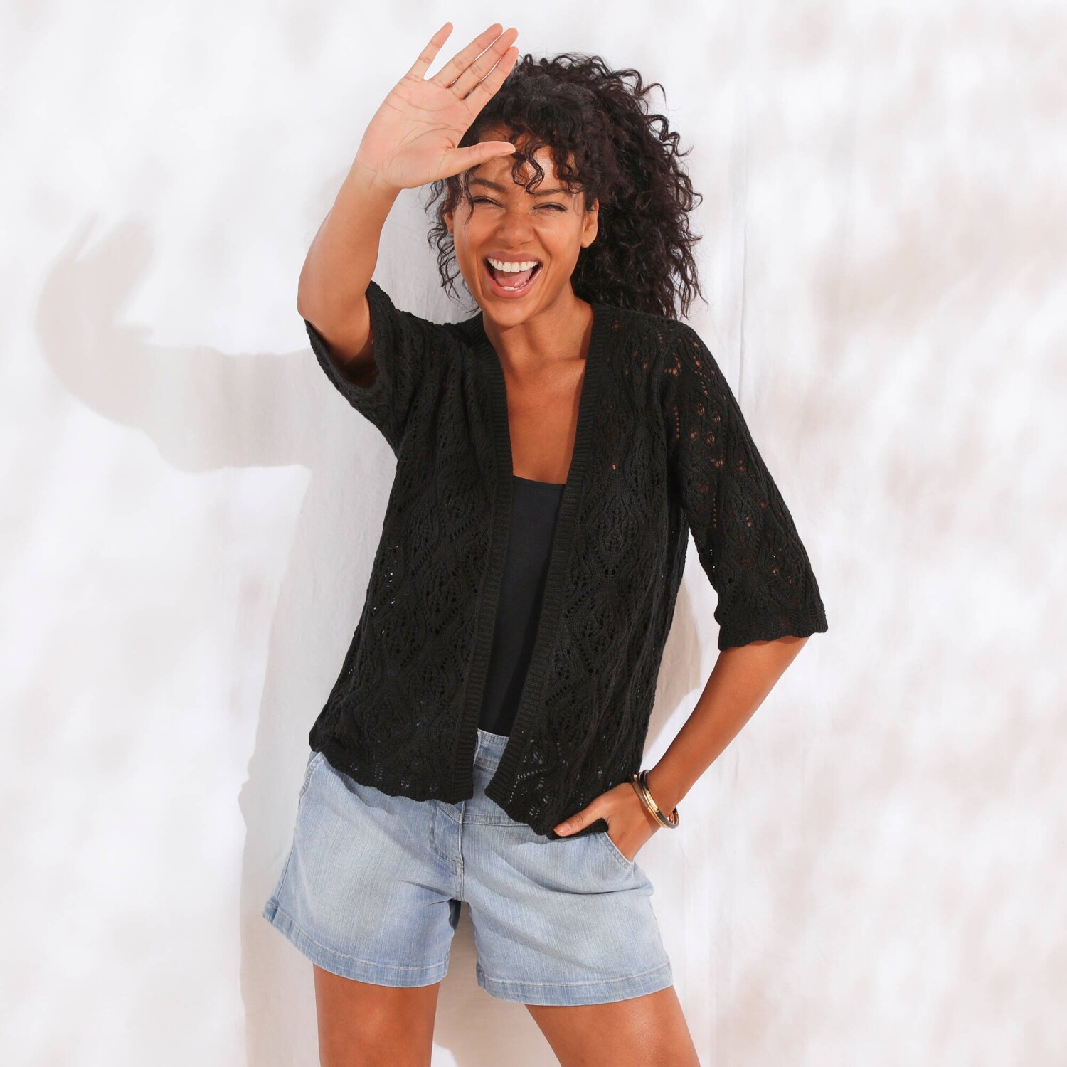 Sveter na zapínanie ľahko zladíte s obľúbenými džínsami, sukňou alebo košeľou. Okrúhly výstrih. Dlhé rukávy. Gombíky so vzhľadom rohoviny. 2 našité vrecká vpredu. Perličkový vzor. Možno prať v práčke.