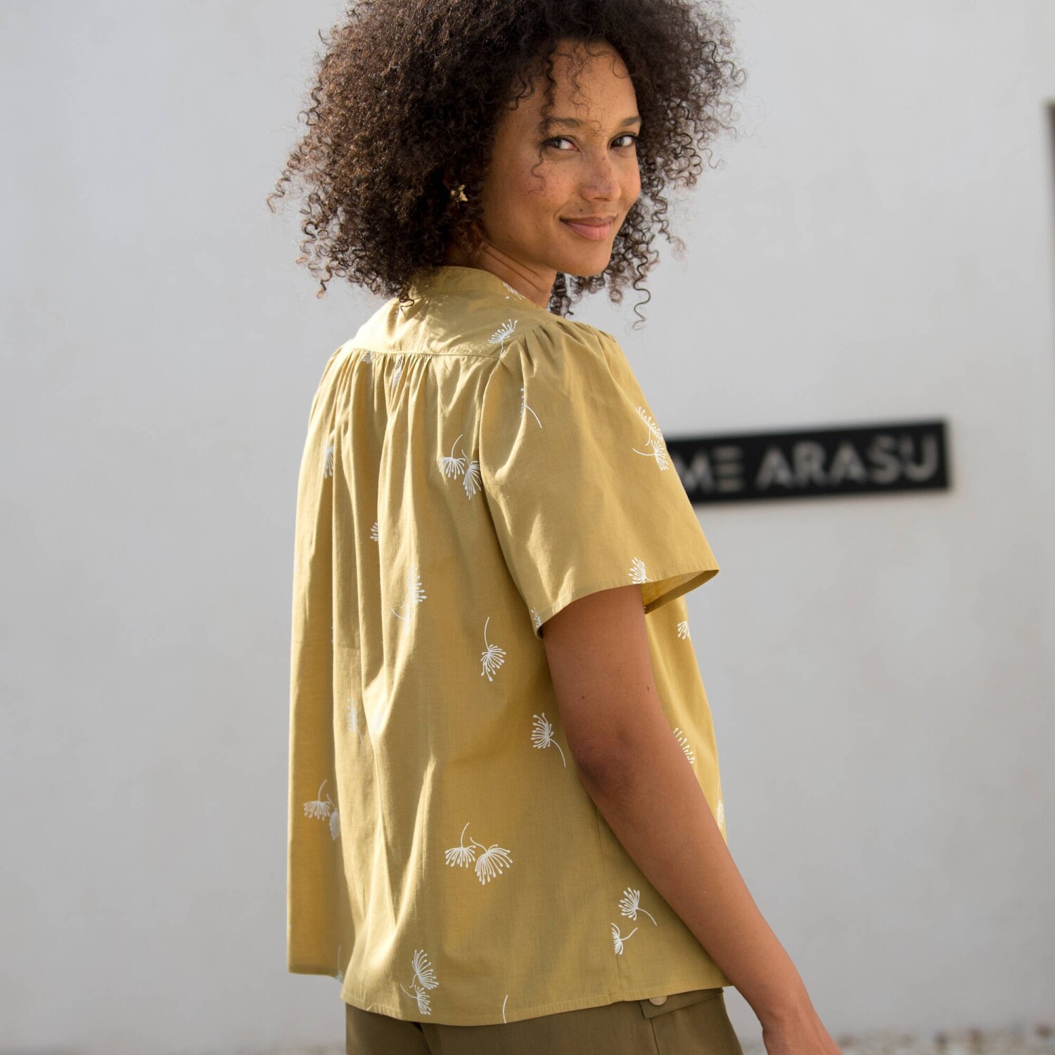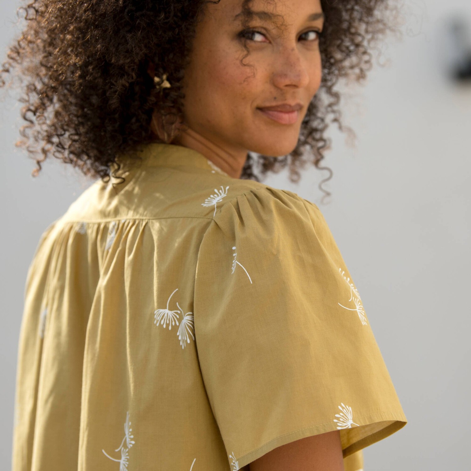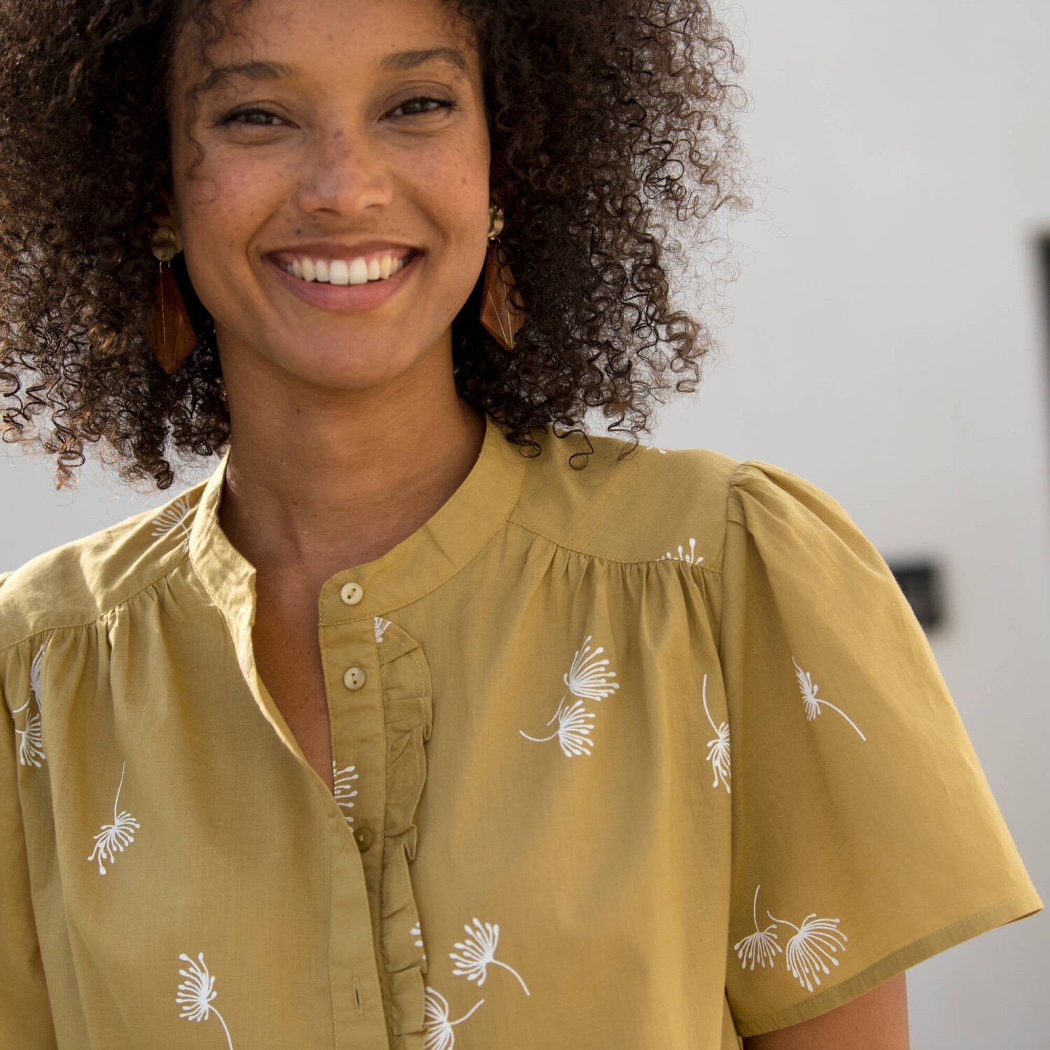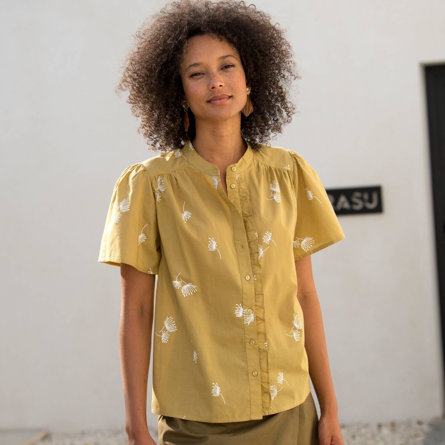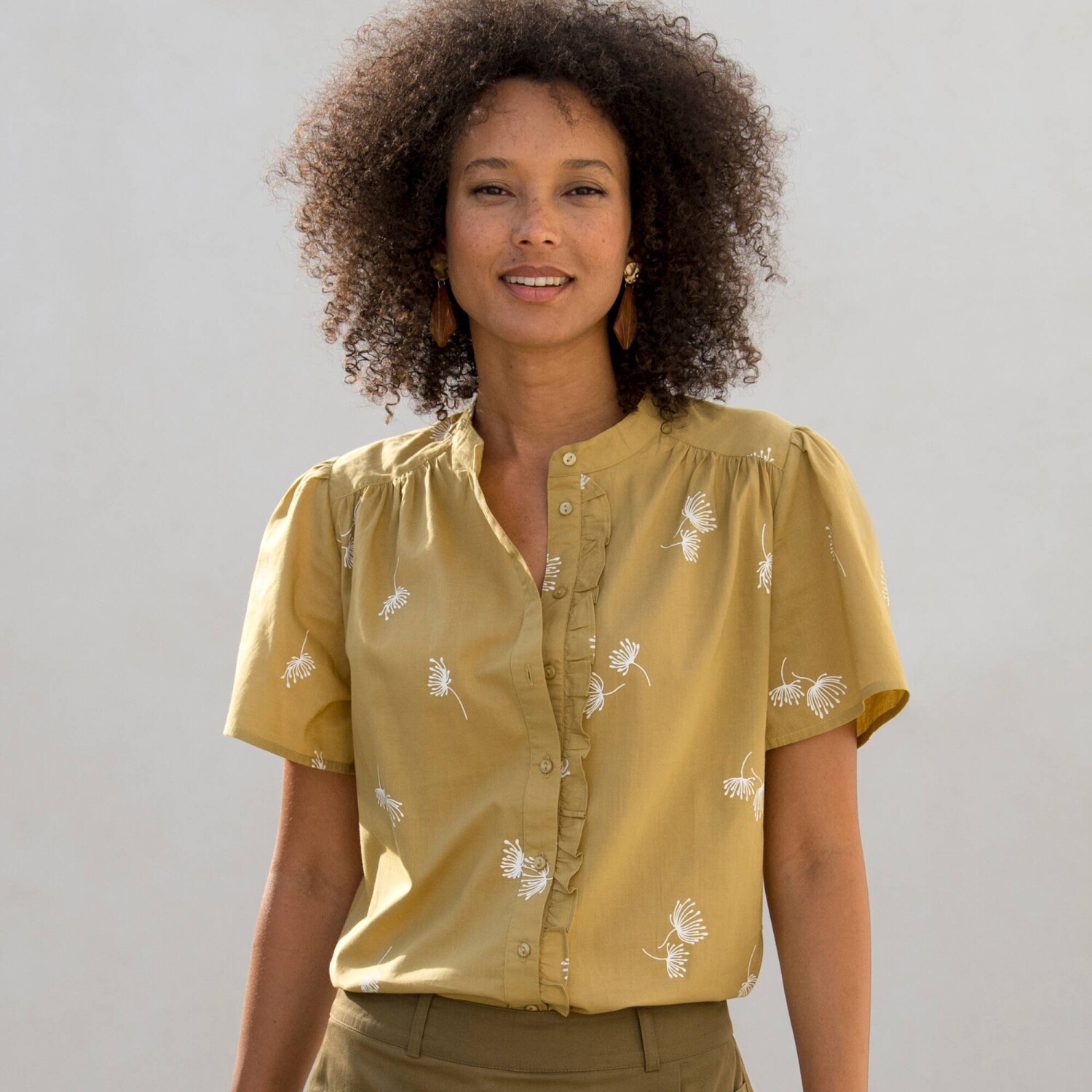 Blúzka s potlačou a výšivkou patrí medzi hviezdne kúsky sezóny! Z ľahkého krepónu. Okrúhly výstrih so zvlneným volánom. Pod výstrihom prestrih s gombíkmi a očkami. Dvojité sedlo s kvetinovou výšivkou vpredu + nariasenie. Dlhé široké volánové rukávy. Pružné konce rukávov. Rovný dolný lem. Možno prať v práčke.