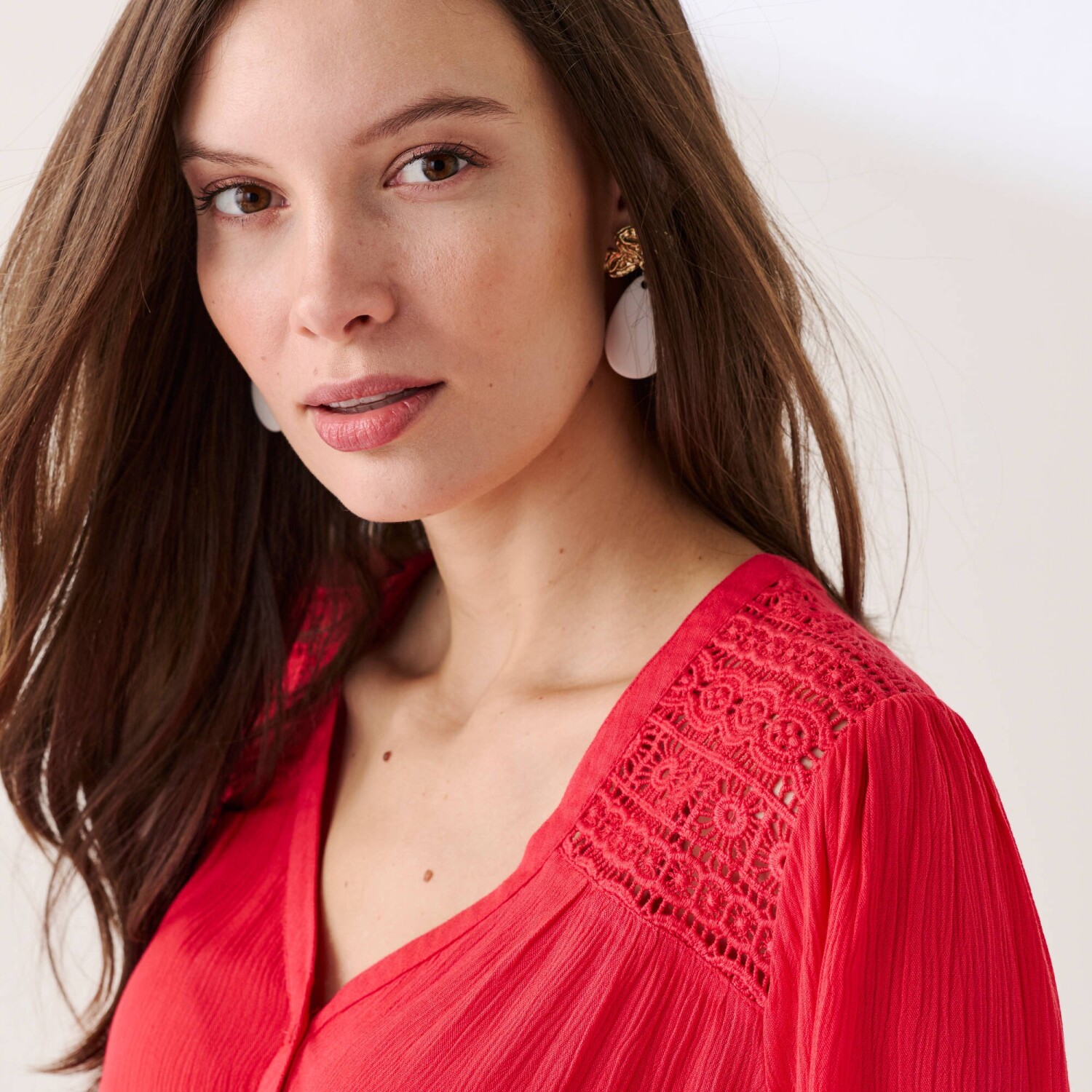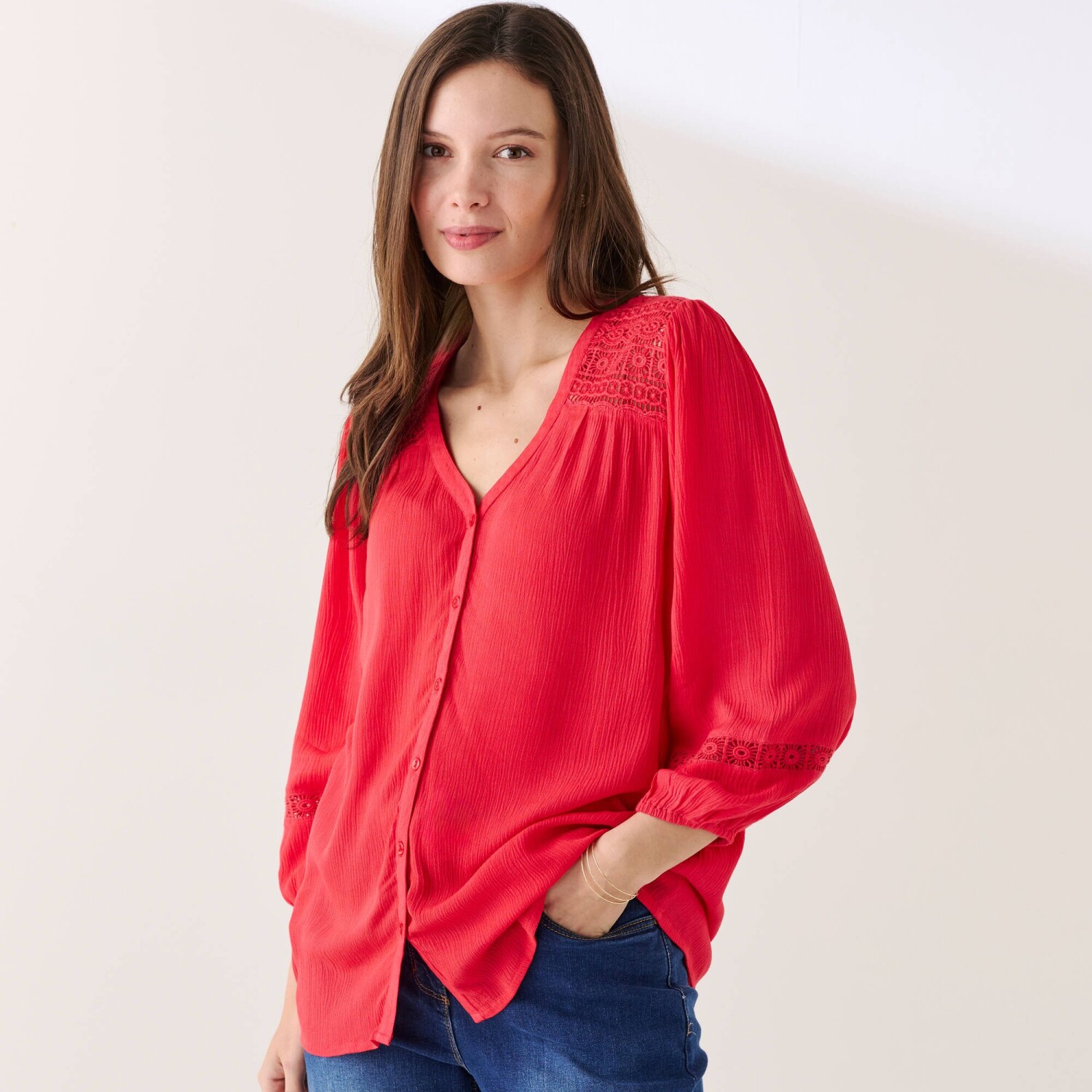 Nadčasová košeľová blúzka s potlačou XXL kvetín rozžiari Váš vzhľad. Bavlnený voál sa príjemne nosí. Rovný strih. Košeľový golier. Vpredu gombíková léga. Prsné záševky. Dlhé rukávy. Manžety na gombík. Vzadu sedlo a sklady. Oblý spodný lem. Možno prať v práčke.