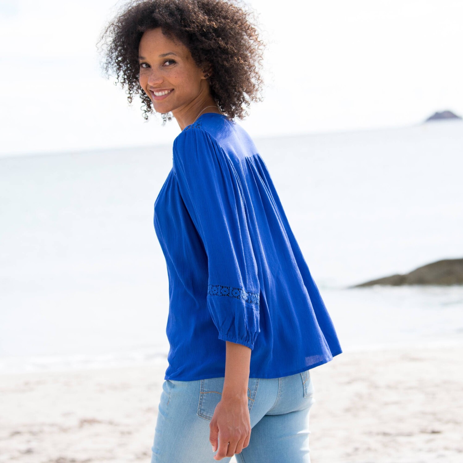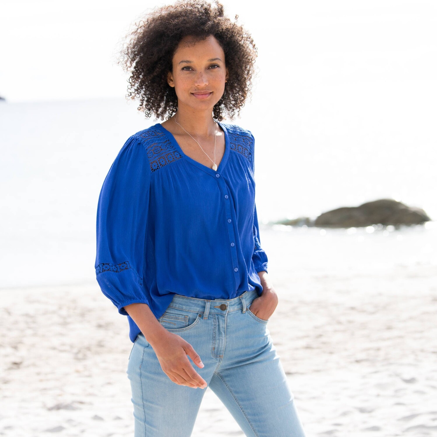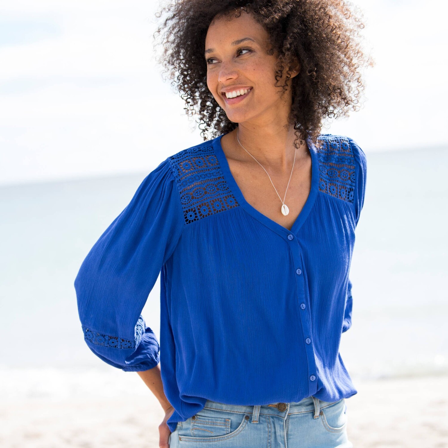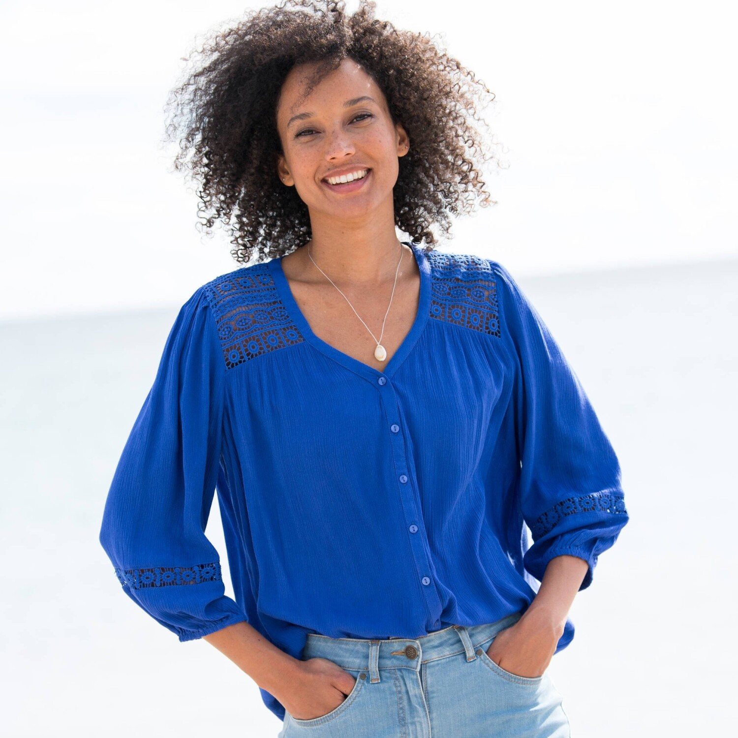 Šik a zvodná, jednofarebná blúzka s macramé zdobením nemá chybu. Výstrih do "V" s macramé pruhom a zvlneným zakončením, ktorý sa predlžuje až na spodný lem vpredu. Prsné záševky. Žabkované manžety. Rovný spodný lem. Spoločnosť Blancheporte zvolila recyklovaný polyester, čím prispieva k boju proti plytvaniu a podporuje zodpovednejšiu spotrebu, ktorá rešpektuje životné prostredie. Možno prať v práčke.