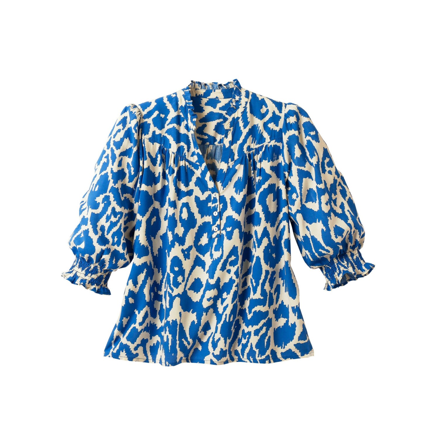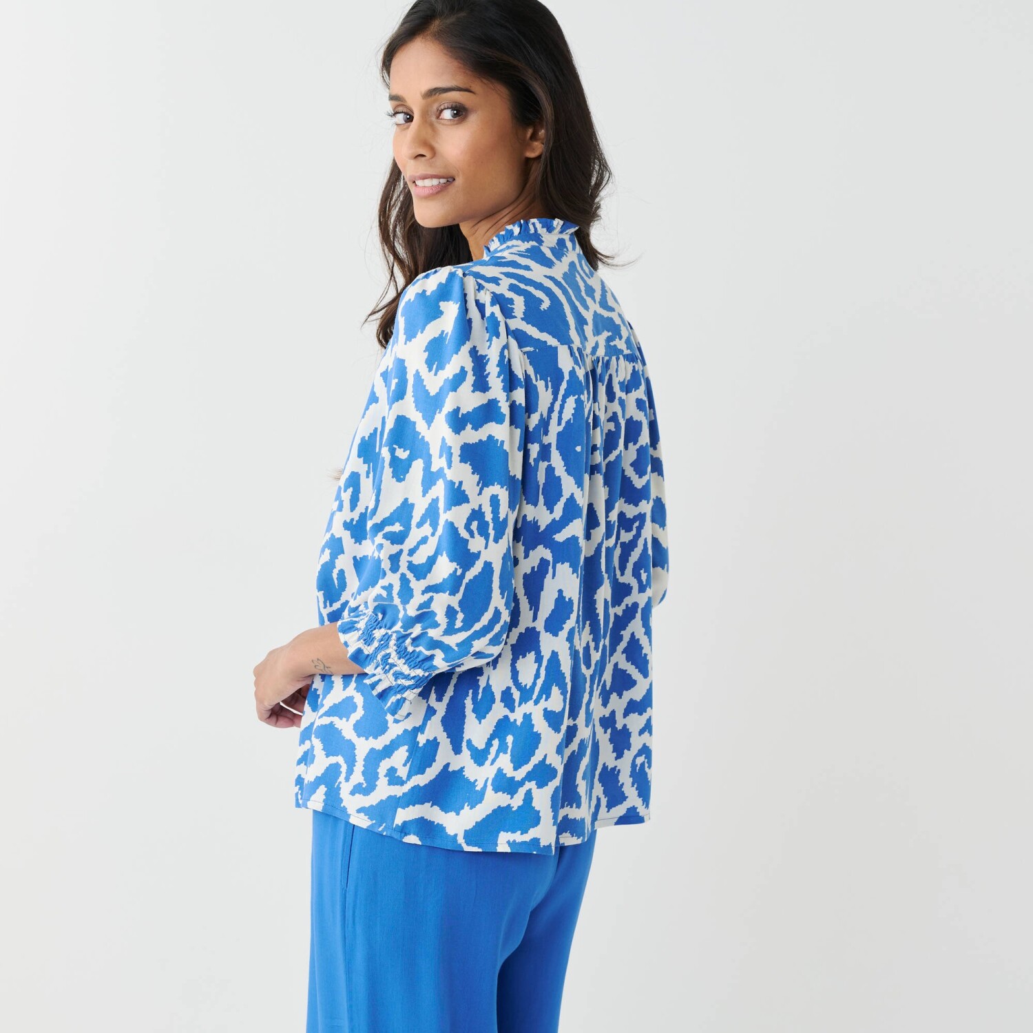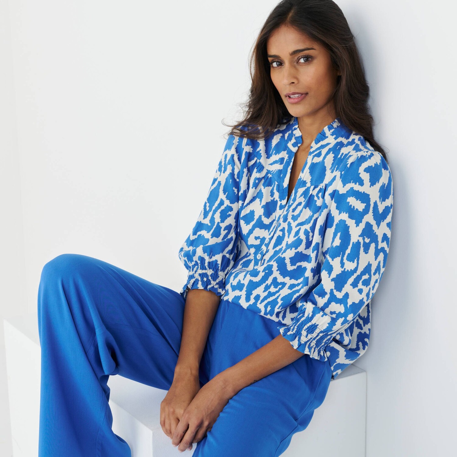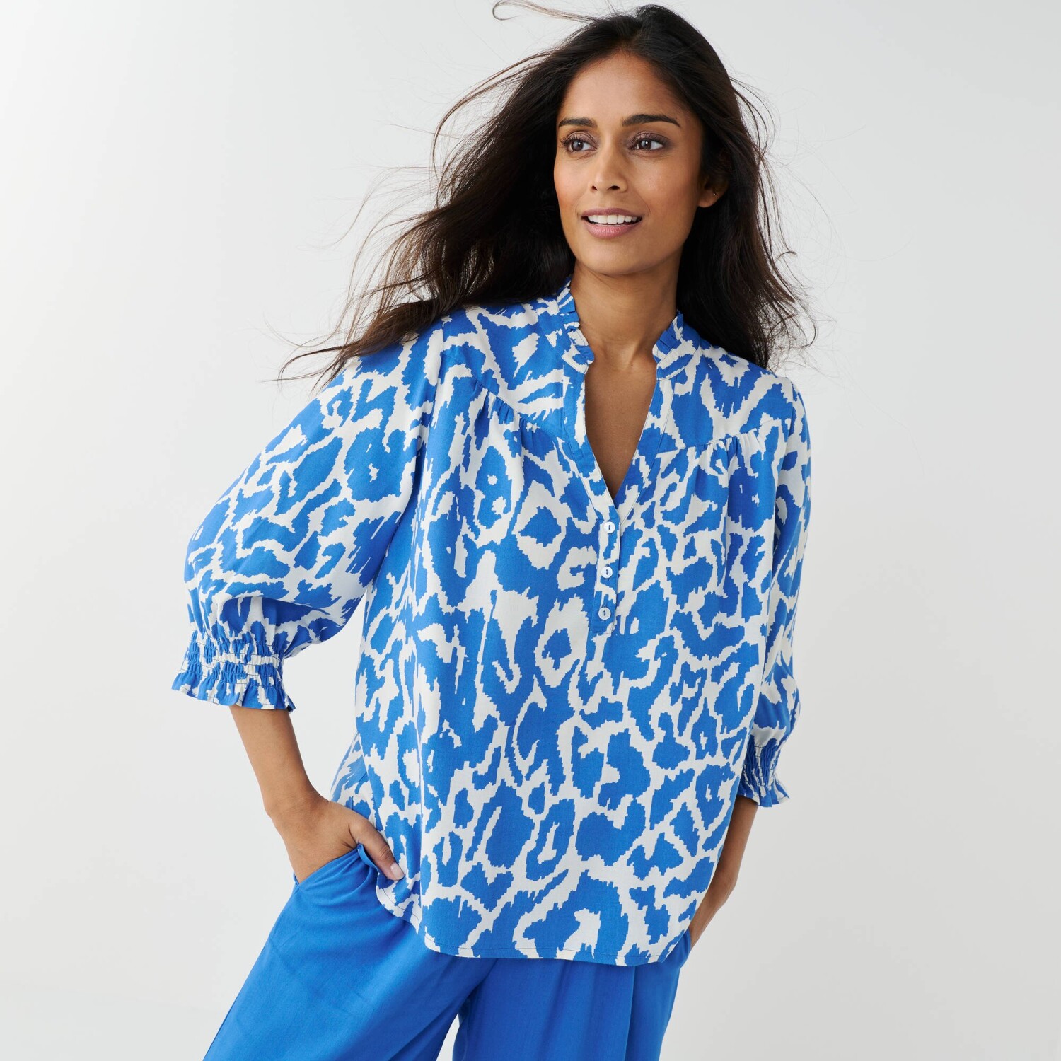 Štýlová, ľahučká a pohodlná. Tieto 3 slová najlepšie vystihujú módnu blúzku s potlačou bodiek. Zo vzdušného krepu sa príjemne nosí. Tuniský výstrih s prekrížením do "V". Pod výstrihom založený sklad. Dlhé rukávy s gombíkovým pútkom a 3/4 ohrnutím. Oblý spodný lem. Možno prať v práčke.