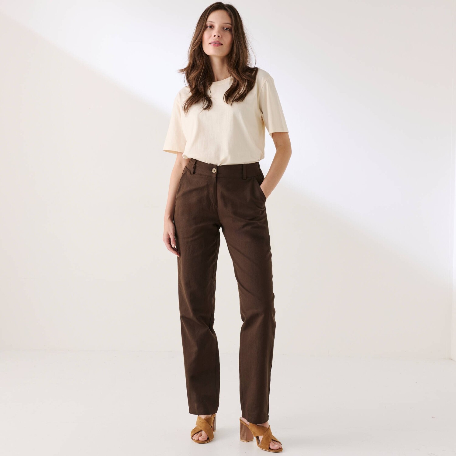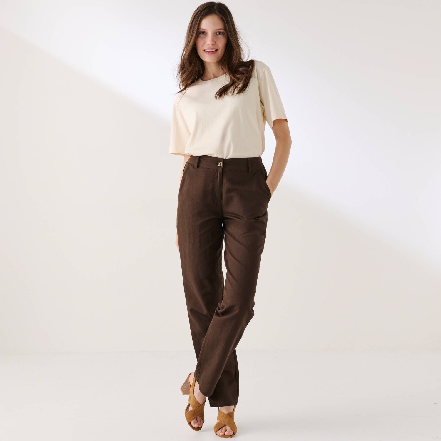 Jednoduchá údržba a príjemne sa nosia, to sú hlavné prednosti nohavíc v obľúbenom strihu chino. Navyše zo sviežej zmesi bavlny a ľanu. Strih chino (voľnejší na stehnách). Bežná výška pása. Tvarovaný pás s pútkami, vzadu pružný. Zapínanie na zips a gombík. 2 klinové vrecká. 2 falošné vrecká s paspulou vzadu. Možno prať na 30 °C.