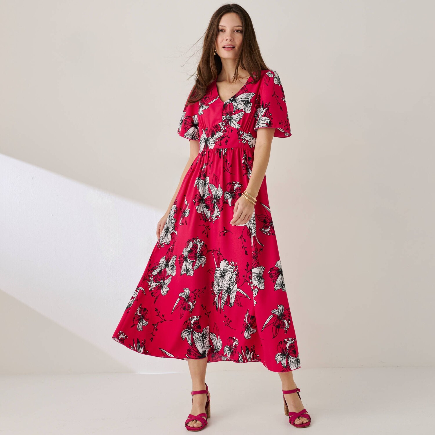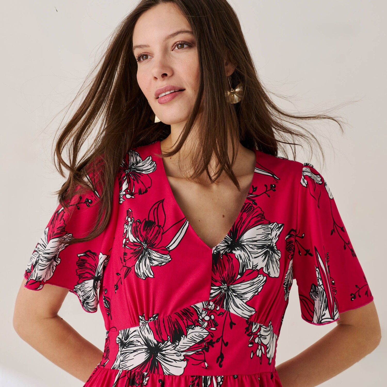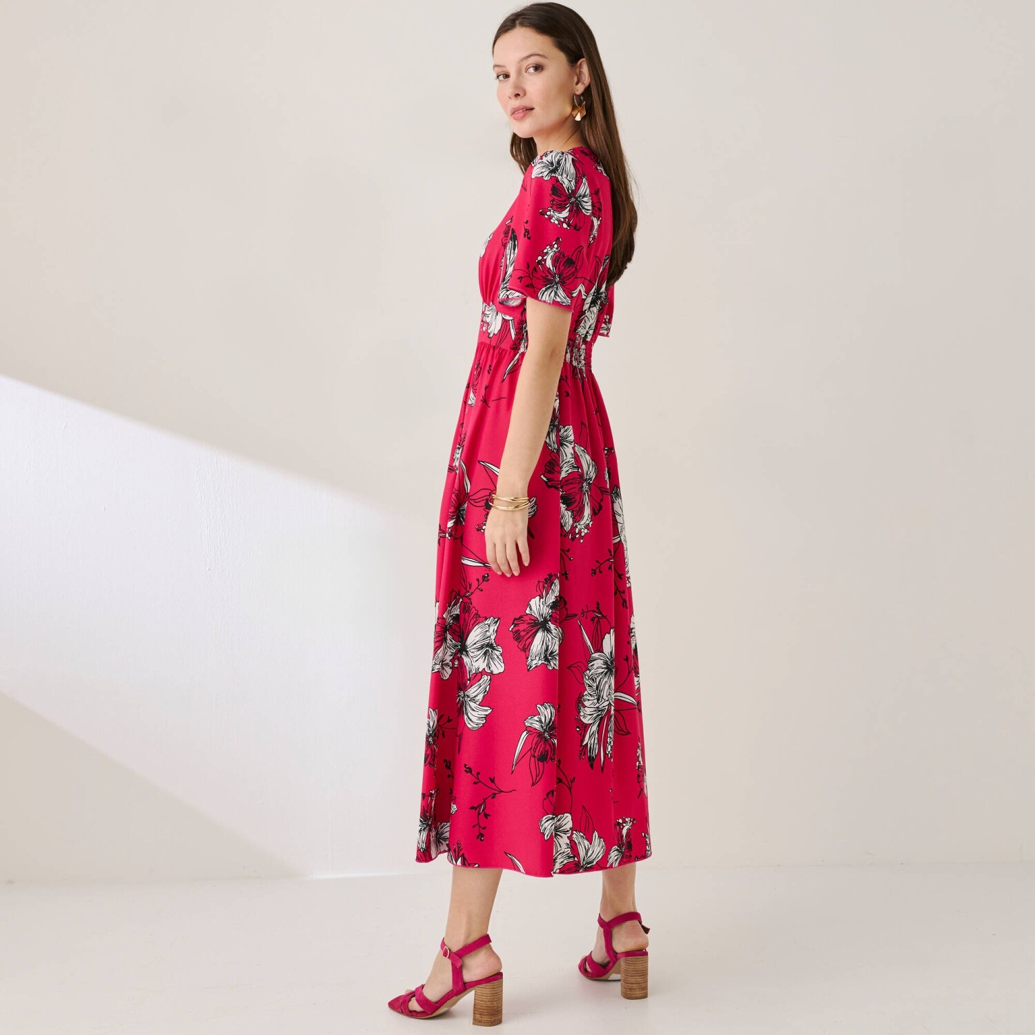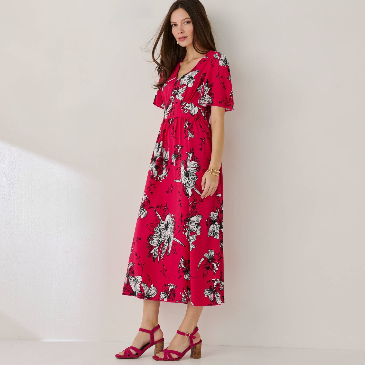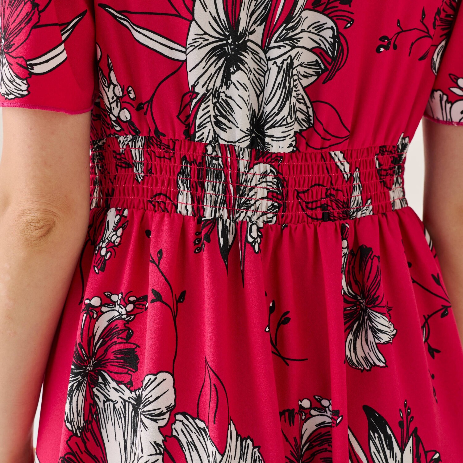 Kvetinový motív zdobí dlhé šaty s rozšírenými rukávmi. Výstrih do "V". Pod prsiami široký pás s ozdobnými potiahnutými gombíkmi. Vpredu oblý nariasený prestrih v páse. Žabkovaný pás vzadu. Rozšírené rukávy po lakte. Možno prať v práčke.