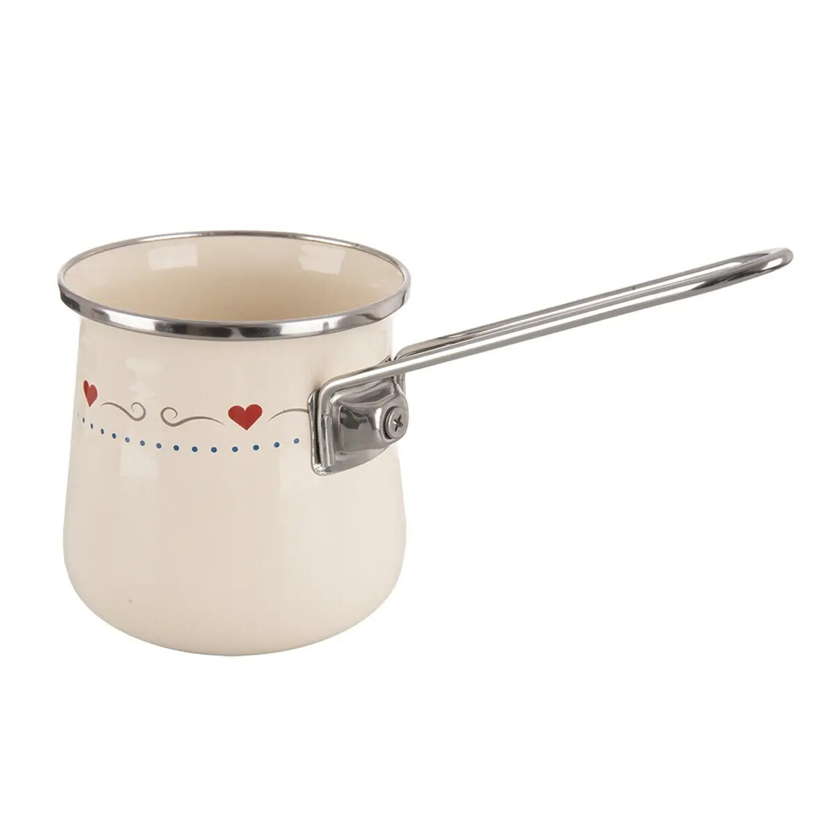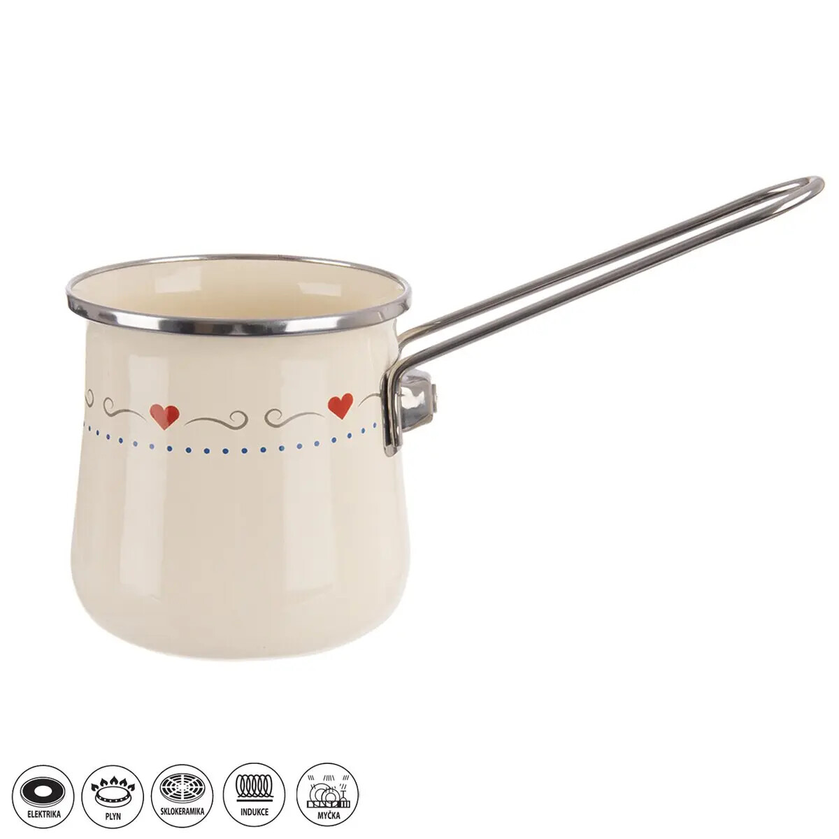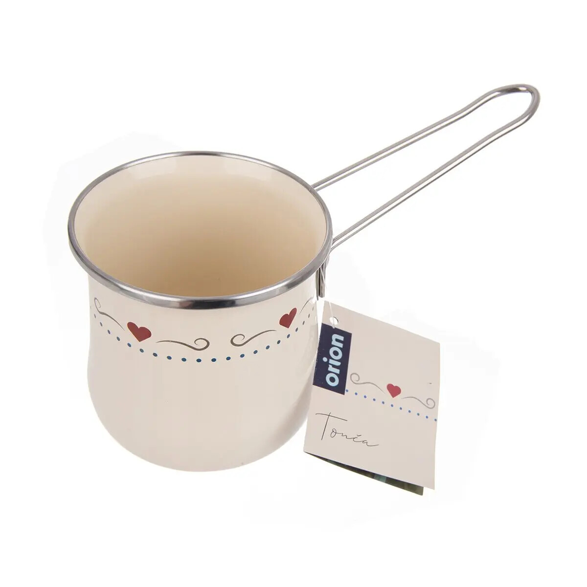 Smaltovaný riad ponúka možnosť zdravého varenia bez uvoľňovania nebezpečných a nežiaducich látok do jedál. Riad naakumuluje teplotu a dlho ju udrží. Vyznačuje sa dlhou životnosťou, zdravotnou nezávadnosťou pre alergikov, univerzálnym použitím. Sortiment smaltovaného riadu v prevedení TONČA dopĺňa nerezové kovanie. Džezva s rukoväťou je určená predovšetkým na varenie kávy. Je vhodná na všetky typy spotrebičov vrátane indukcie, do umývačky riadu. Nie je vhodná do MVT. Materiál: smaltovaný plech, kov (držadlo), nerez (lem). Rozmery: objem 0,6 l, priemer 10 cm, výška 10 cm.