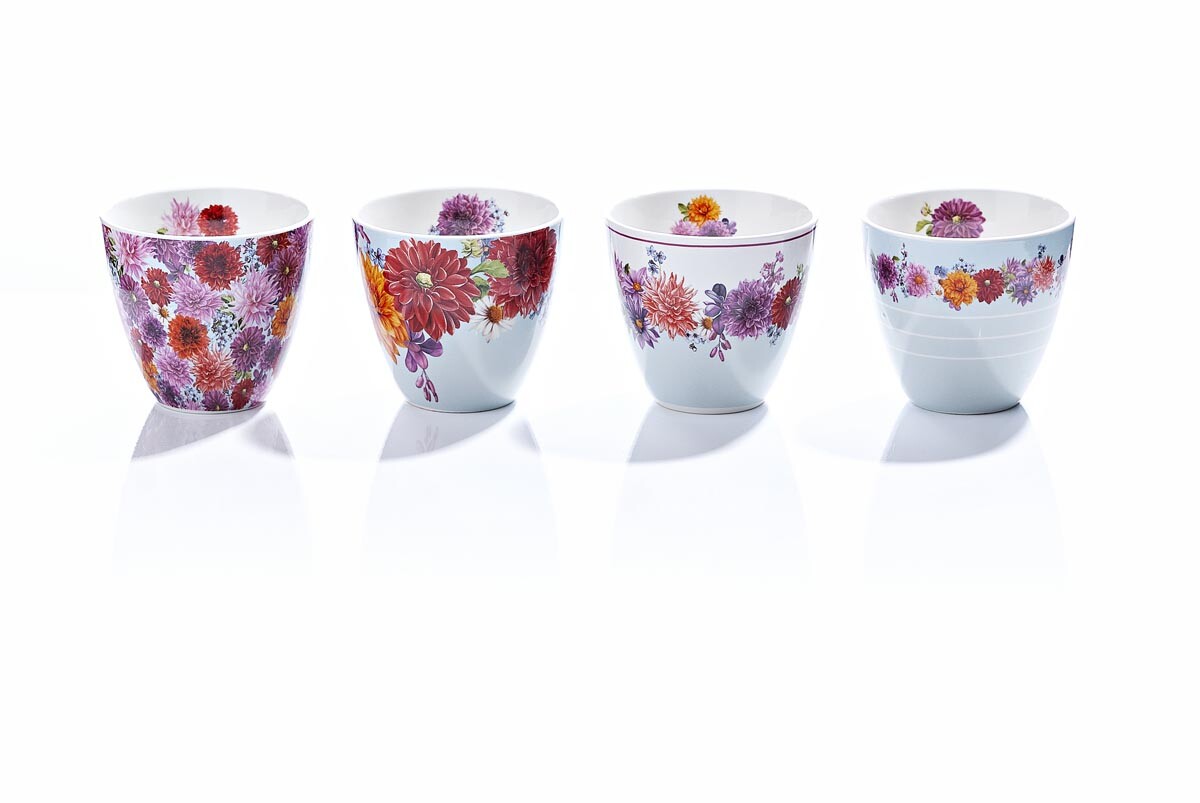 Väčšie hrnčeky z kvalitného porcelánu krásne zdobené tradičnými letnými kvetmi zvonku aj zvnútra. Sú ideálne na každodenné použitie, ale skrášlia aj slávnostný stôl. Je možné ich použiť v mikrovlnnej rúre aj umývať umývačke. Súprava obsahuje 4 hrnčeky bez ucha s objemom 350 ml. Materiál: porcelán. Rozmery: objem 4x 350 ml.