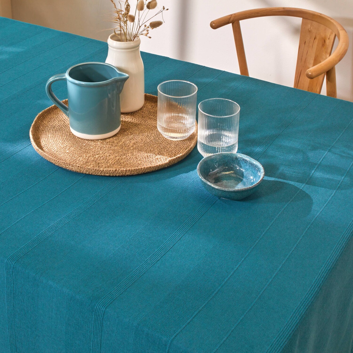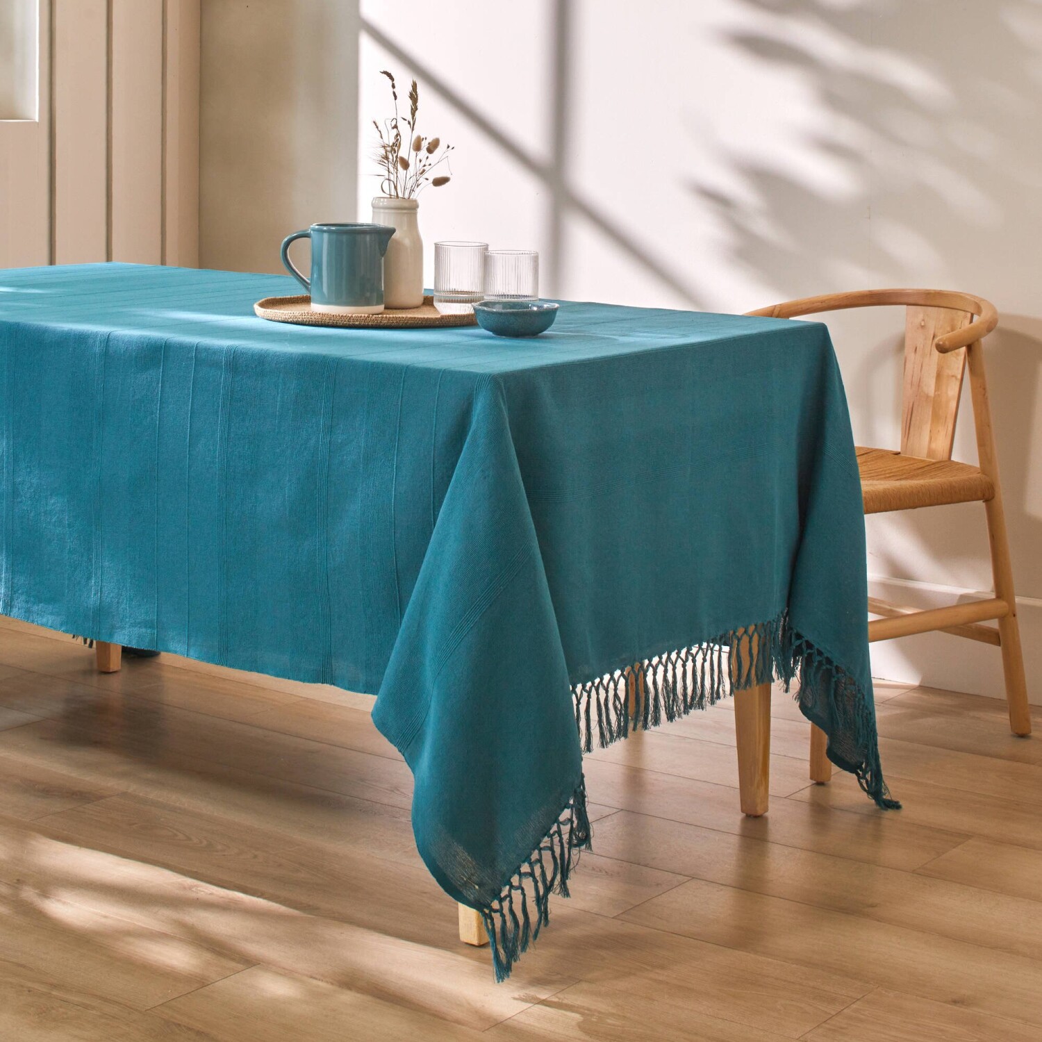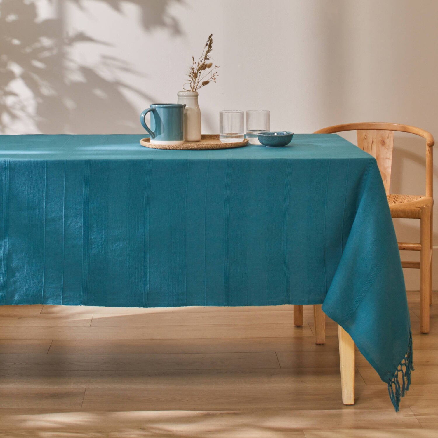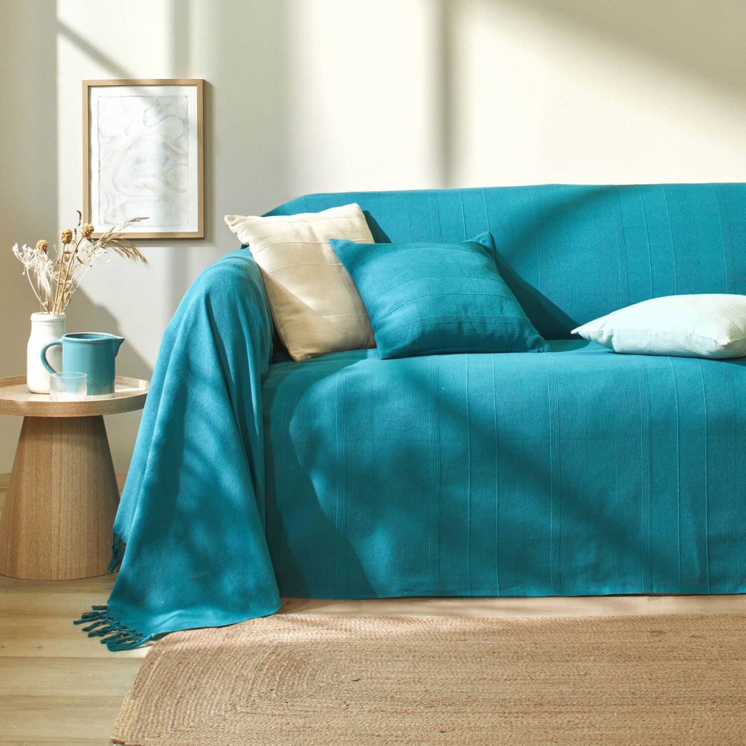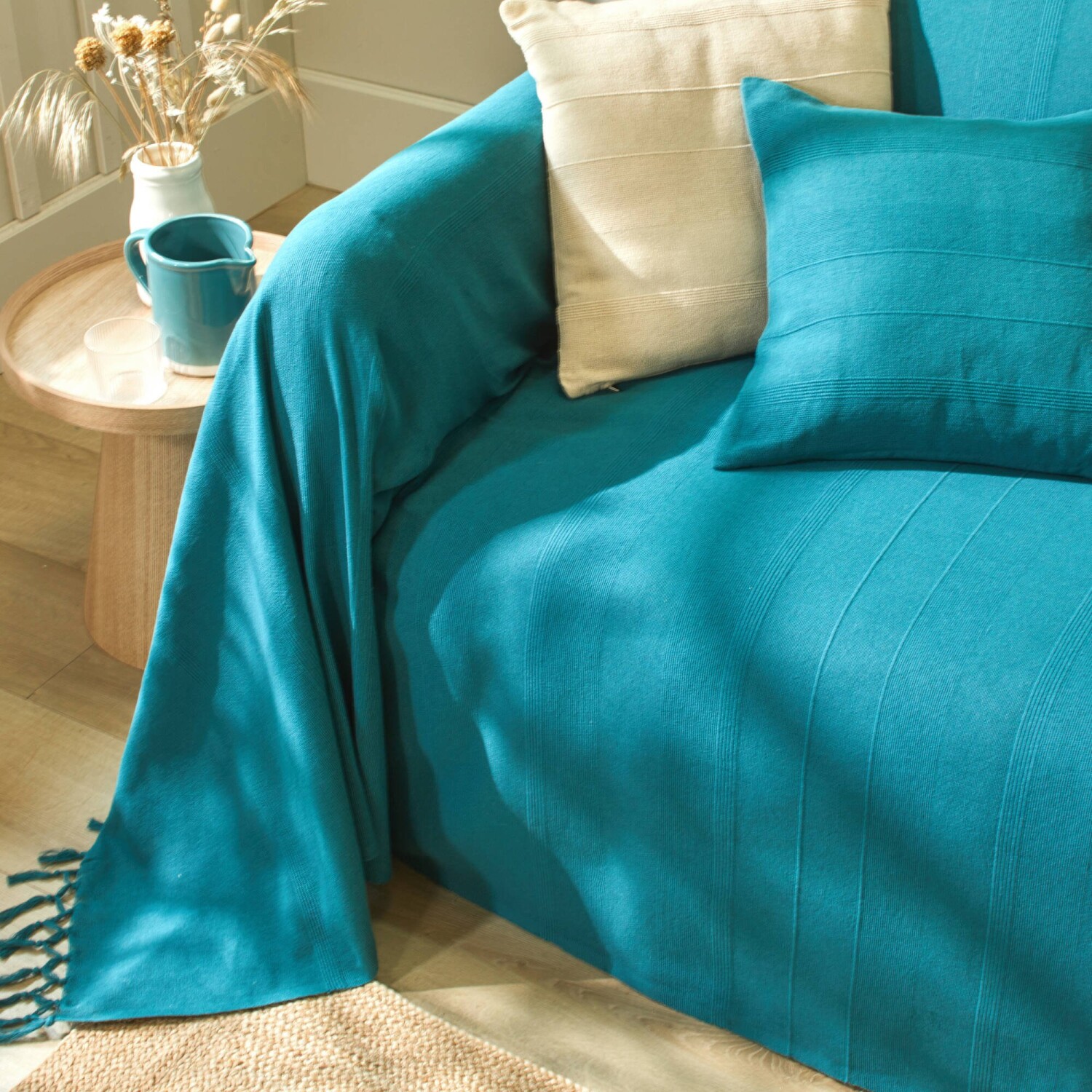 Pohrajte sa s farbami a zlaďte tento jednofarebný tkaný pléd s obliečkami na vankúš. Materiál s optickým efektom. Ručne viazané strapce na 2 stranách. Standard 100 by Oeko-Tex (n° CQ 1216/1 IFTH). Táto známka označuje textilné výrobky, ktoré boli podrobené laboratórnym testom na široké spektrum škodlivých látok a výrobok je bezpečný nad rámec platných noriem. Možno prať v práčke.