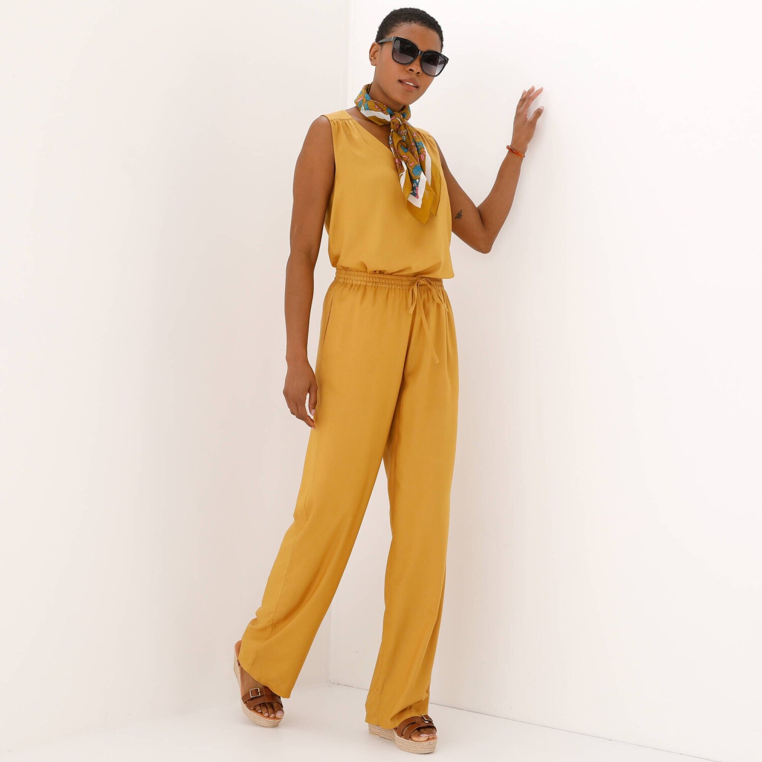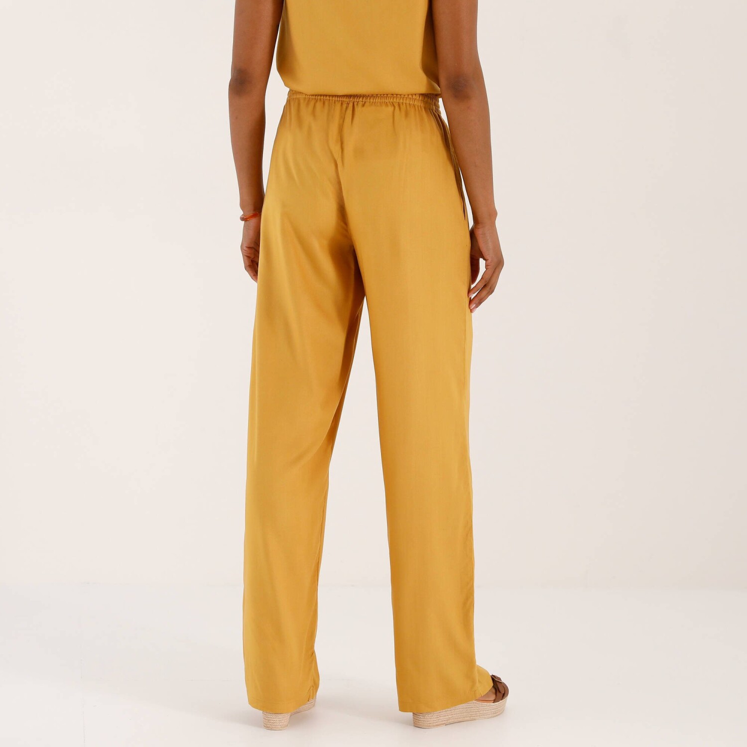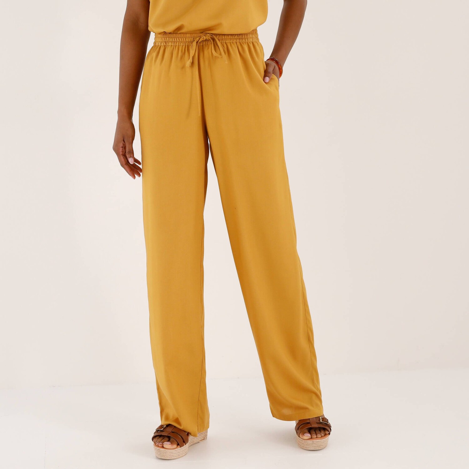 Žiadnej žene by v šatníku nemali chýbať široké nohavice. My Vám ich prinášame zo vzdušnej viskózy, ktorá sa príjemne nosí. Široký strih. Bežná výška pása. Pružný pás so šnúrkou na zaviazanie umožní pohodlie na mieru. 2 vrecká v bočných švoch. Široké nohavice zakončené lemom. Možno prať v práčke.
