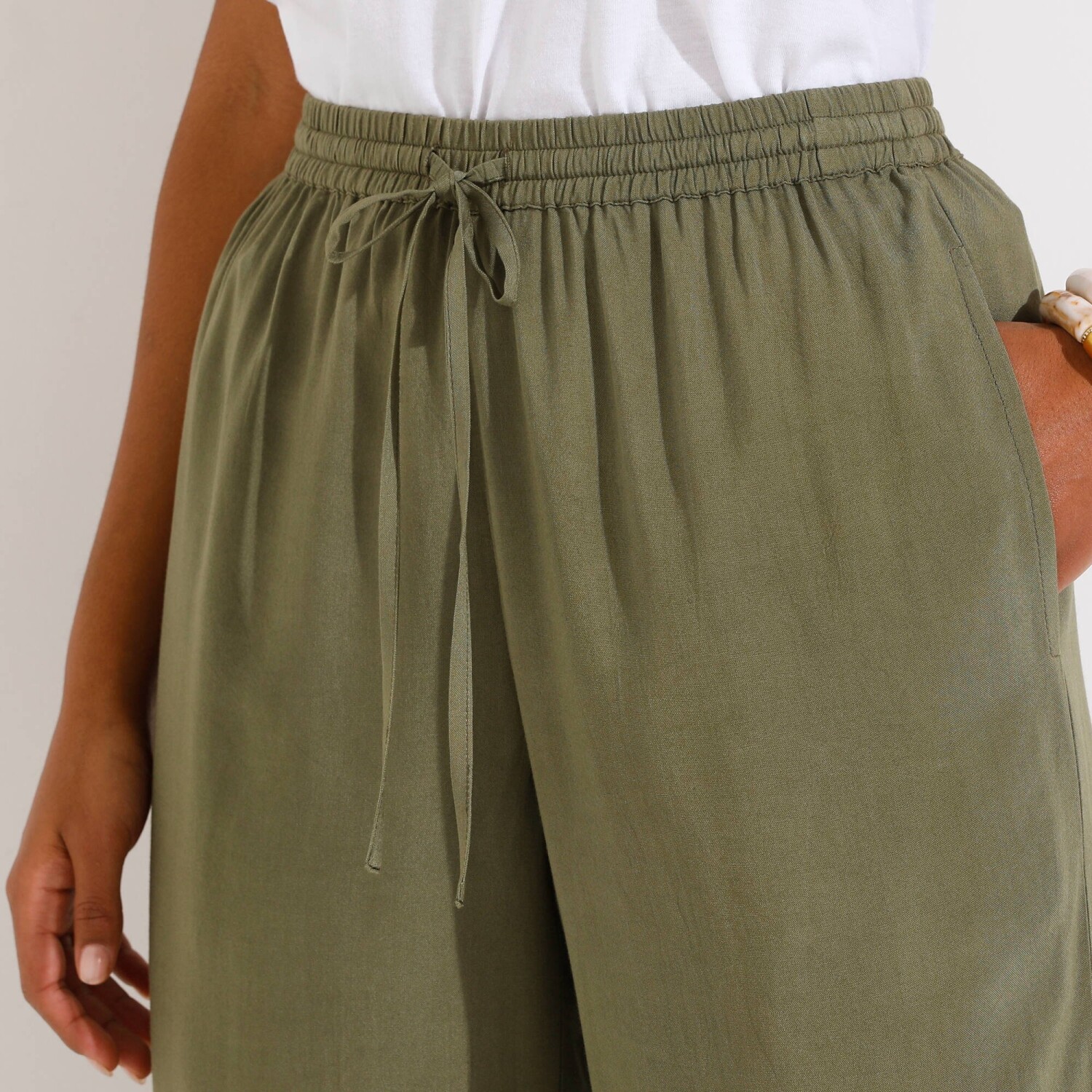 Elegantné nohavice so širokýmm strihom a krásnym plisovaním je radosť nosiť! Vzdušný plisovaný úplet. Bežná výška pása. Pružný pás. Široký strih dodá absolútne pohodlie. Jednoduchá údržba. Možno prať v práčke.