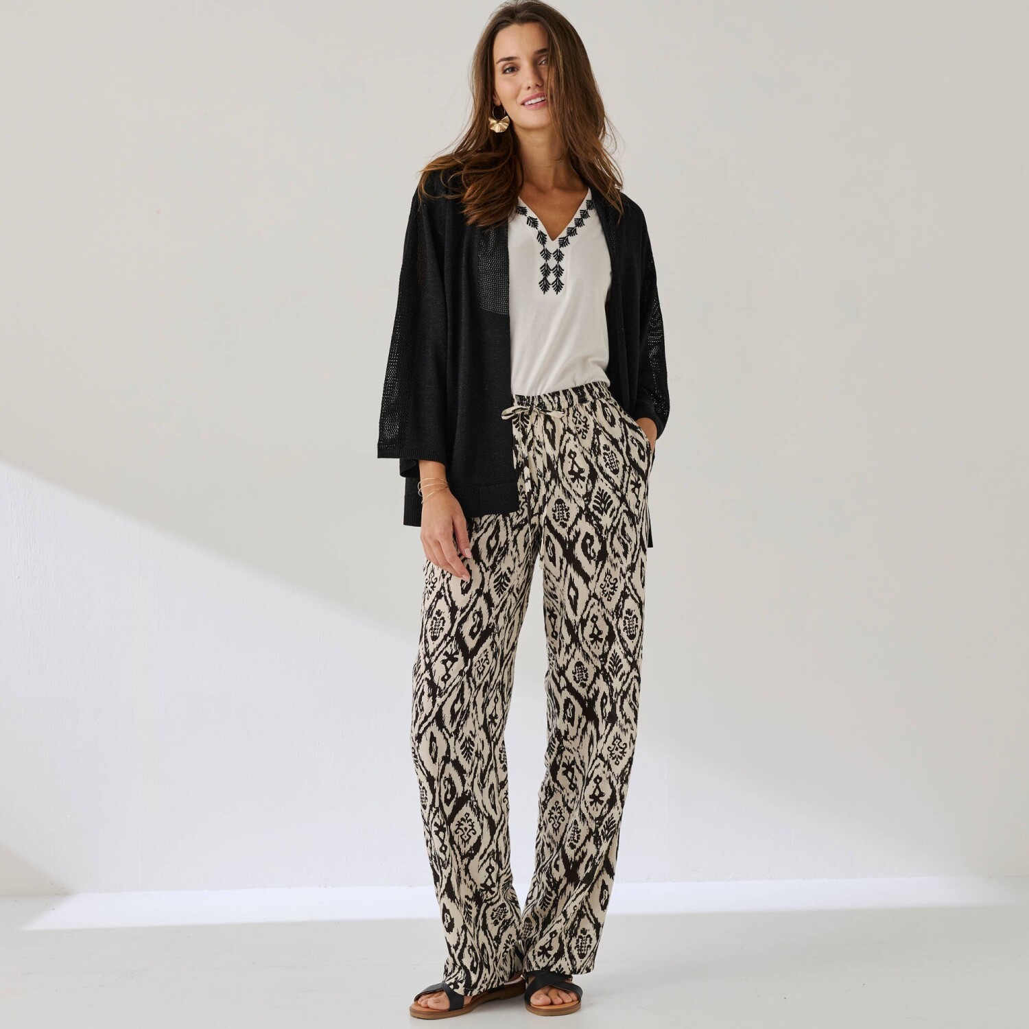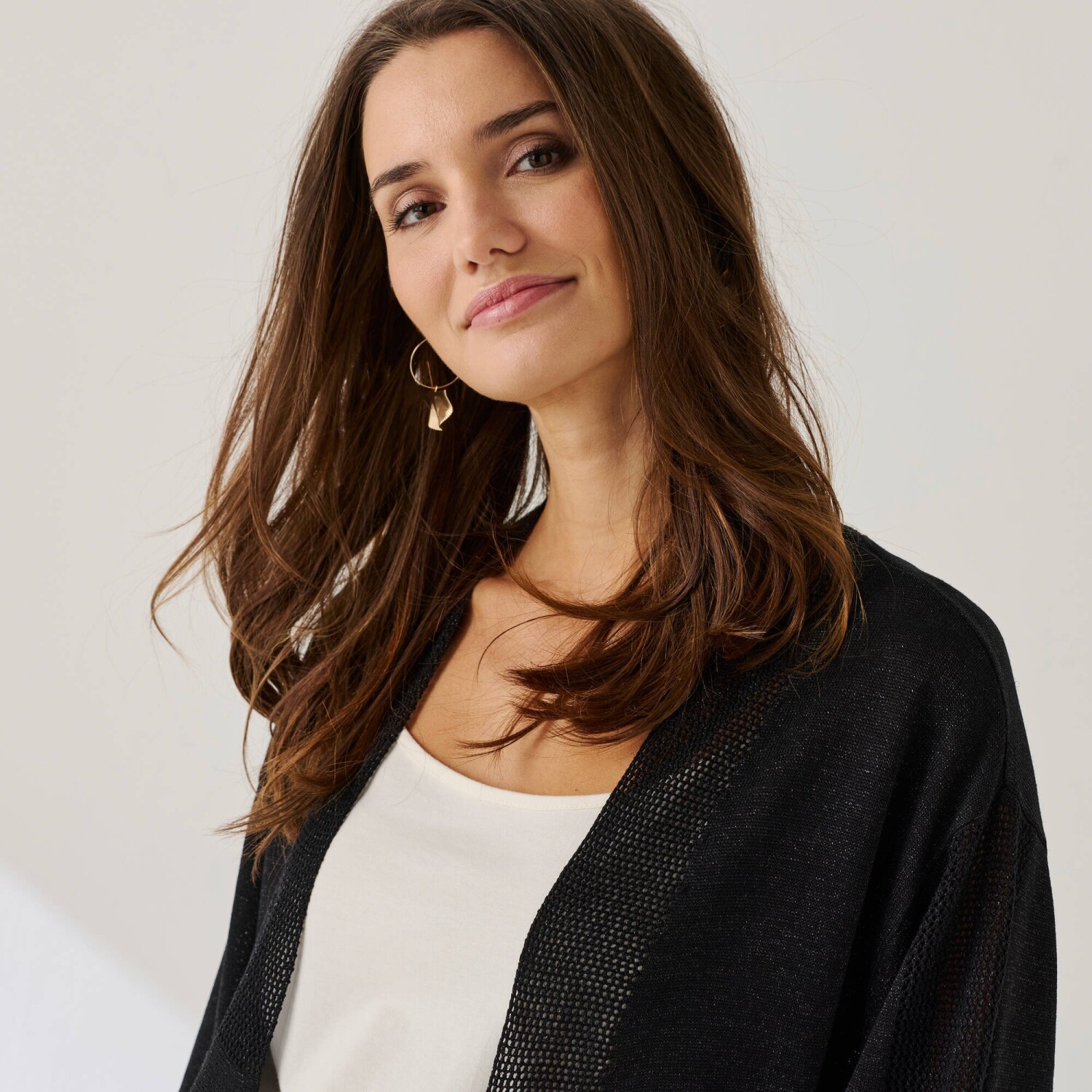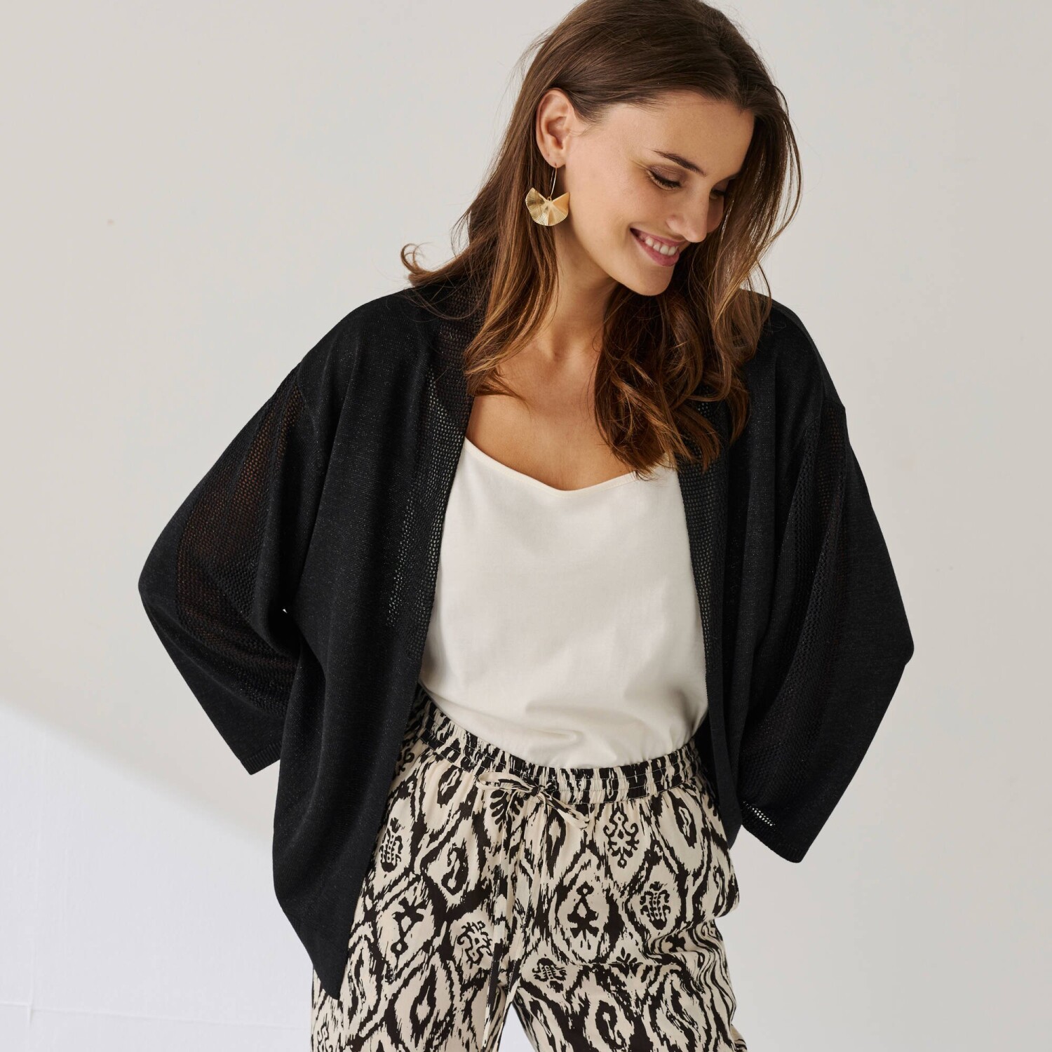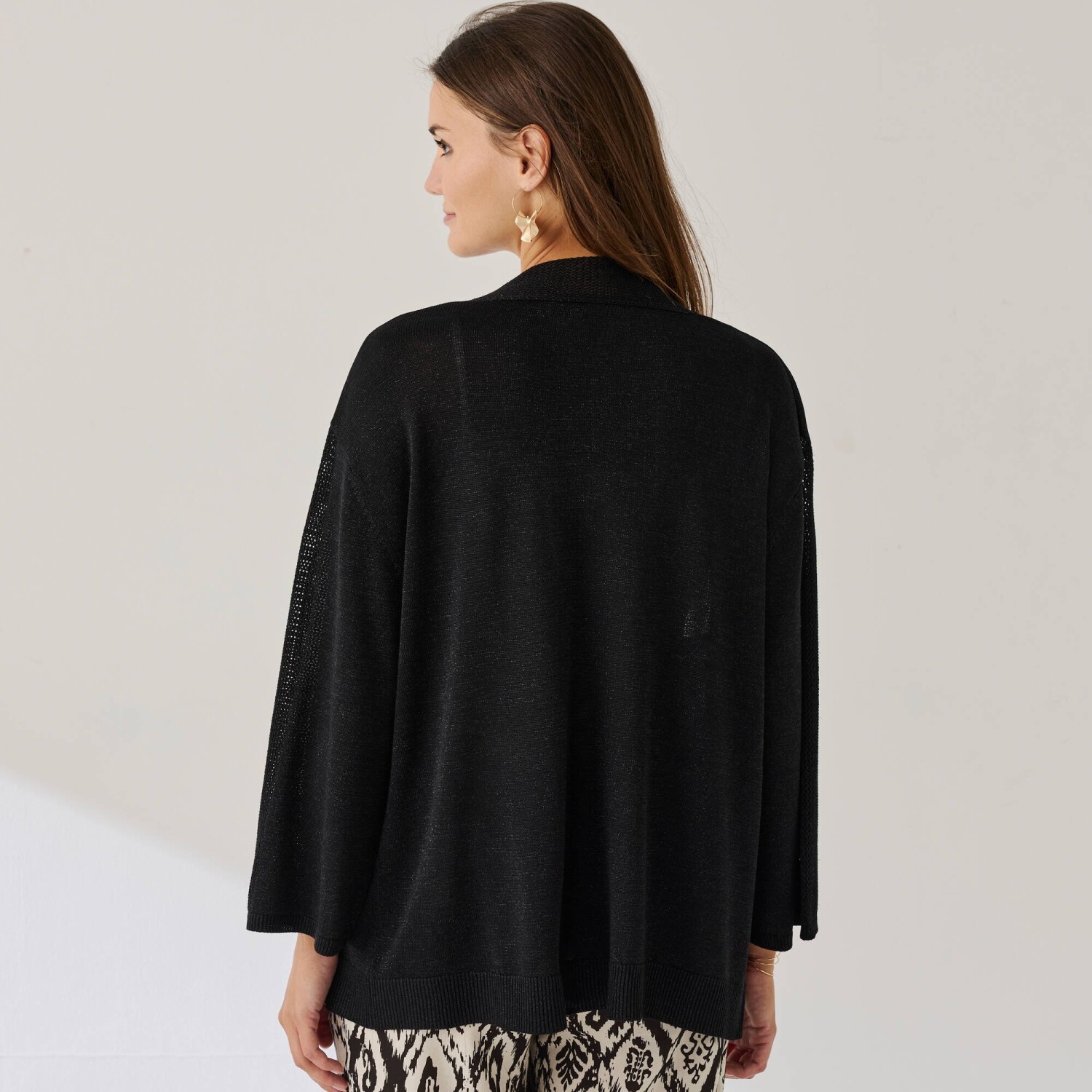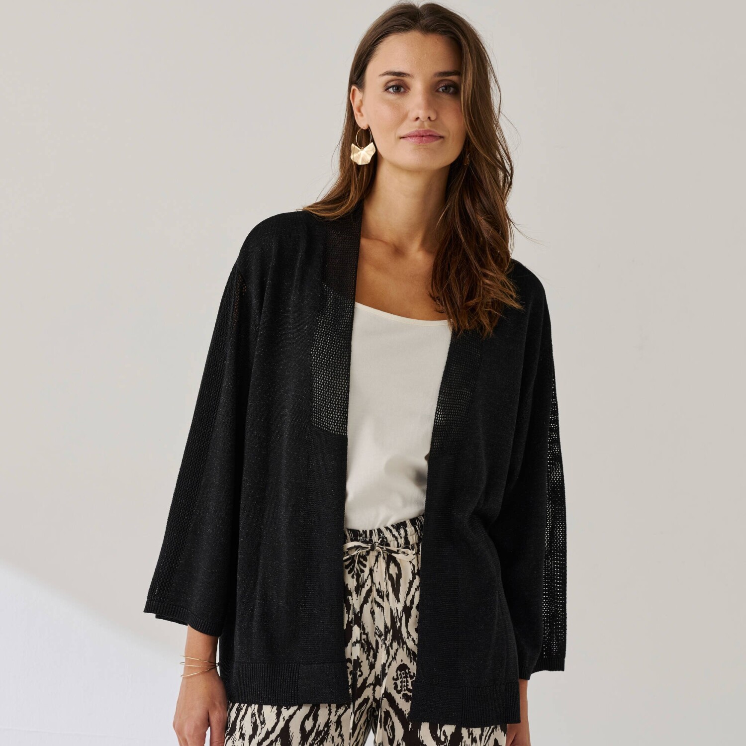 Nechajte sa očariť kardiganom s trbletom a 3/4 rukávmi. Voľný strih. Výstrih do "V". 3/4 rukávy, raglánové prieramky, rolované zakončenie. Ažúrový detail uprostred rukávov. Rovný dolný lem s vrúbkovaním 1x1. Možno prať v práčke.