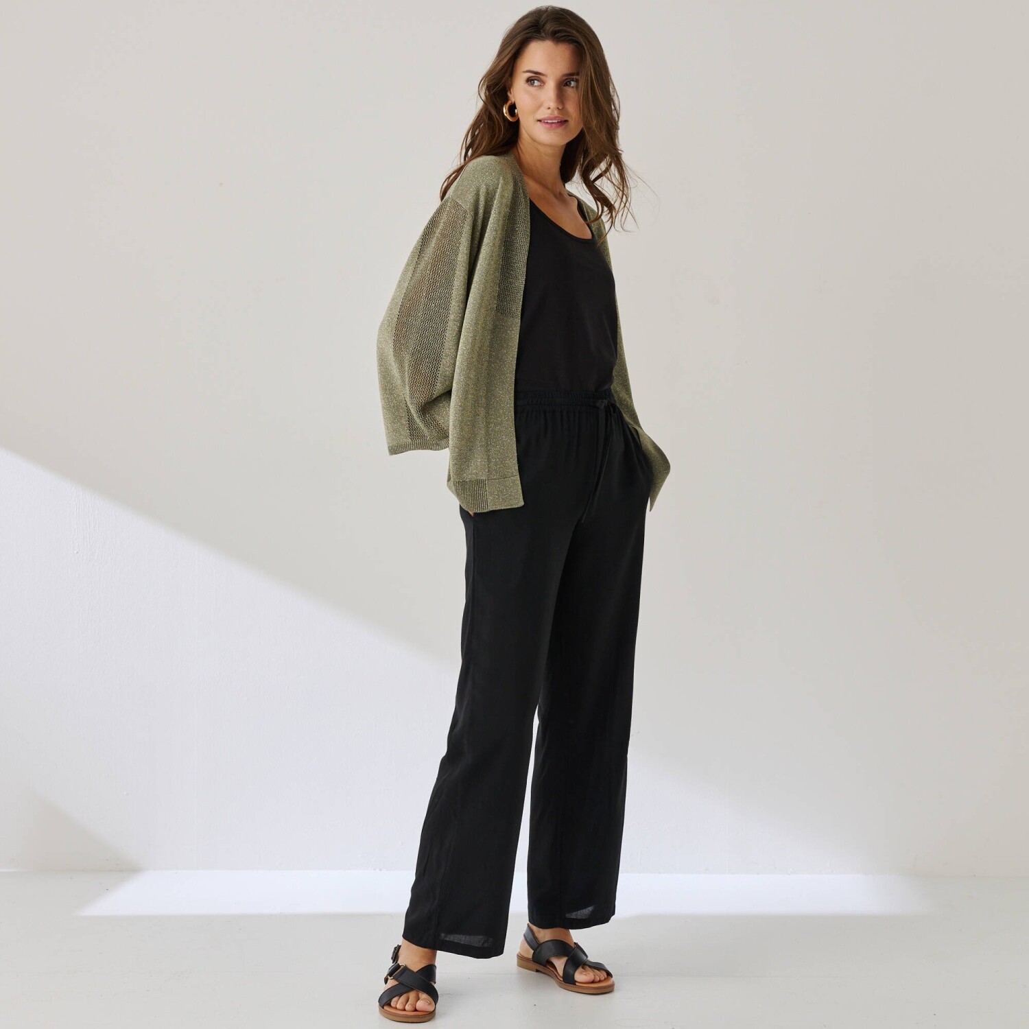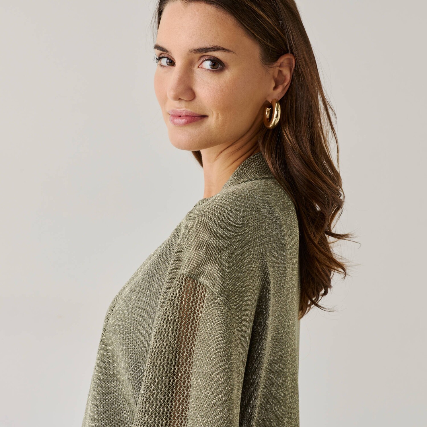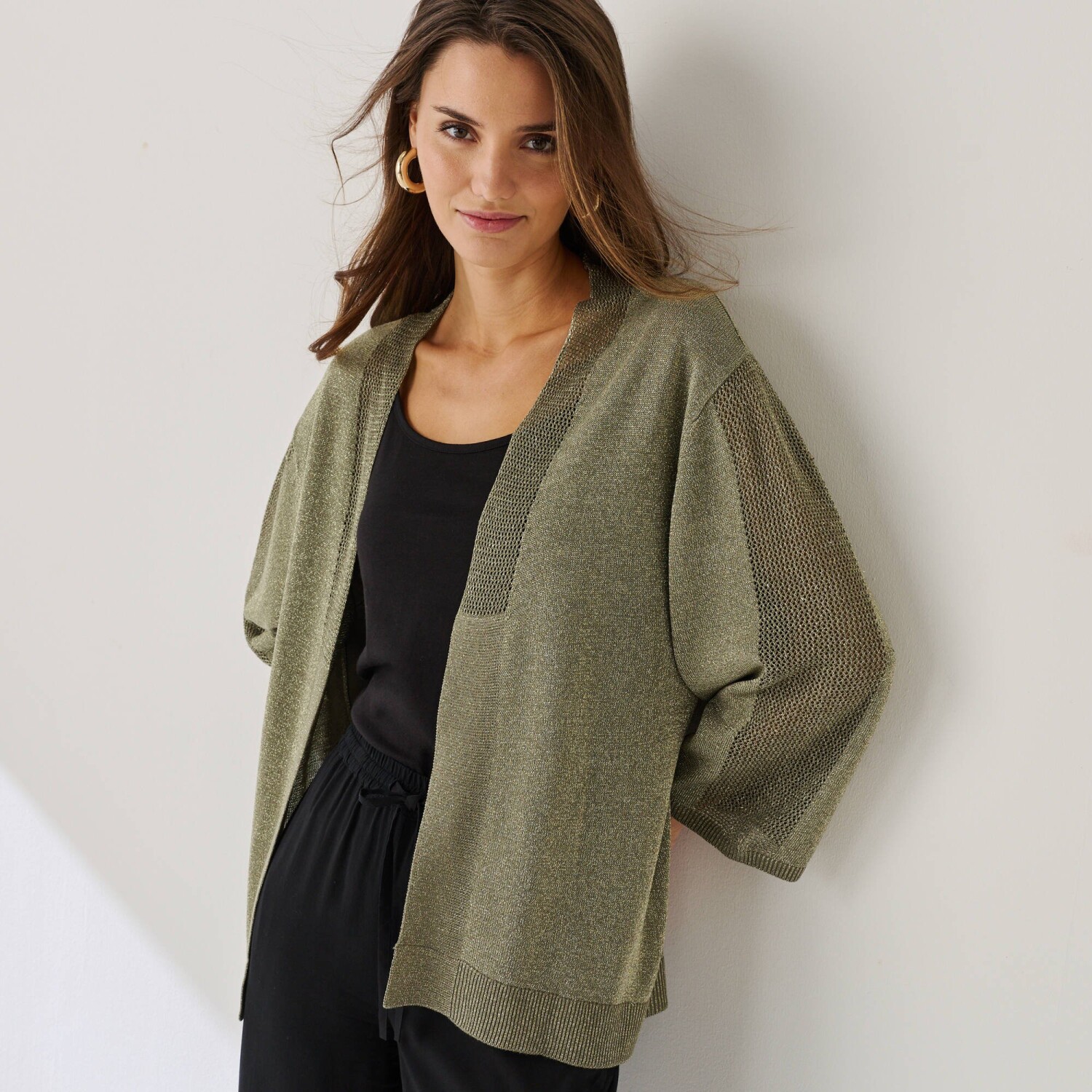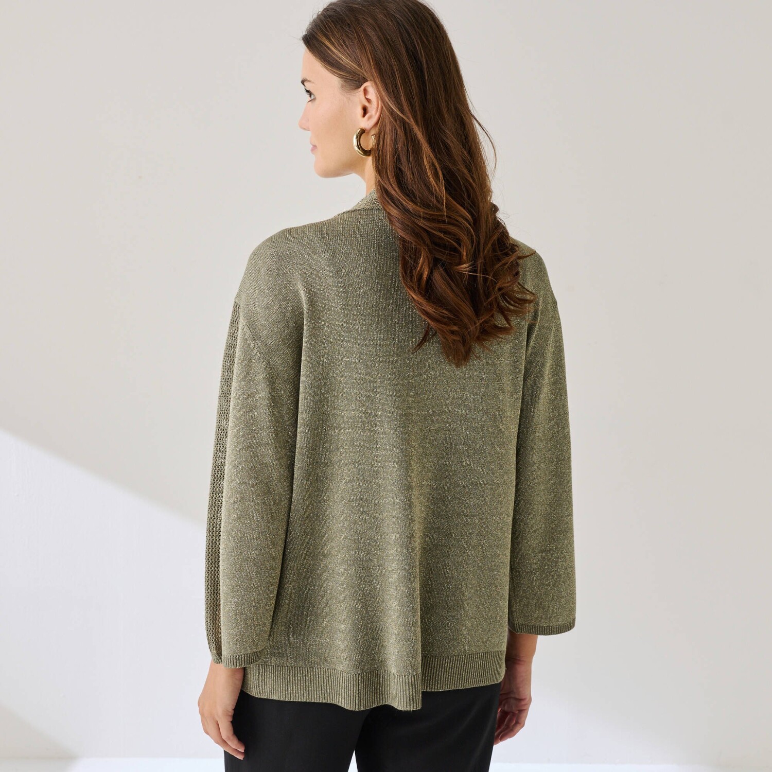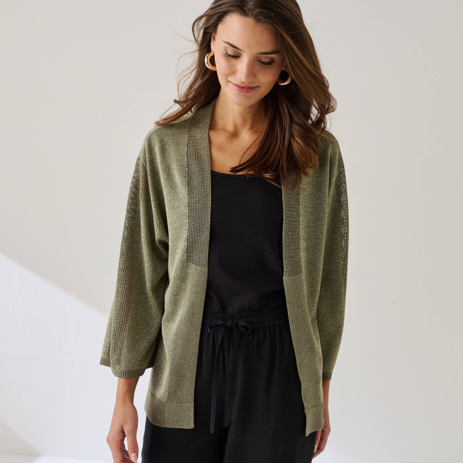 Nechajte sa očariť kardiganom s trbletom a 3/4 rukávmi. Voľný strih. Výstrih do "V". 3/4 rukávy, raglánové prieramky, rolované zakončenie. Ažúrový detail uprostred rukávov. Rovný dolný lem s vrúbkovaním 1x1. Možno prať v práčke.
