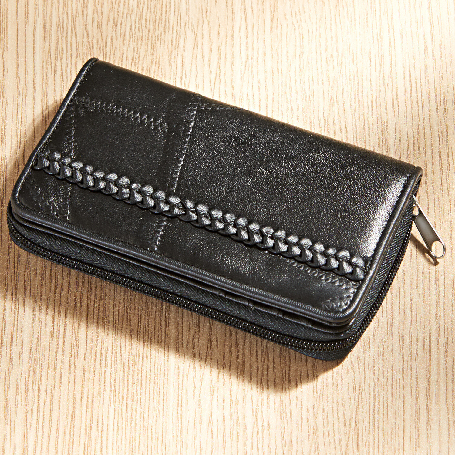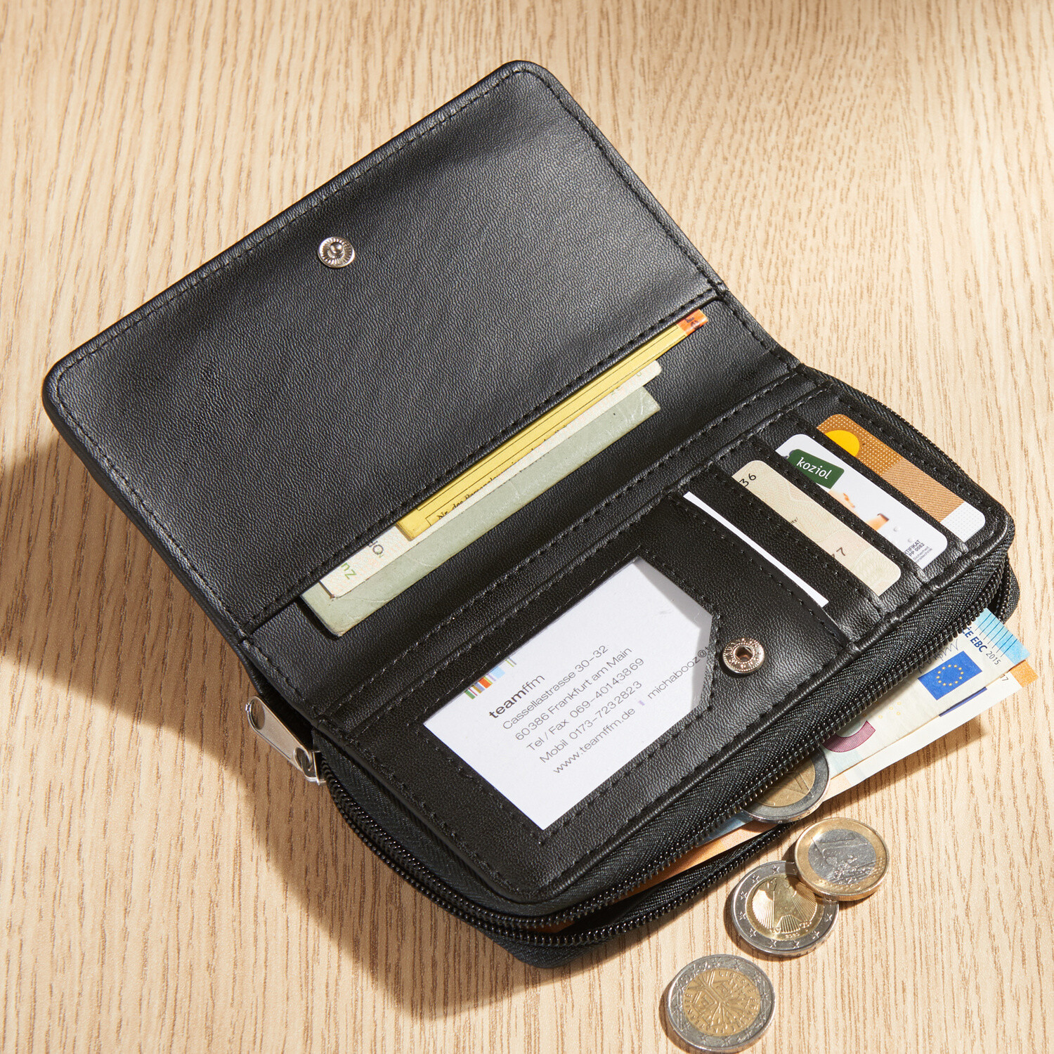 Zladená peňaženka ku koženej kabelke: s priehľadným okienkom, priehradkou na mince a mnohými ďalšími priehradkami na karty a pod.