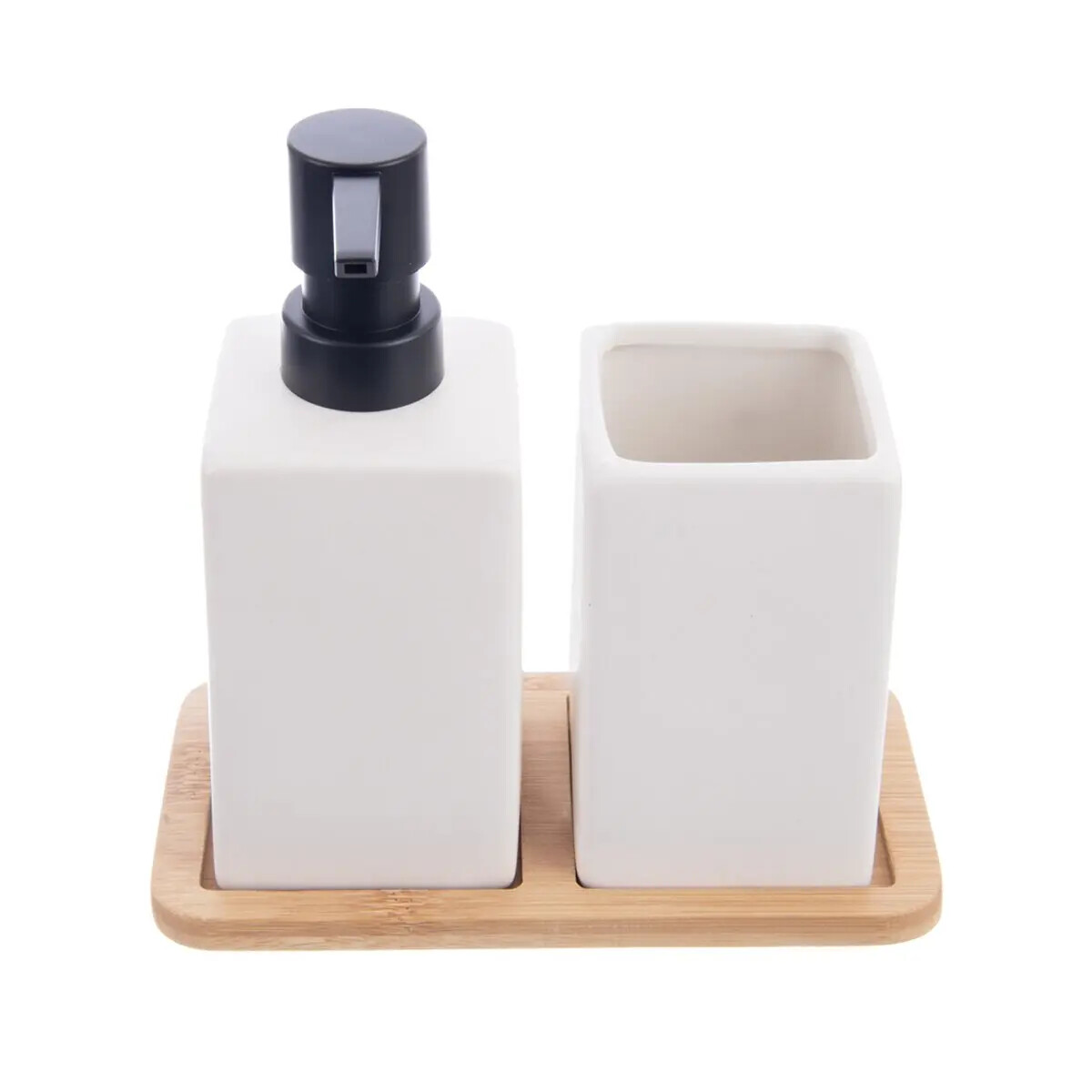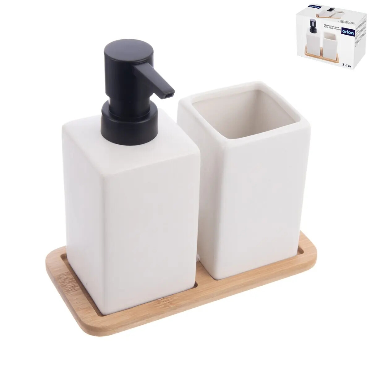 Kúpeľňová sada obsahuje dávkovač mydla a pohárik na zubné kefky, oboje je uložené na bambusovej tácke. Hodí sa do každej kúpeľne aj kuchyne a vyzerá veľmi elegantne. Materiál: dolomit, bambus, plast PP. Rozmery: celkové 17 x 8,5 x 16,5 cm, tácka 17 x 8,5 x 0,8 cm, dávkovač 6,5 x 6,5 x 16 cm, objem 0,3 l, pohárik na kefky 6,5 x 6,5 x 10,5 cm.