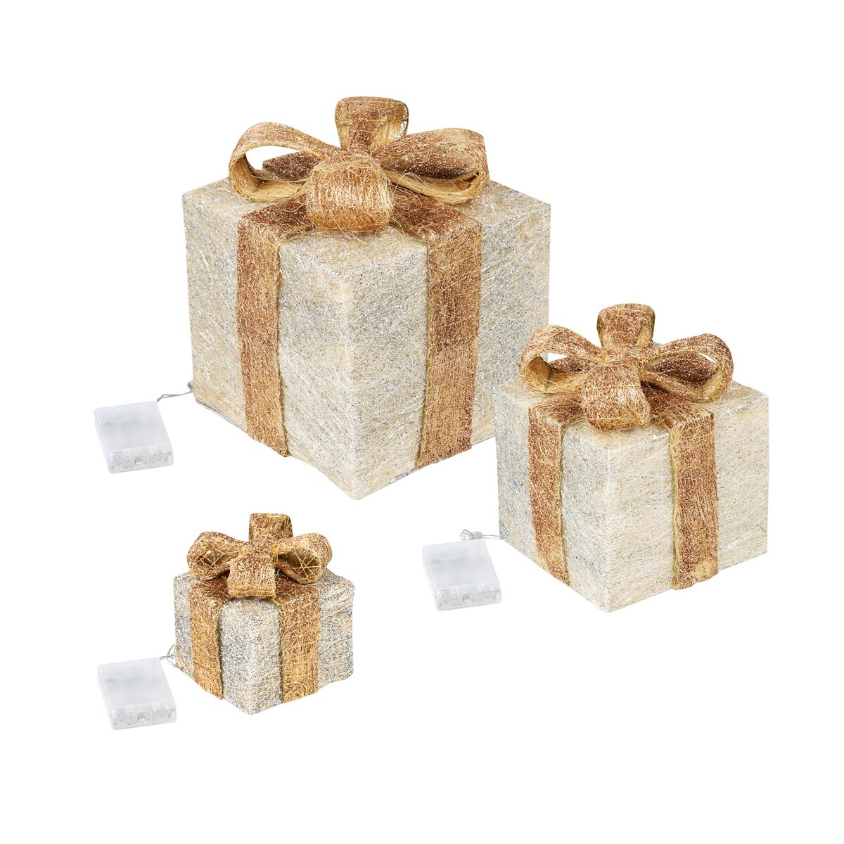 Tieto 3 darčeky vďaka LED diódam vo vnútri nádherne žiaria a na Vianoce krásne ozdobia váš domov. Dekorujte ich spoločne či samostatne, každý má vlastný box na batérie. Celkom 40 LED diód (10/10/20). Prevádzka na 3x AA batérie každý (nie sú súčasťou), so 6hodinovým časovačom. Materiál: kov, sisal. Rozmery: 10 x 10 cm, 15 x 15 cm, 20 x 20 cm.