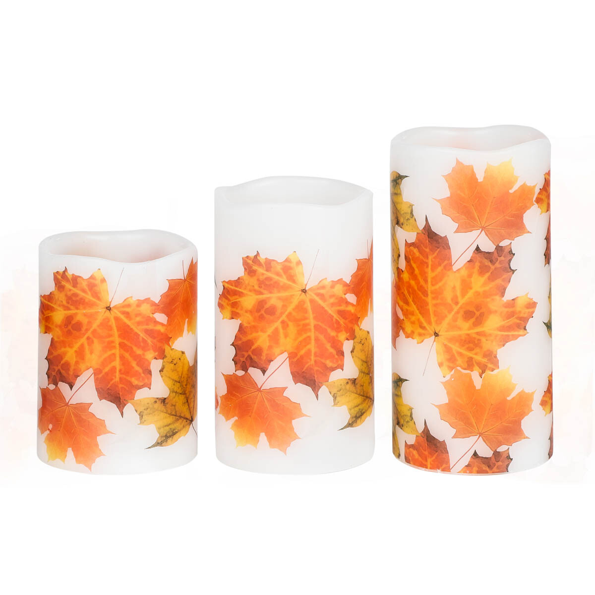 Tri dekoratívne sviečky zdobené vzorom z farebných listov s integrovaným LED osvetlením simulujú blikanie plameňov, ale sú úplne bezpečné. Prevádzka na batérie 3x AAA každá (nie sú súčasťou). S diaľkovým ovládačom pre zapnutie/vypnutie/časovač. Materiál: pravý vosk. Rozmery: priemer 7,5 cm, výška 10 cm, 12 cm, 15 cm.