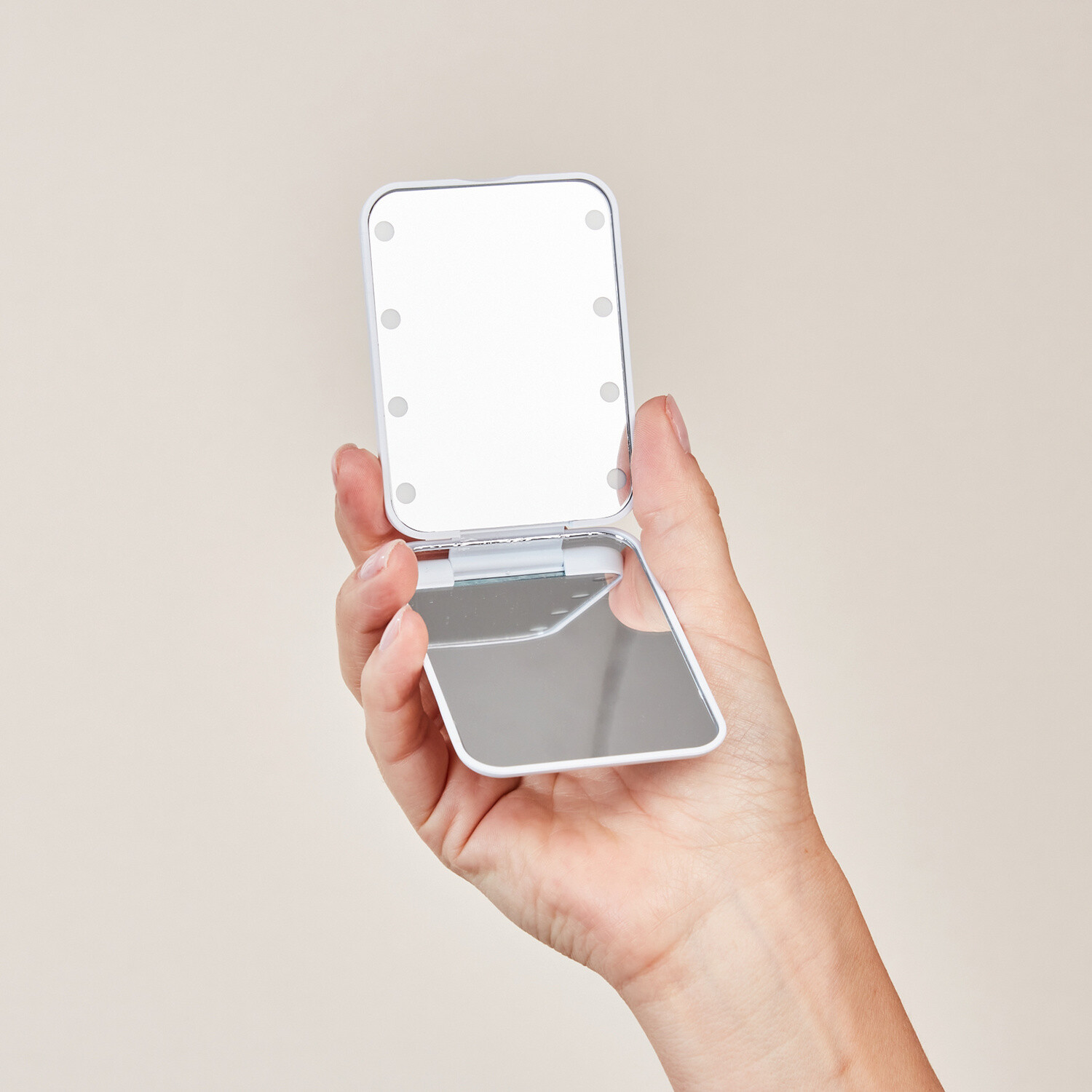 Ideálne na cesty: zrkadlo na líčenie s denným svetlom LED pre rýchlu kontrolu na cestách. Kompaktné, ľahké, zmestí sa do každej kabelky alebo vrecka nohavíc.