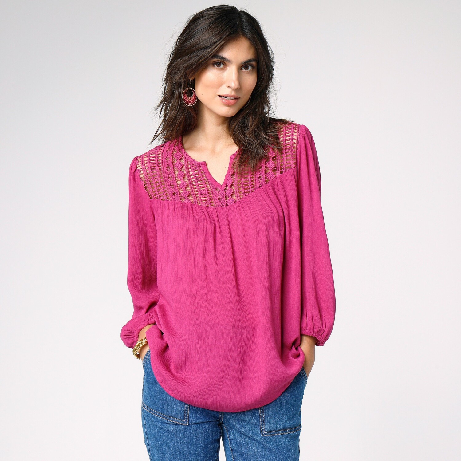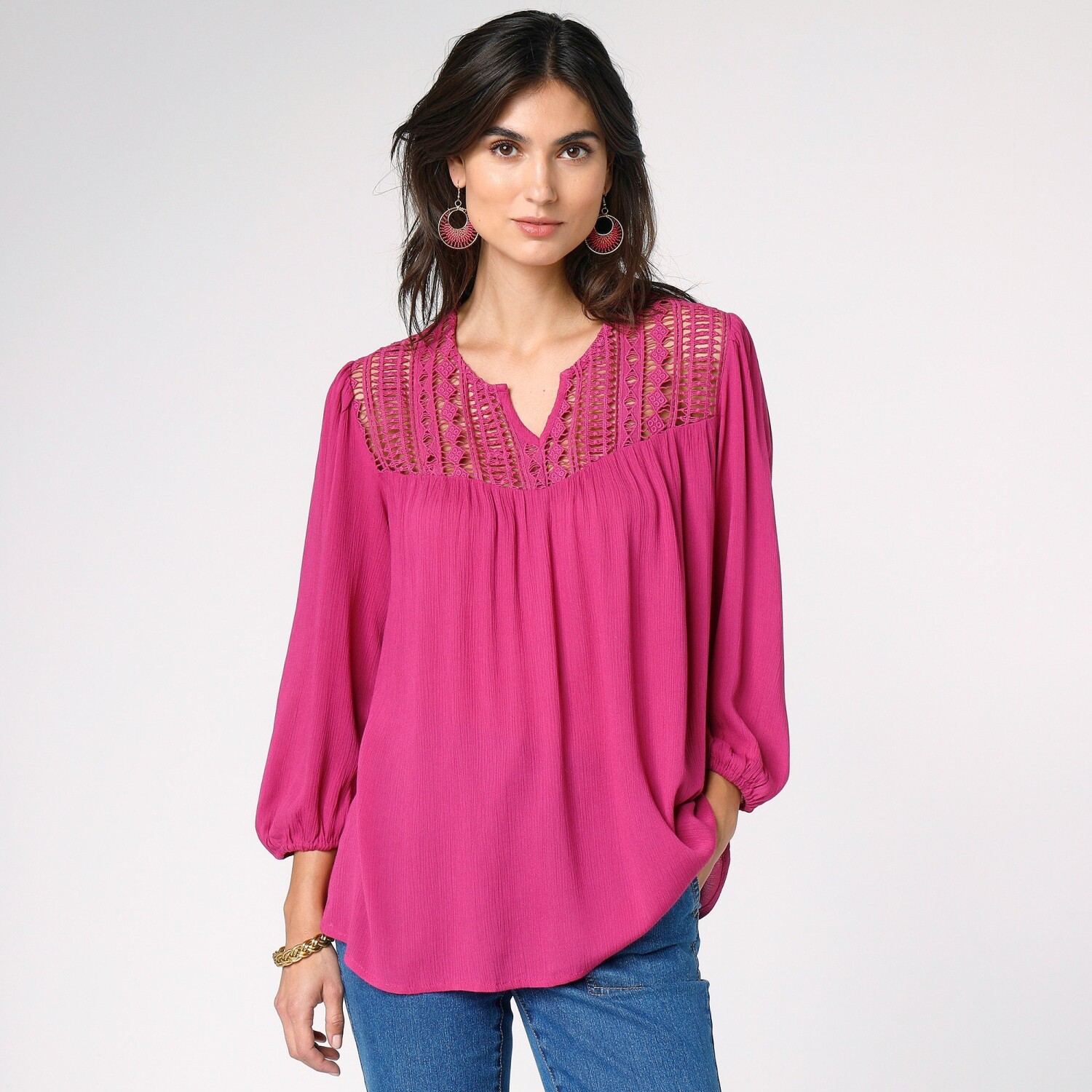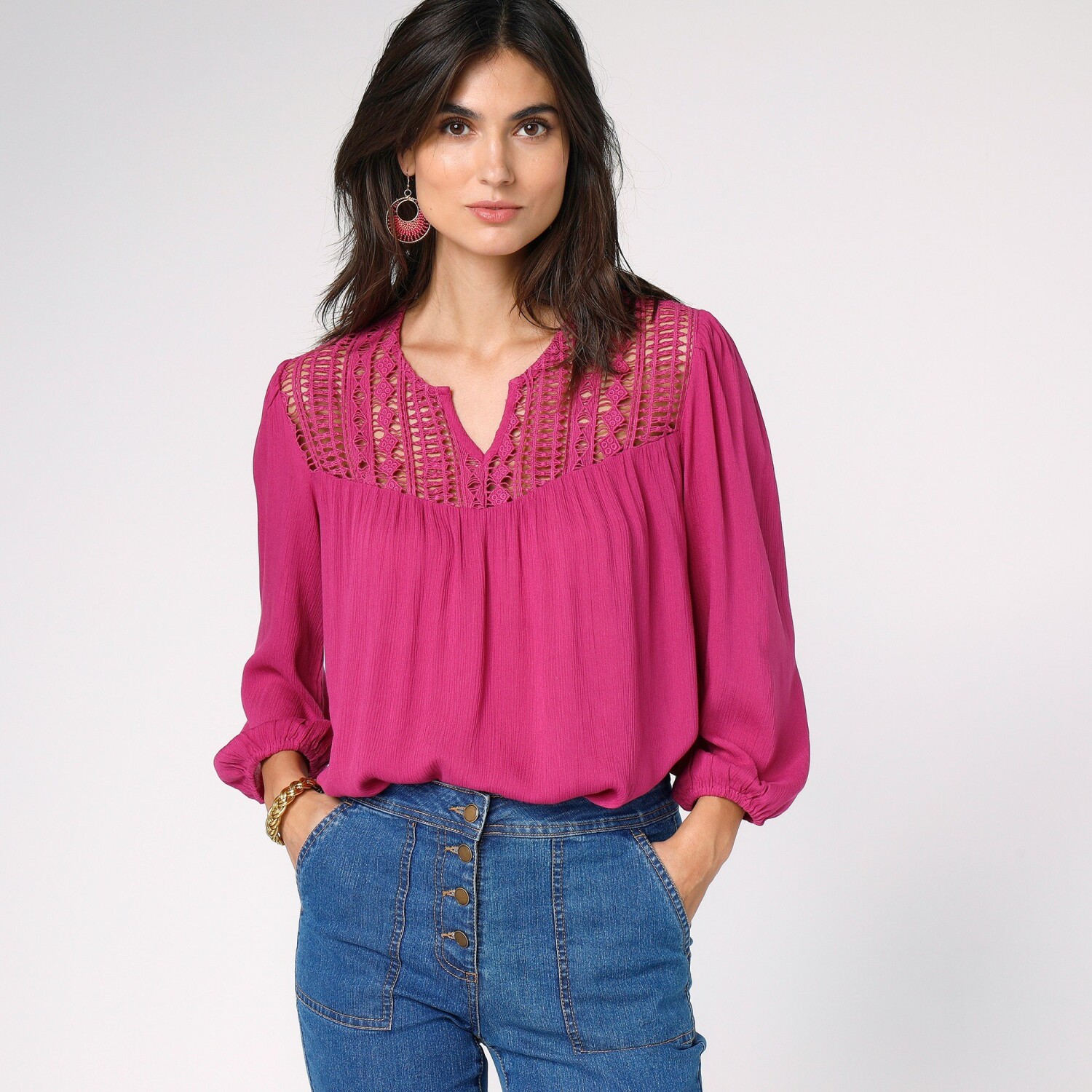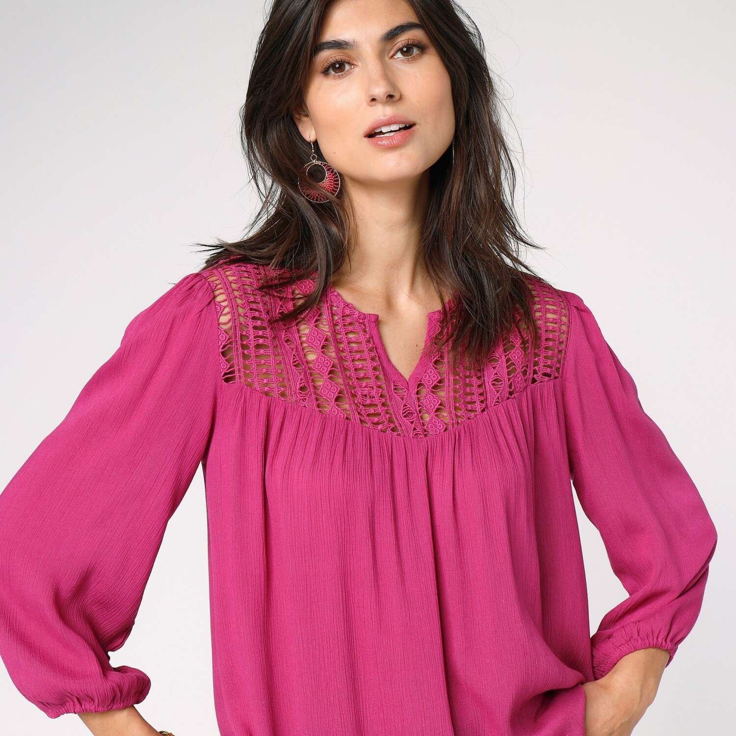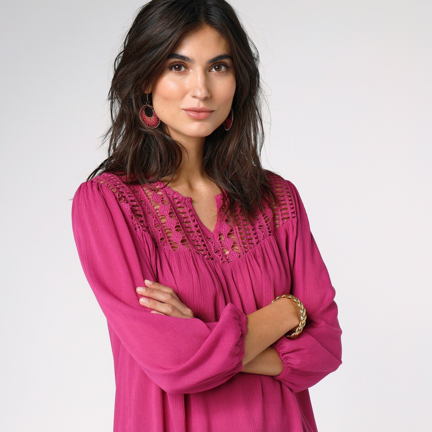 Z materiálu s optickým efektom, zdobená macramé, s originálnymi skladmi: táto blúzka vie, ako si Vás získať! Z materiálu s optickým efektom. Okrúhly výstrih s gombíkmi a ozdobným prámikom. Vpredu prešité sklady. Dlhé široké rukávy s macramé detailom. Nariasené plecia. Manžety na gombík. Rovný spodný lem. Možno prať v práčke.