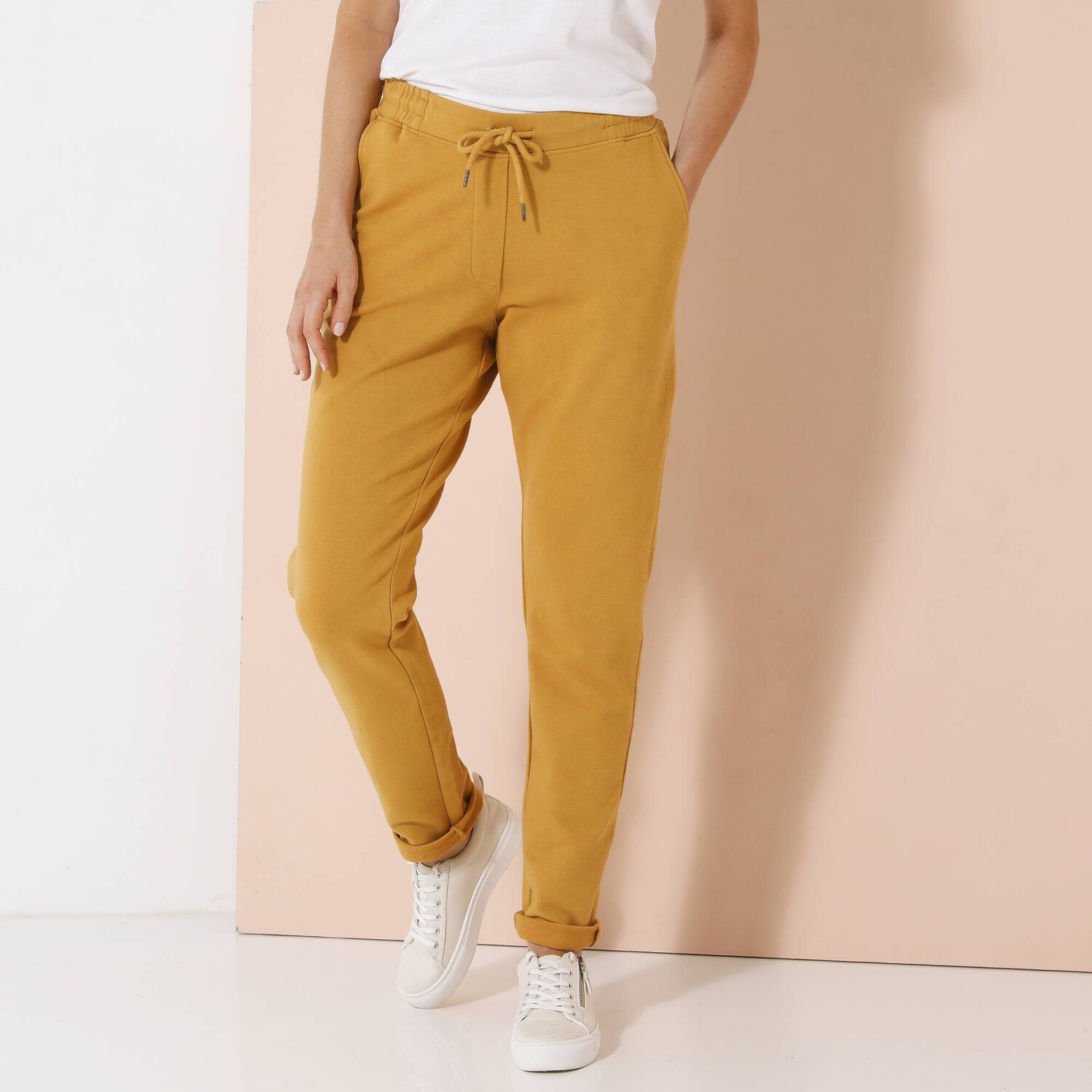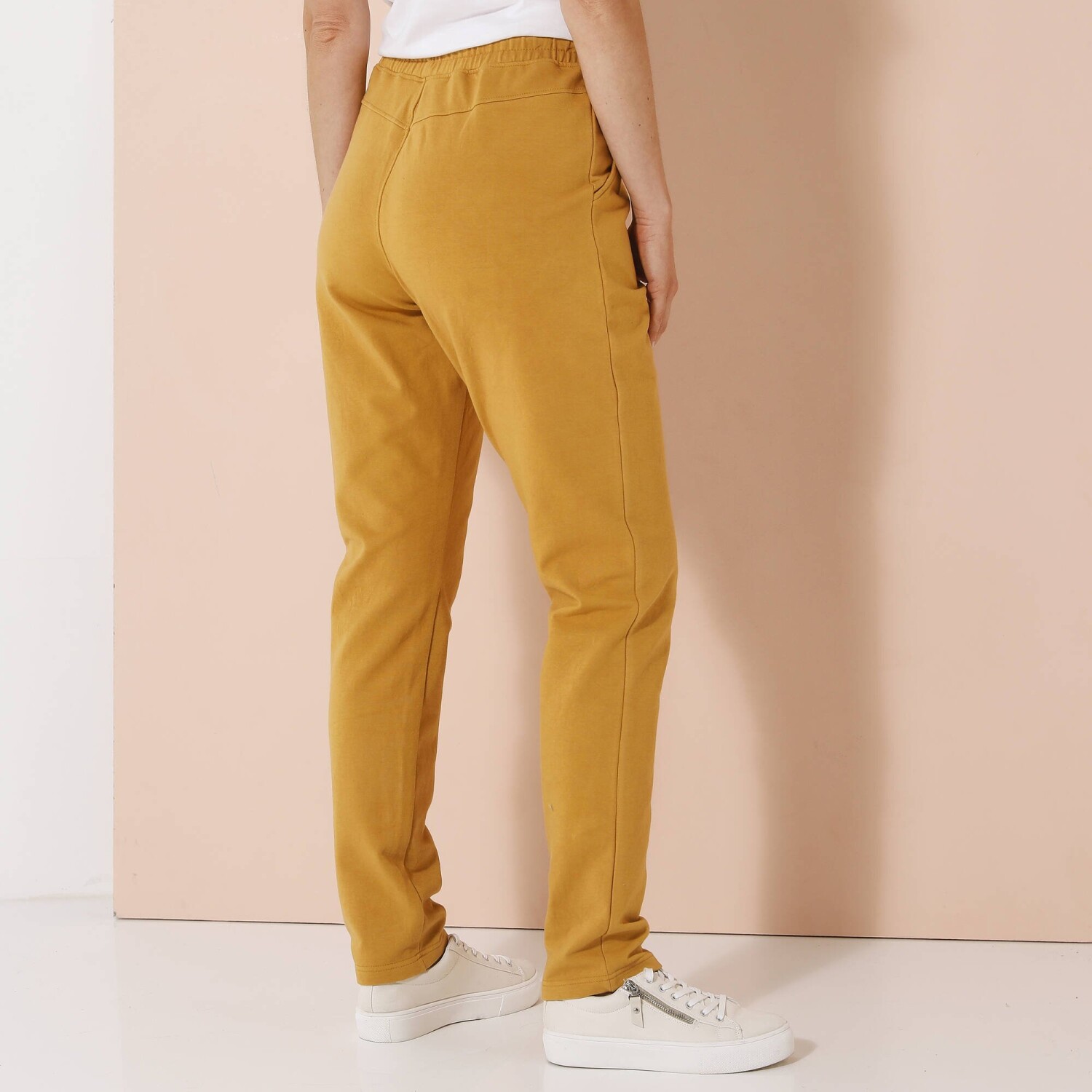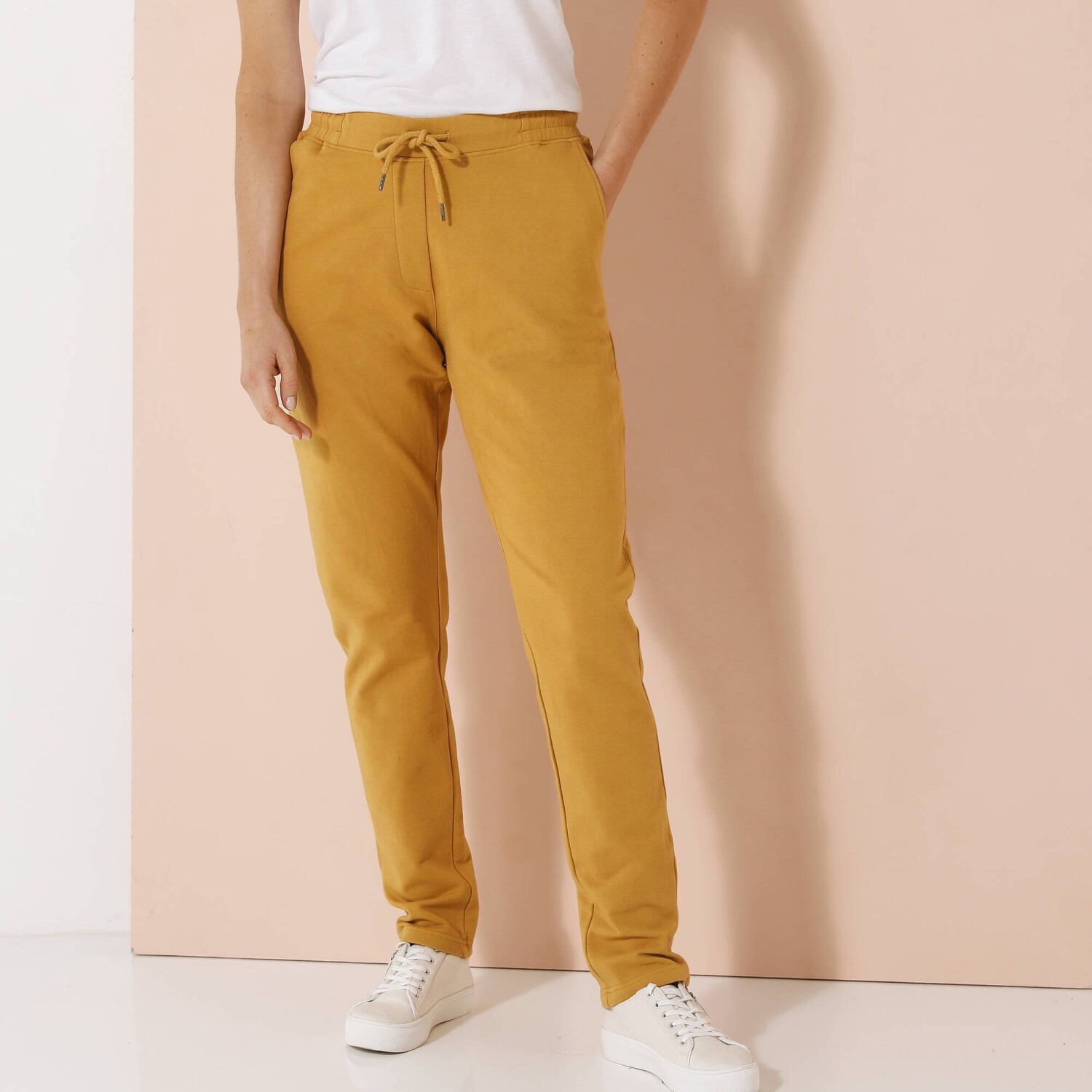 Ideálna na všetky športové aktivity, tieto nohavice z česaného moltonu sú veľmi príjemné. Na bokoch nohavíc kontrastné lampasy. Vrúbkovaný pás s gumou + pretiahnutou šnúrkou. 2 vrecká so vrúbkovaným lemom. Nohavice na konci zúžené vrúbkovaním. Možno prať v práčke.