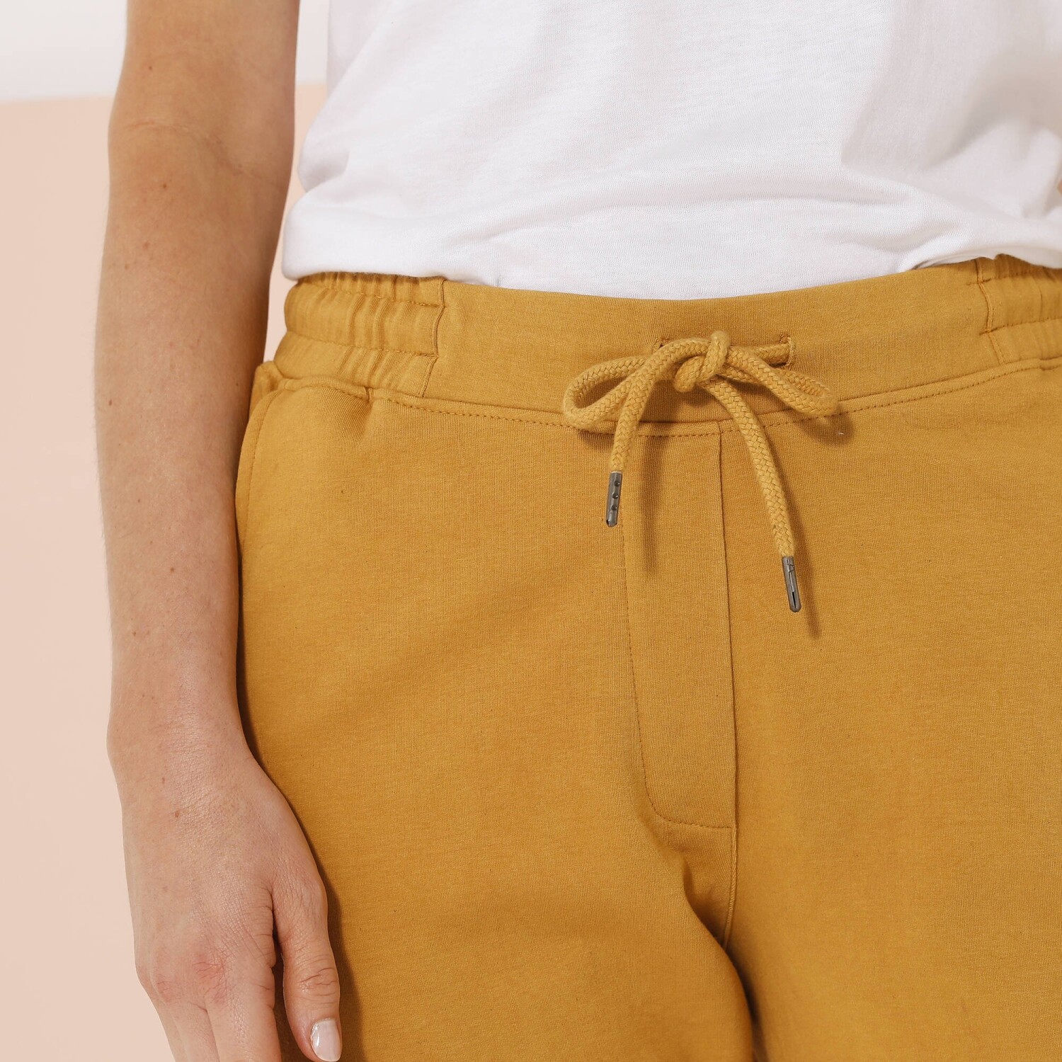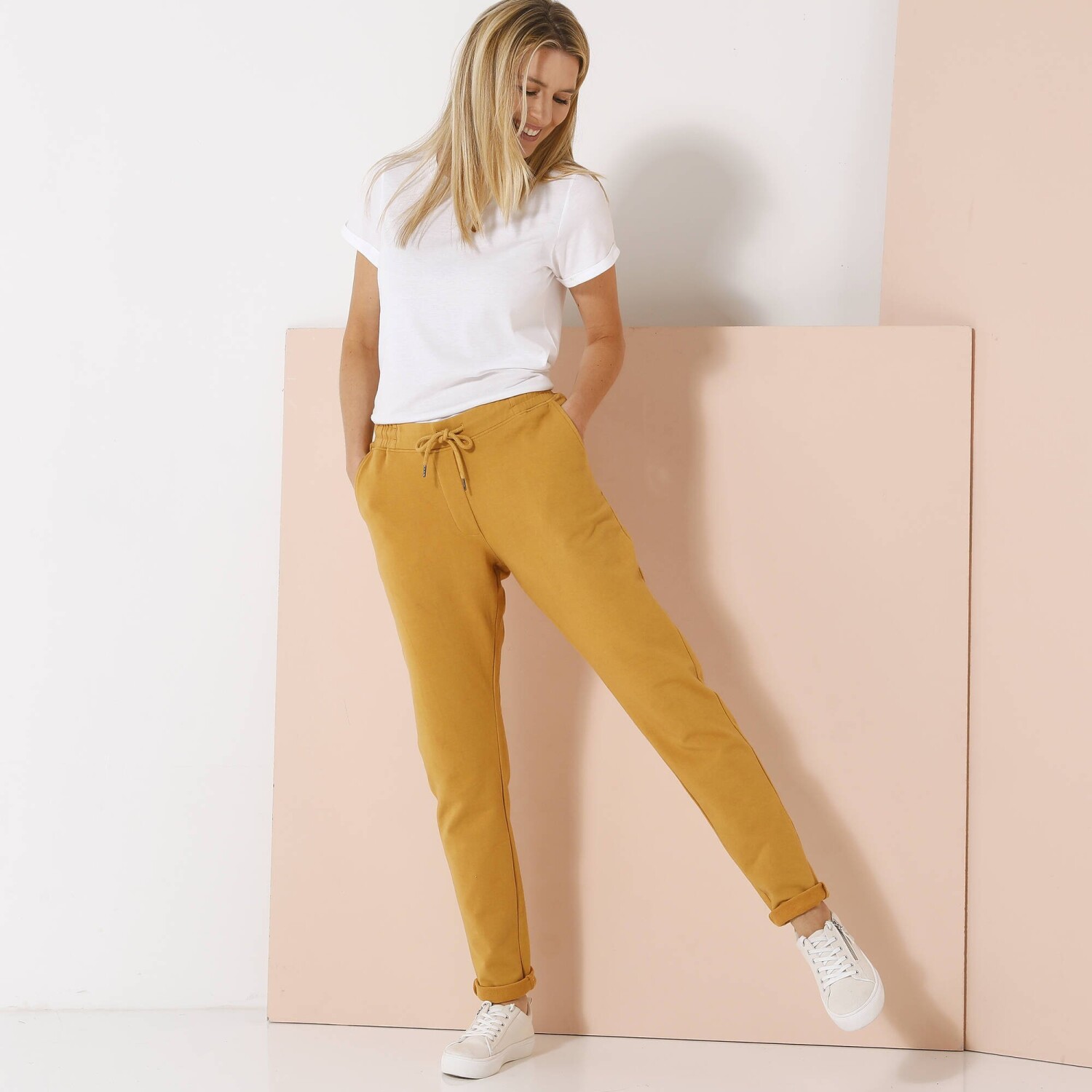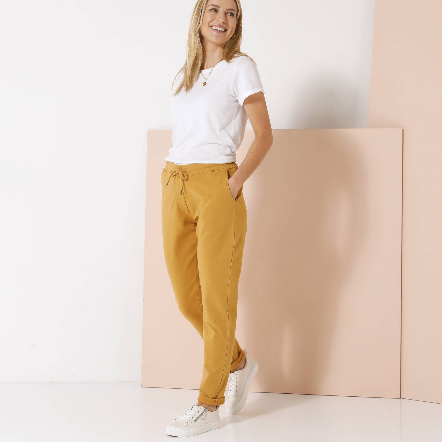 Ideálna na všetky športové aktivity, tieto nohavice z česaného moltonu sú veľmi príjemné. Na bokoch nohavíc kontrastné lampasy. Vrúbkovaný pás s gumou + pretiahnutou šnúrkou. 2 vrecká so vrúbkovaným lemom. Nohavice na konci zúžené vrúbkovaním. Možno prať v práčke.