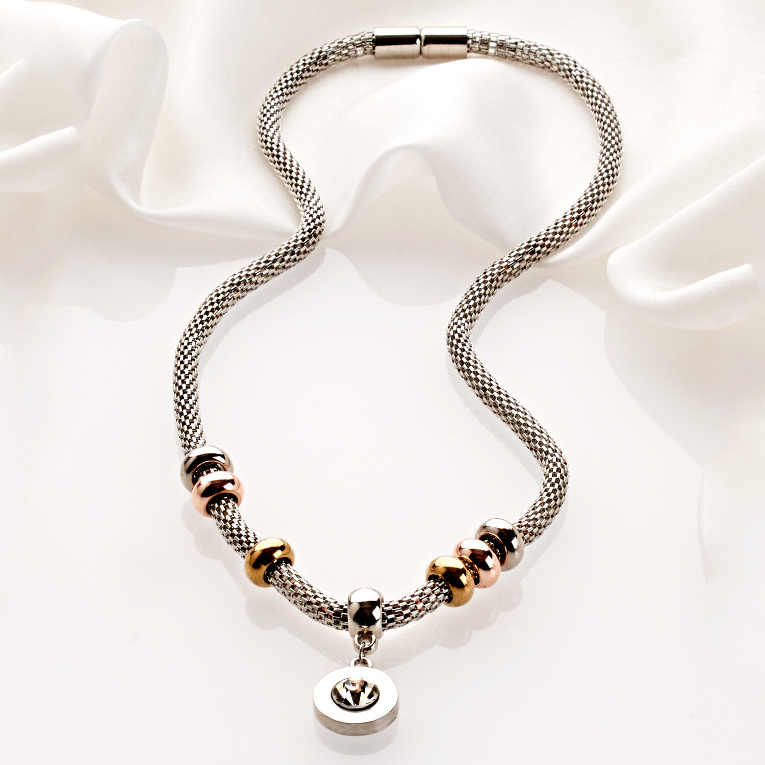 Perlový náhrdelník prepletený s korálkami striebornej farby vykladanými kamienkami vás zahalí do elegancie. Klasické zapínanie. Materiál: kov. Dĺžka cca 53 cm + 8 cm predĺženie.