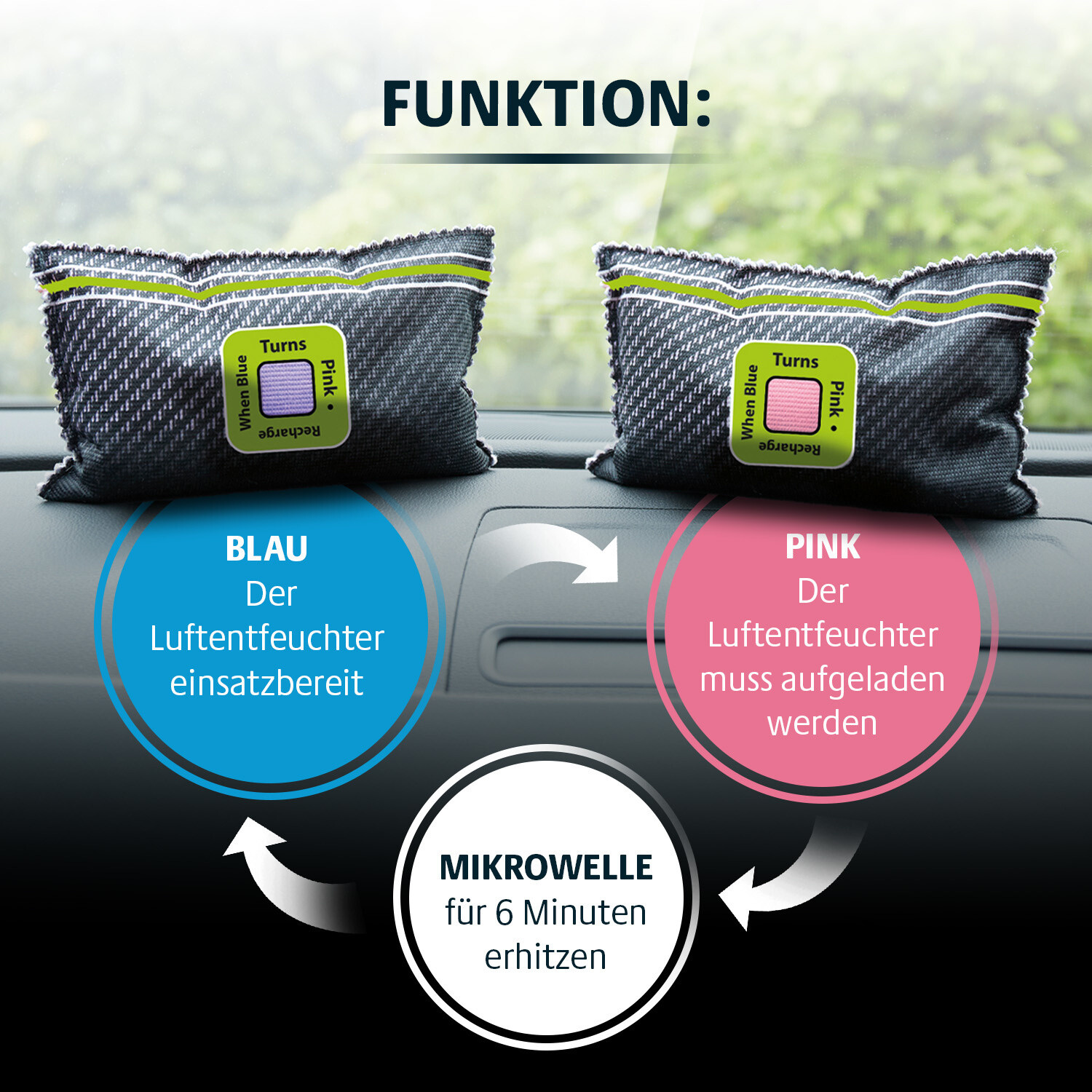 Praktický odvlhčovač vzduchu, ktorý zaisťuje optimálnu vnútornú klímu v aute. Zabránite tak zahmleniu alebo zamrznutiu okien a predídete korózii a plesniam. Silikónový granulát pohltí až 140 ml kondenzovanej vody. Pokiaľ indikátor zružovie, je nasýtený - a po 6 minútach v mikrovlnnej rúre je opäť pripravený na použitie.