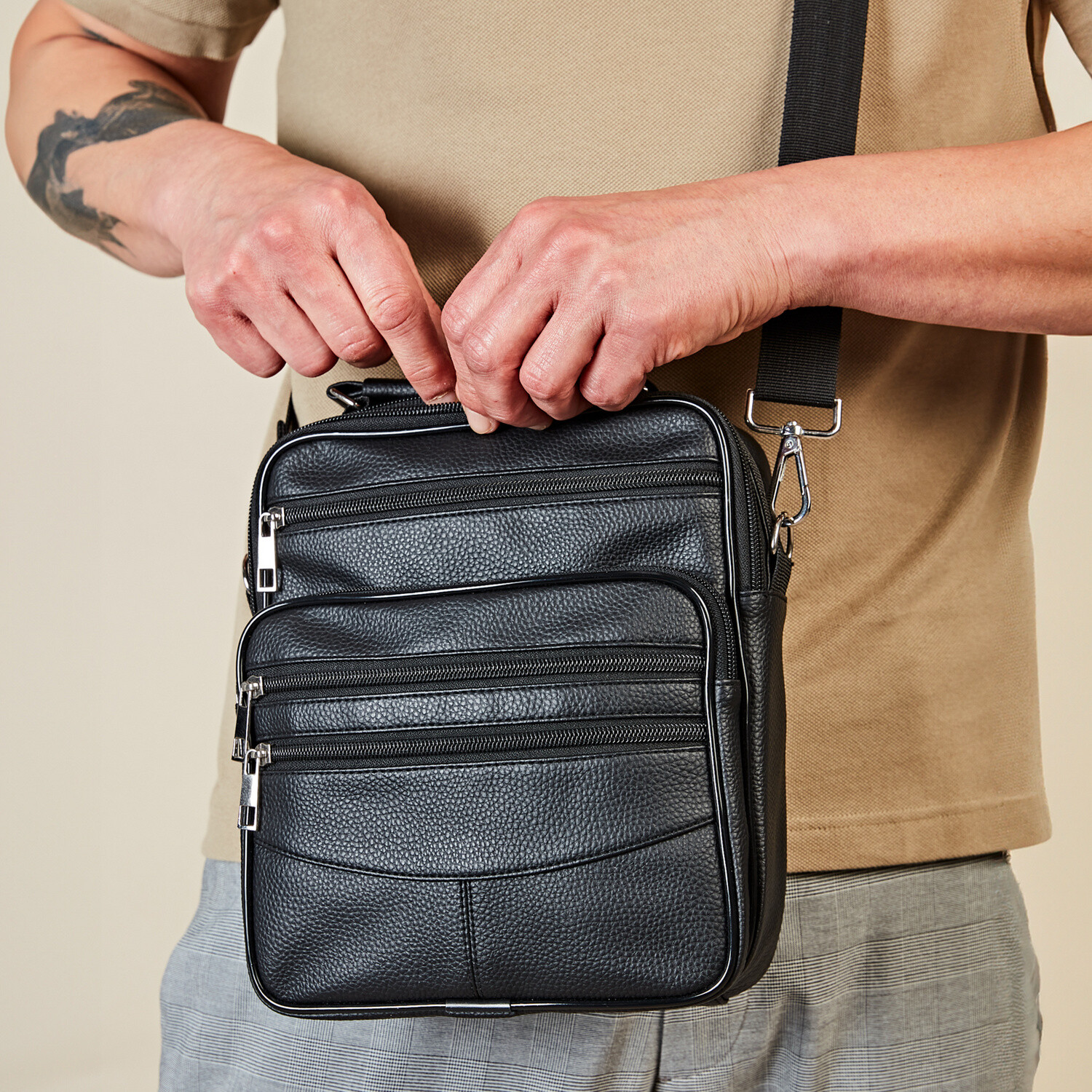Praktická, vo vnútri priestranná taška cez rameno pojme všetko, čo muž potrebuje. 5 priehradiek a vnútorná priehradka na zips: Vaše veci budú usporiadané. Vzhľad zrnitej kože s robustným kovovým kovaním, pevnou rukoväťou a nastaviteľným ramenným popruhom.