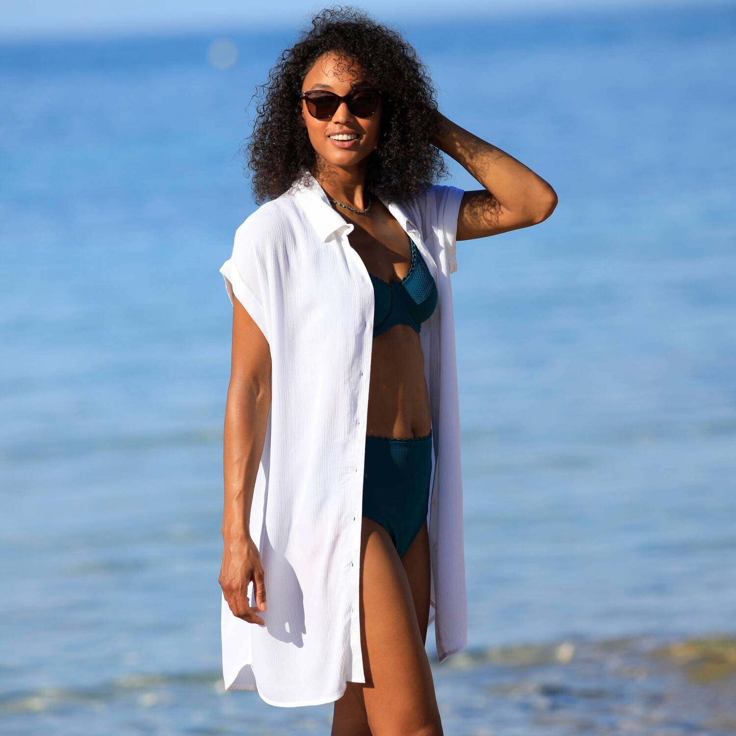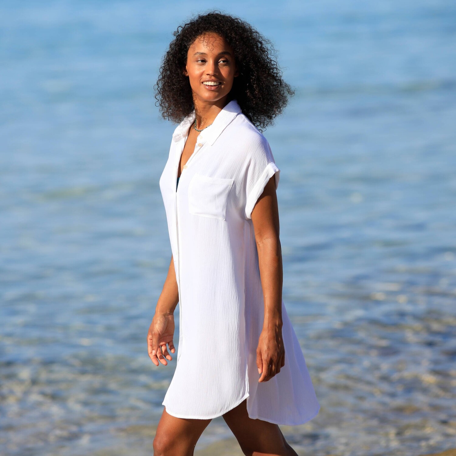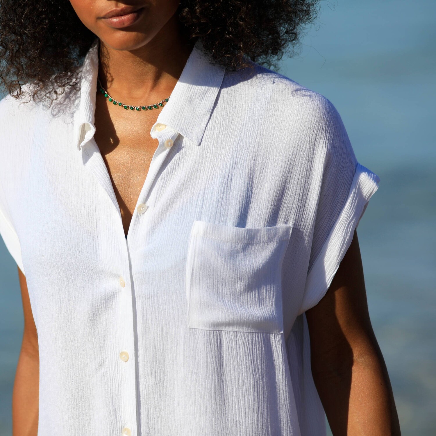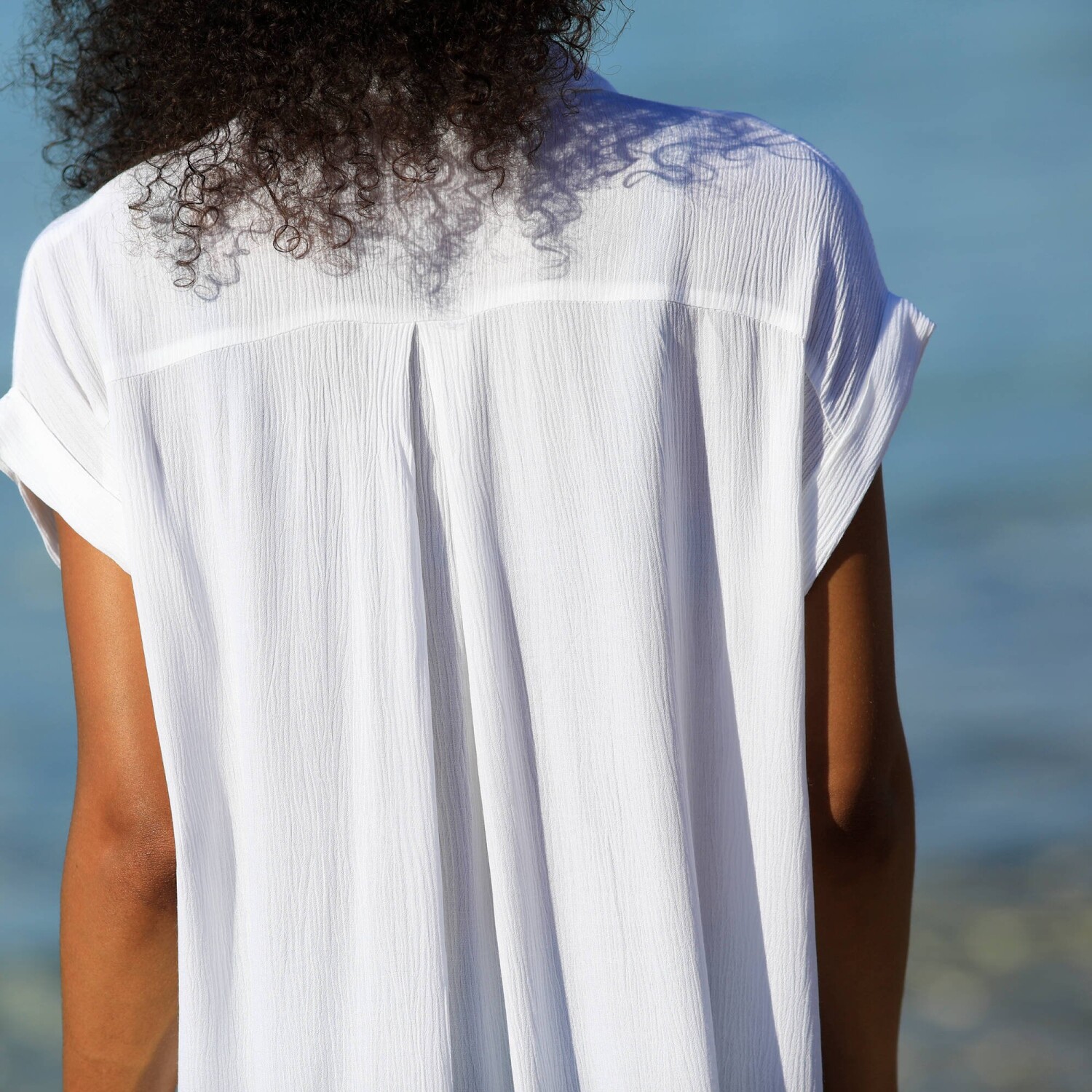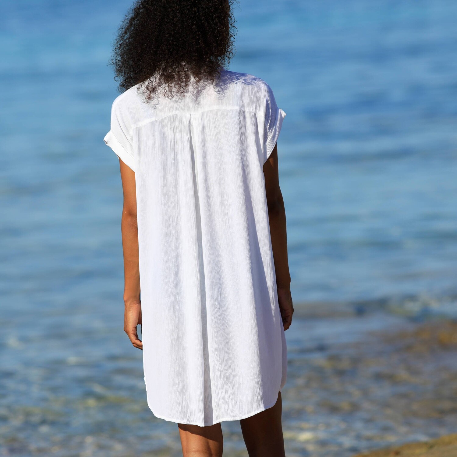 Jednofarebné krátke košeľové šaty vo voľnom strihu sa postarajú o pohodlné nosenie. Ľahký krepón. Košeľový golier. Gombíková léga, perleťové gombíky vpredu uprostred. Voľné ramená. Krátke rukávy zakončené ohrnutím. 1 náprsné vrecko. Oblý spodný lem. Možno prať v práčke.