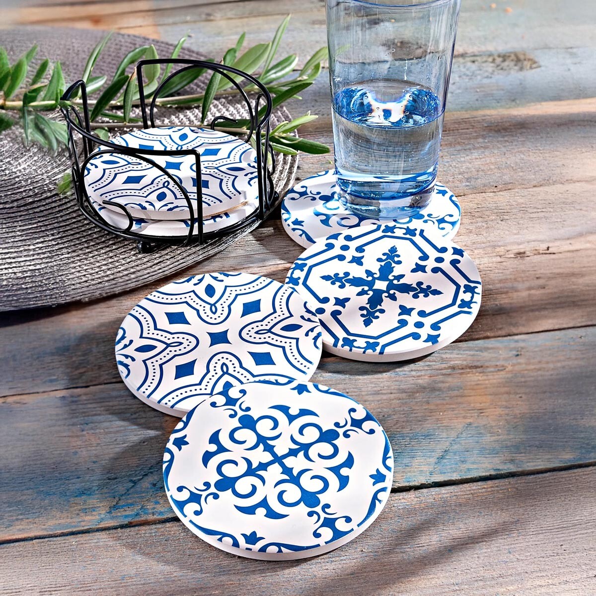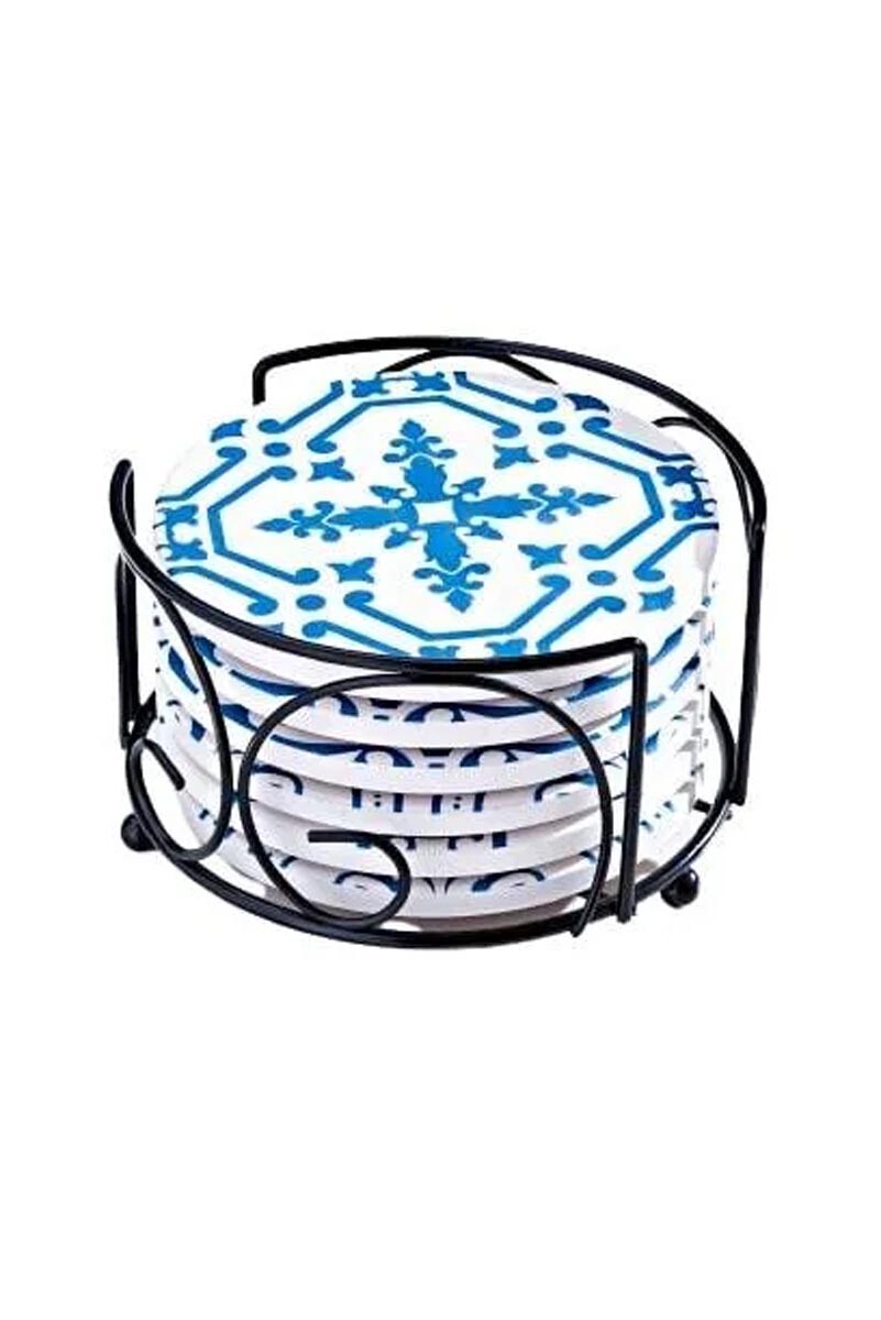 Sada podtáckov Maritim so stojanom prinesie kúsok Stredomoria priamo na váš stôl. Týchto 6 okrúhlych podtáckov v modrobielom dizajne, inšpirovanom námornými dlaždicami, ochráni váš stôl pred vlhkosťou a škvrnami od nápojov. 3 rôzne vzory (každý 2x). Vrátane elegantného kovového stojana. Materiál: keramika, kov. Rozmery: priemer 10,2 cm, výška 0,6 cm.