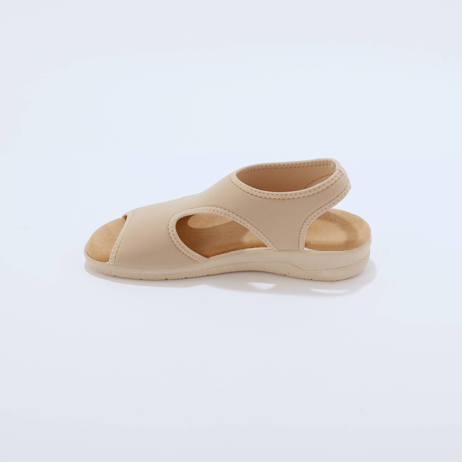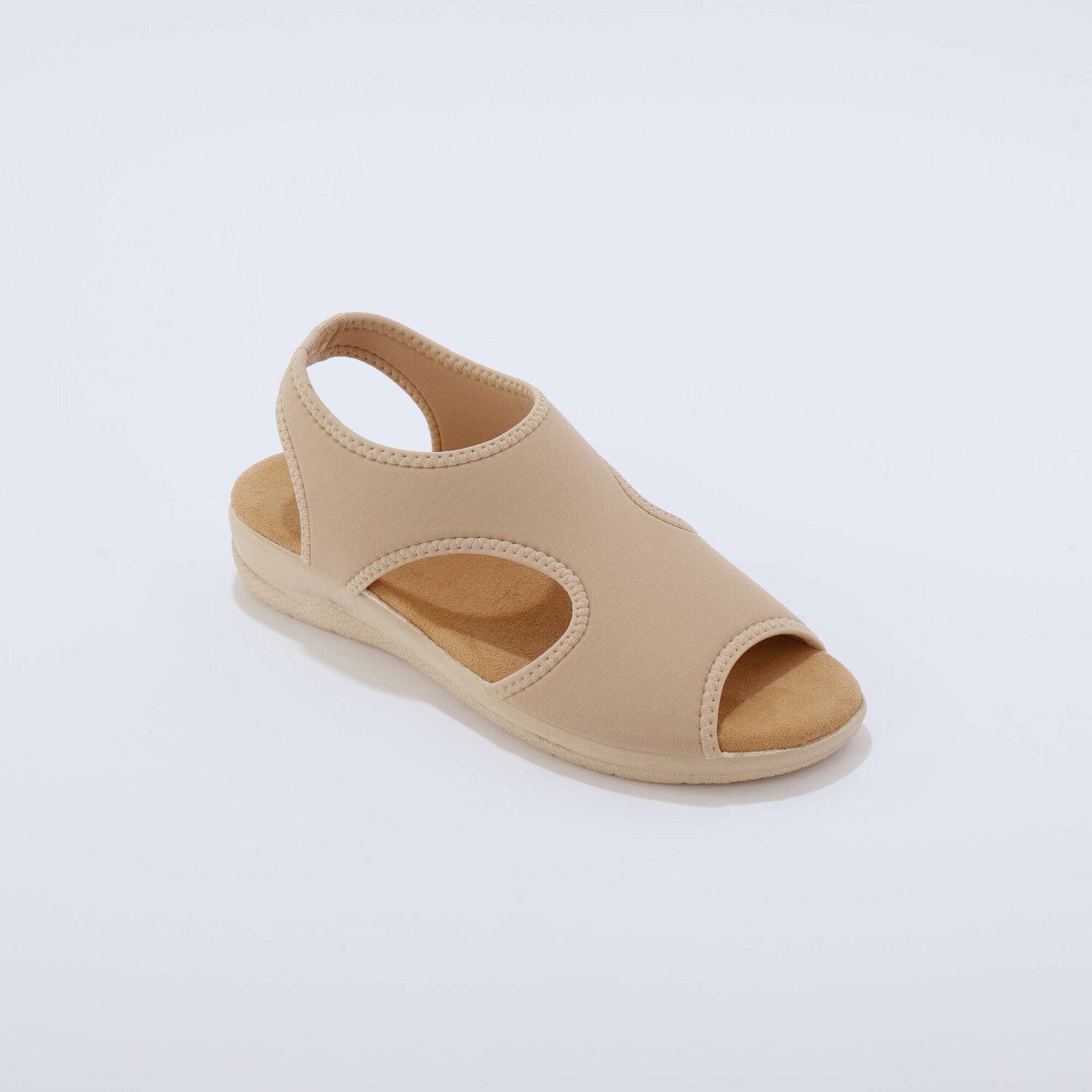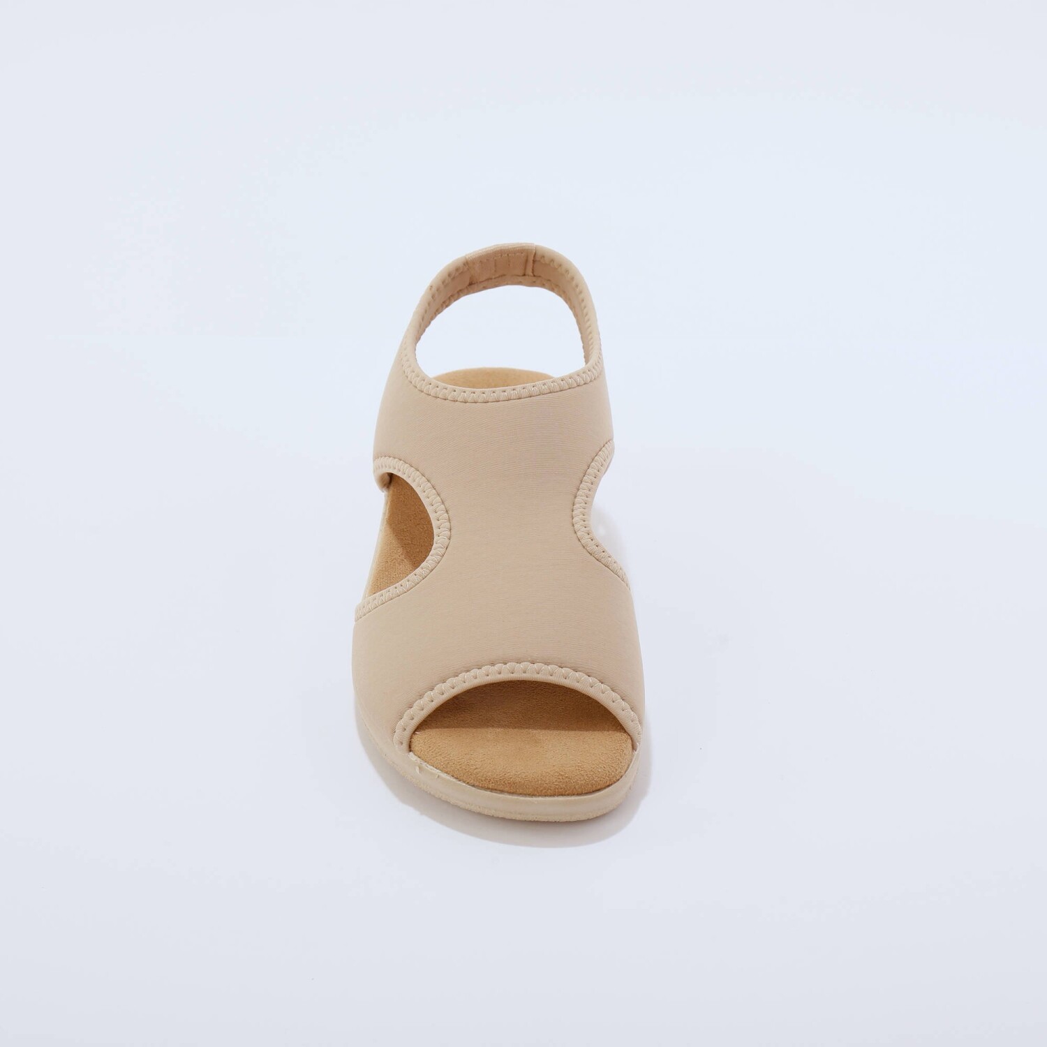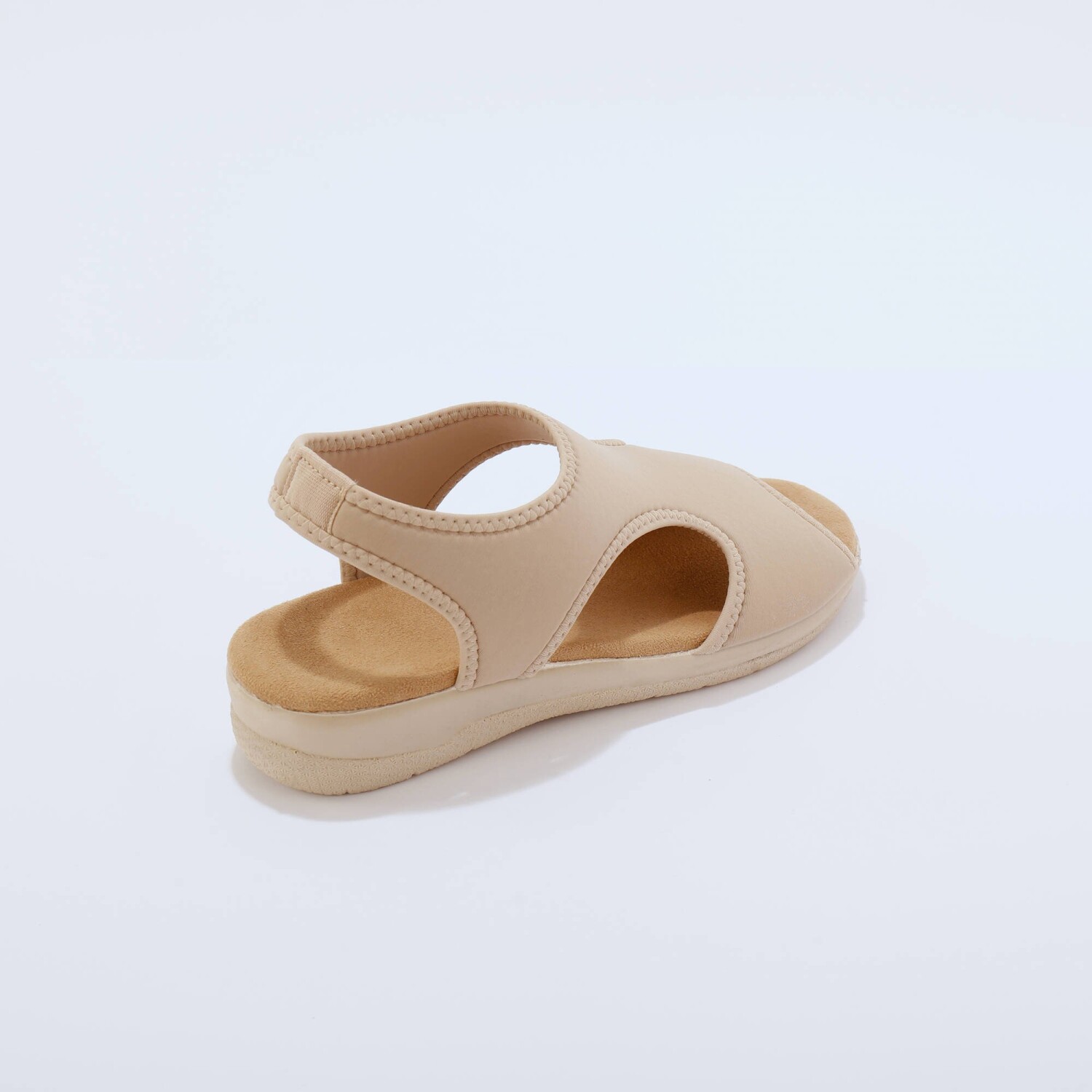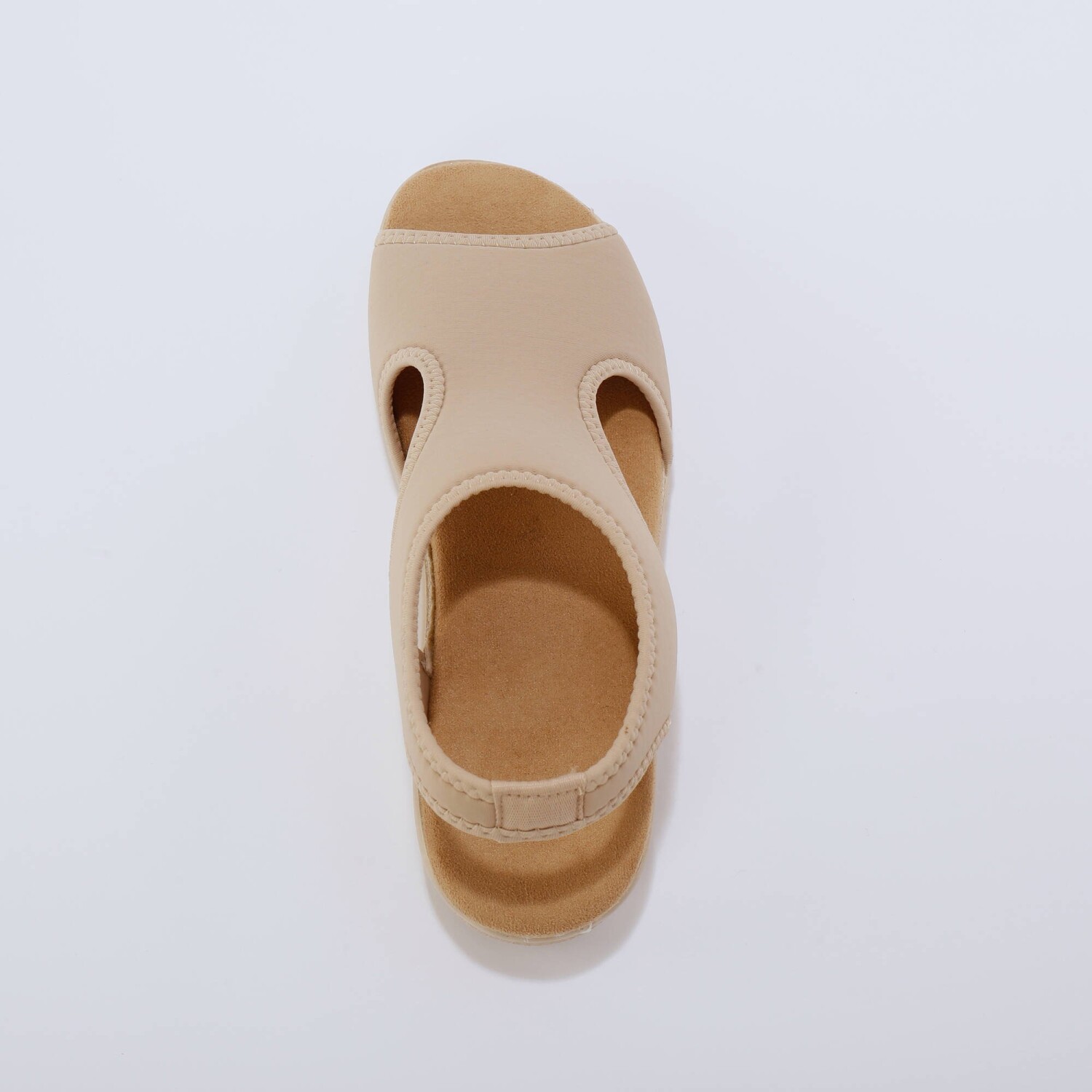 Hviezdne topánky na letnú sezónu, to sú sandále na klinovom podpätku so šnúrkou na zaviazanie. Z umelého semišu s okrúhlou špičkou. Široká šnúrka na zaviazanie okolo členka. Kontrastná päta z pláteného materiálu, s 2 kovovými očkami. Klinový podpätok potiahnutý lykom. Možno prať v práčke.