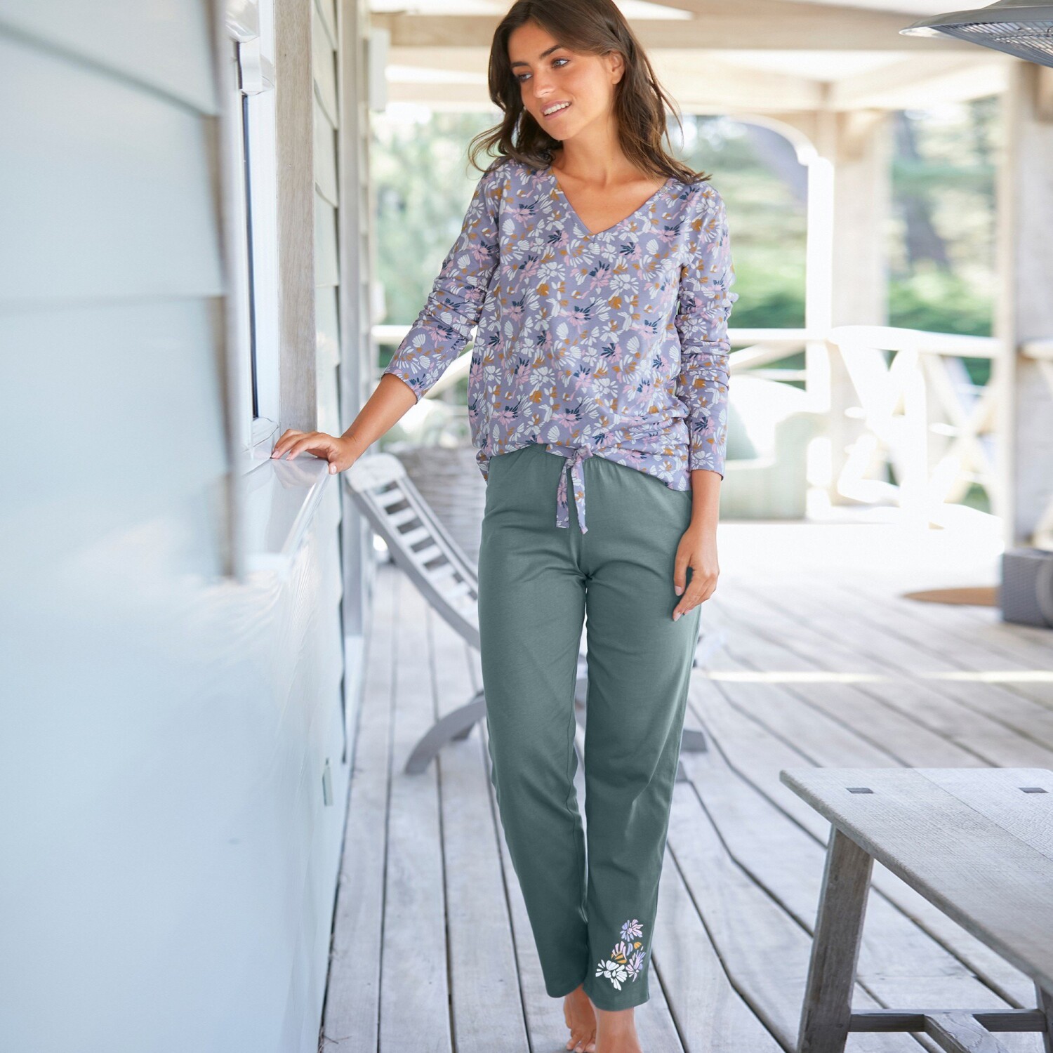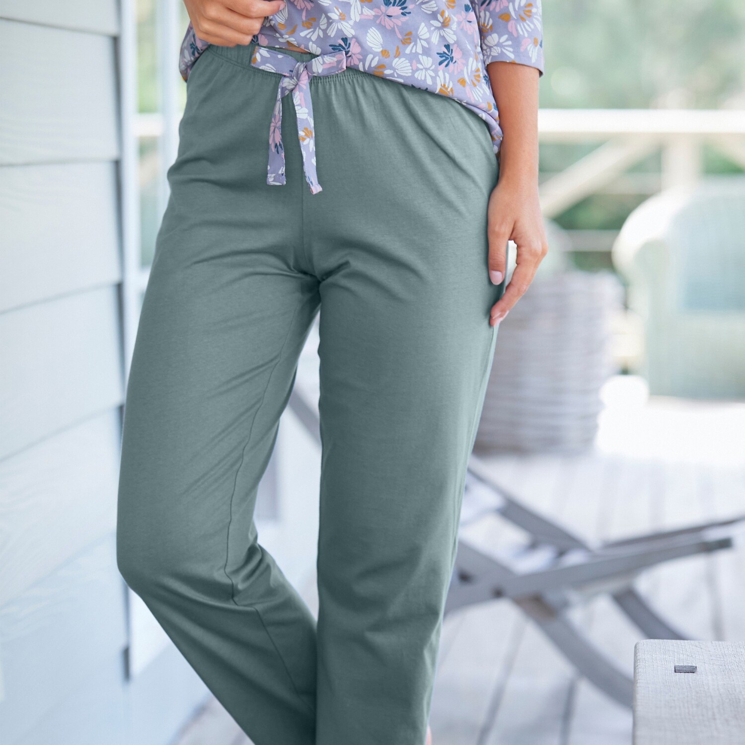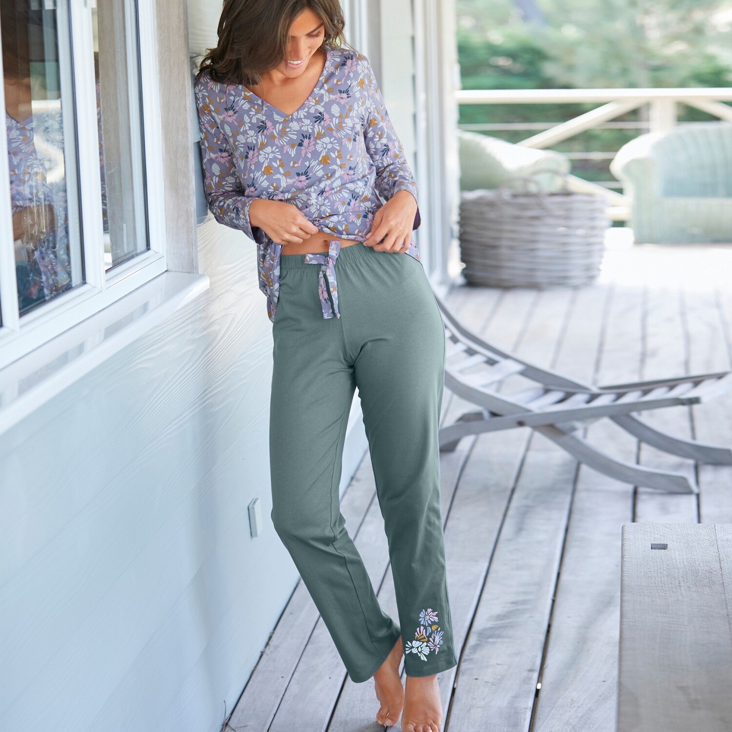 Inšpirujte sa kolekciou s potlačou okvetných lístkov a venujte pozornosť pyžamovým nohaviciam so stredovou potlačou. Pyžamové nohavice v aktuálnom strihu. Potlač na koncoch nohavíc. Pružný pás s kontrastnou stuhou. Rovné nohavice. Standard 100 by Oeko-Tex (n° CQ 1216/3). Táto známka označuje textilné výrobky, ktoré boli podrobené laboratórnym testom na široké spektrum škodlivých látok a výrobok je bezpečný nad rámec platných noriem. Možno prať v práčke.