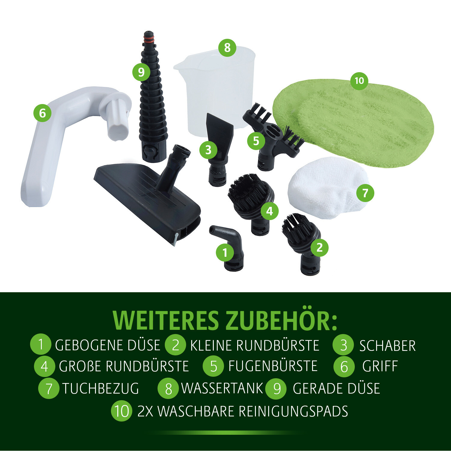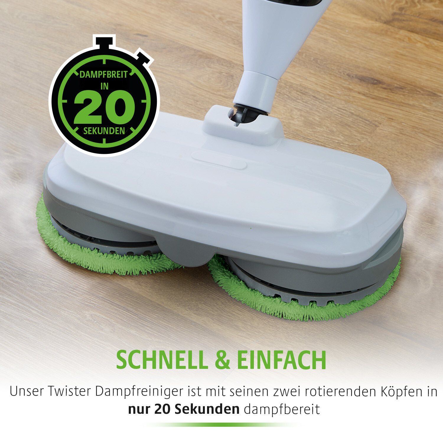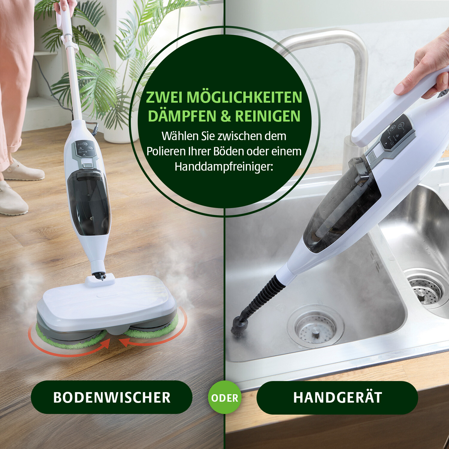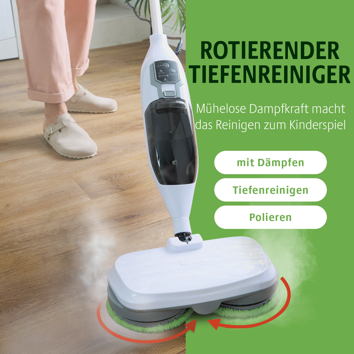 Parný čistič 2 v 1 s rotačnými mopovacími hlavicami čistí do hĺbky a dezinfikuje. Ideálny na dláždené, kamenné alebo drevené podlahy, ale aj čalúnenie. Odnímateľná rukoväť na pracovné dosky alebo steny sprchovacieho kúta. Odnímateľná nádržka na vodu. Súčasťou balenia je 10-dielne príslušenstvo, ako sú kefy a dýzy na ťažko prístupné miesta, škrabka a 2 návleky, ktoré je možné prať v práčke.