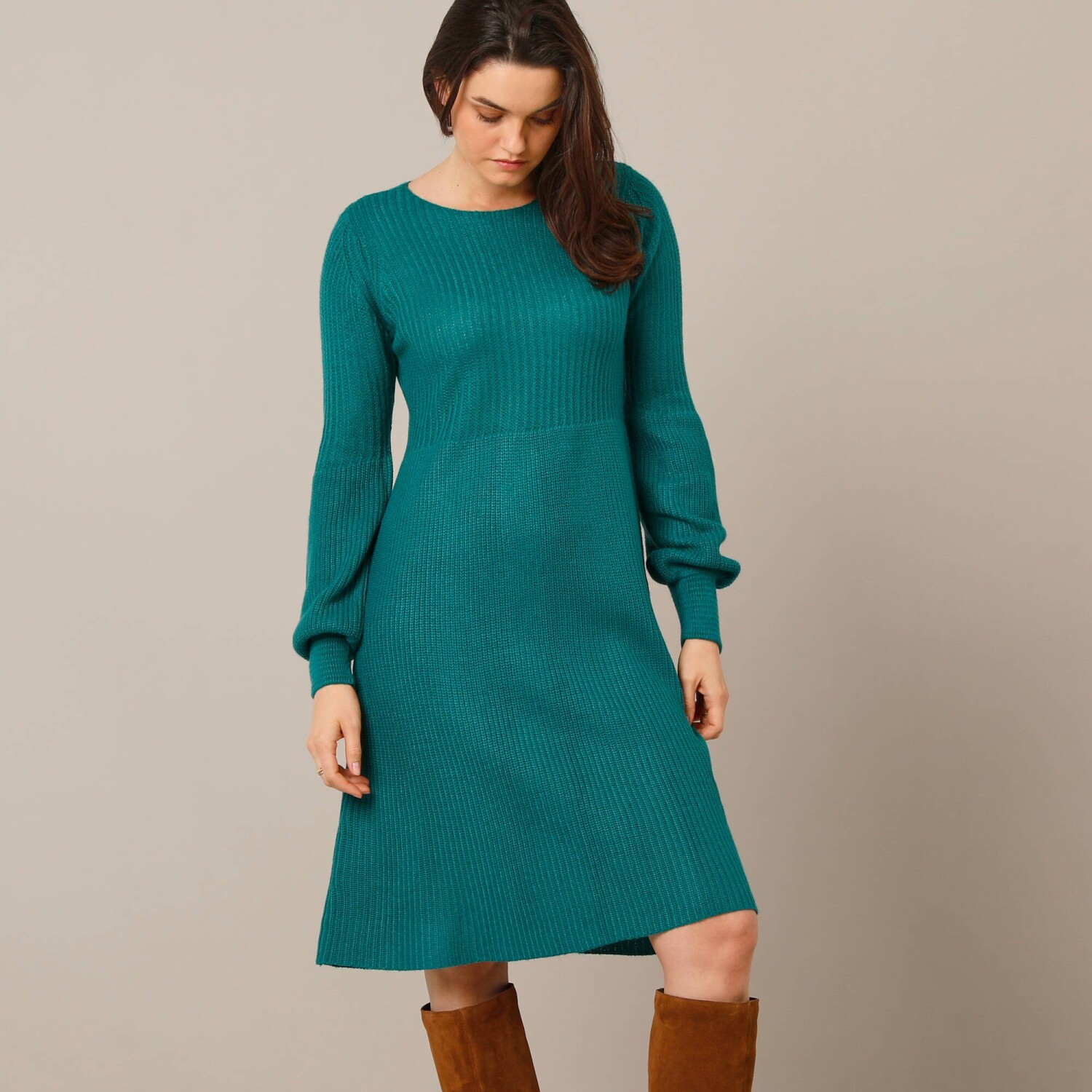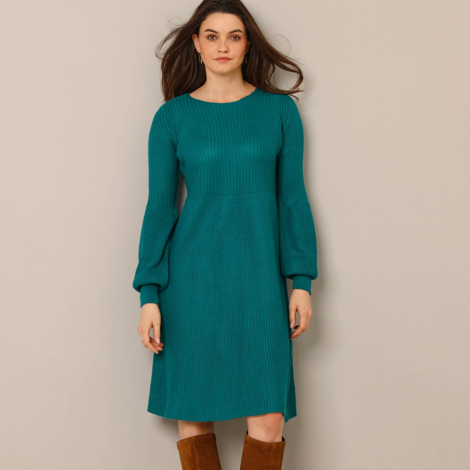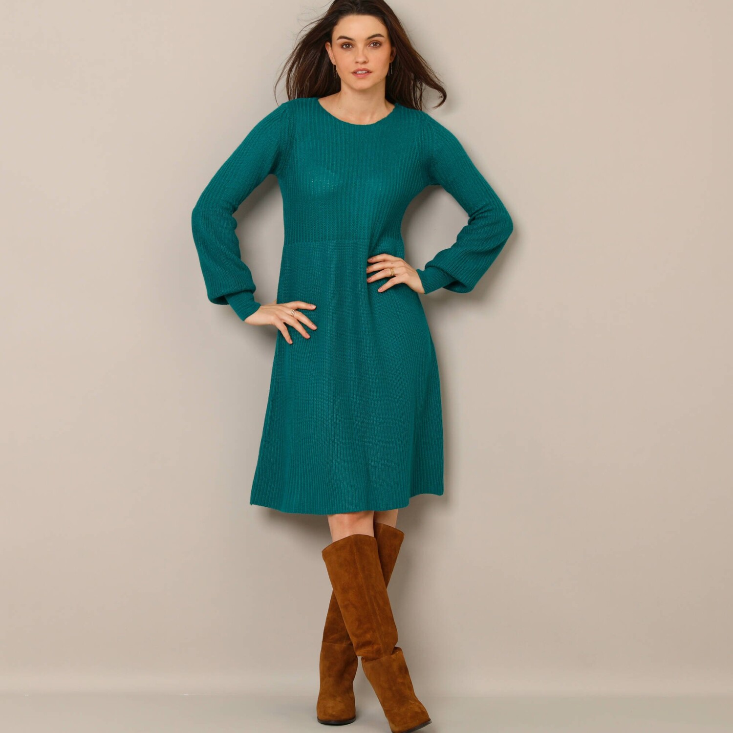 Úpletové rozšírené šaty bodujú krásnym vzorom a nadýchanými rukávmi. Konce nadýchaných dlhých rukávov s vrúbkovanými manžetami. Mierne priliehavé v páse. Rozšírený strih. Možno prať v práčke.