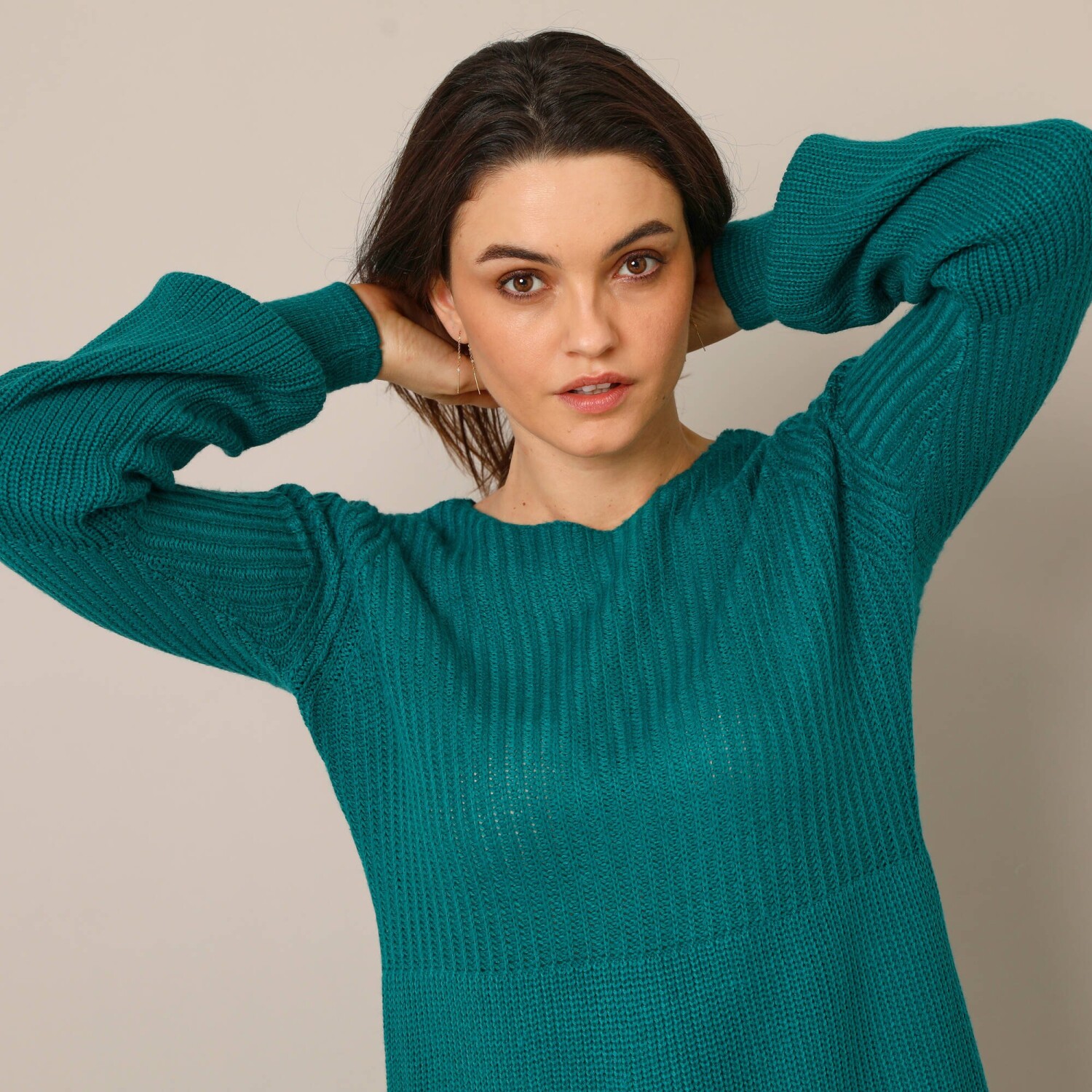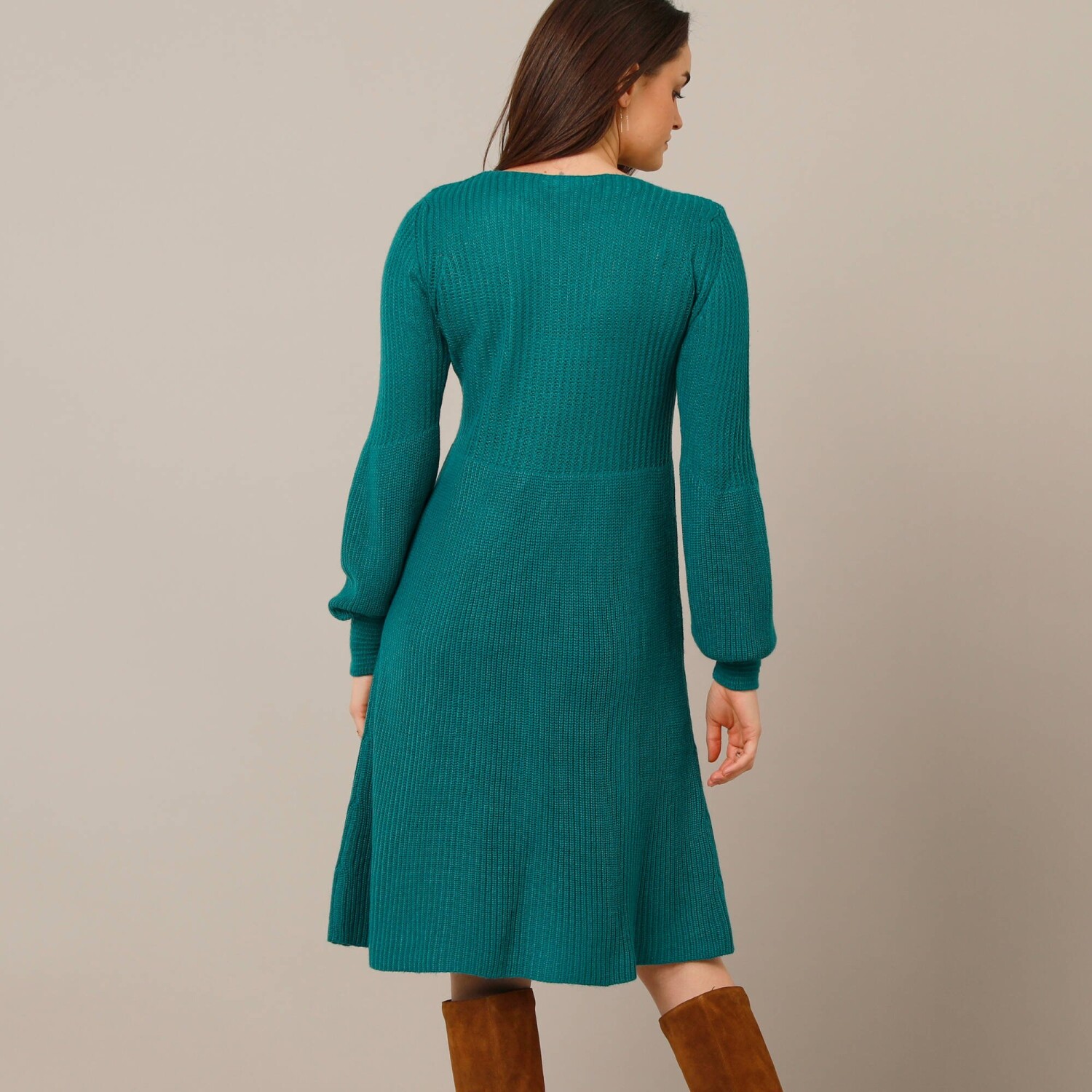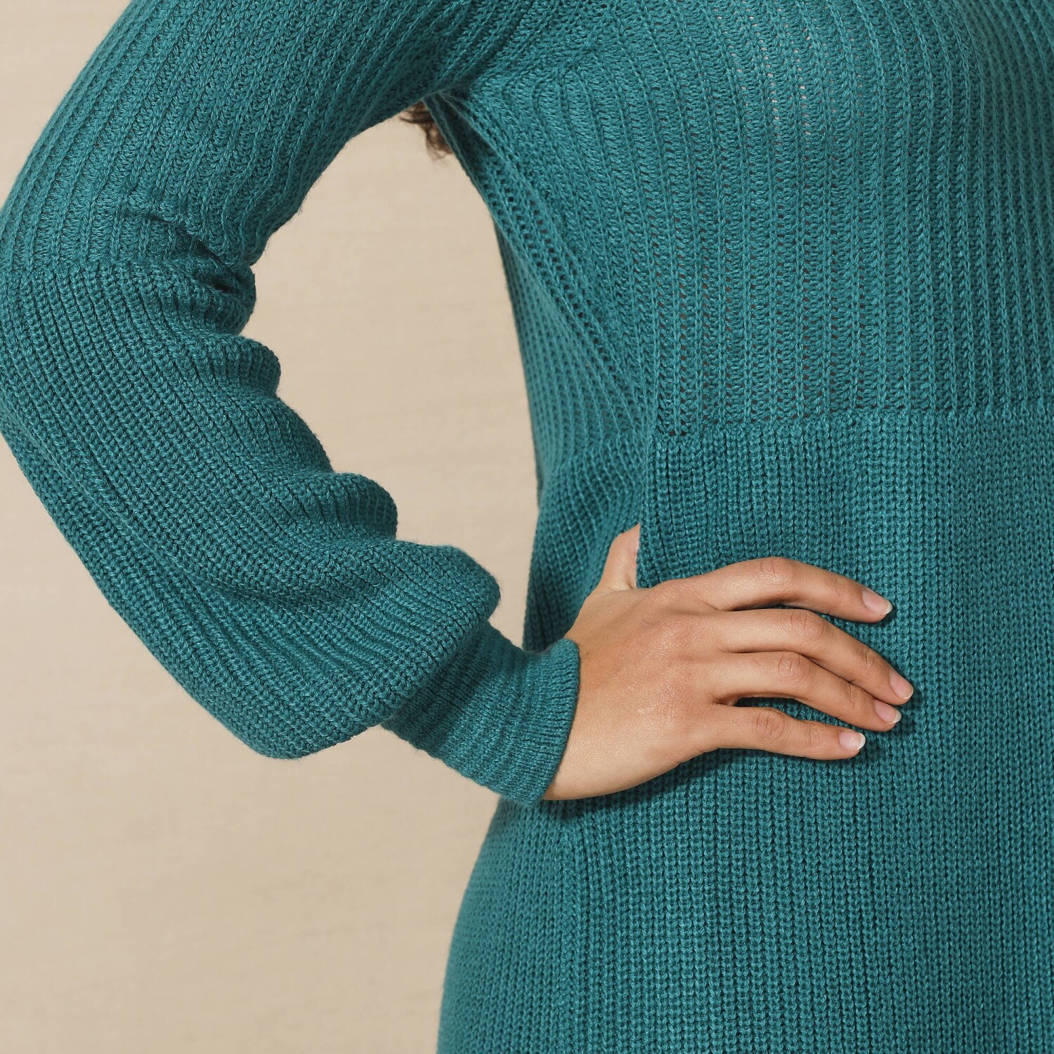 Úpletové rozšírené šaty bodujú krásnym vzorom a nadýchanými rukávmi. Konce nadýchaných dlhých rukávov s vrúbkovanými manžetami. Mierne priliehavé v páse. Rozšírený strih. Možno prať v práčke.