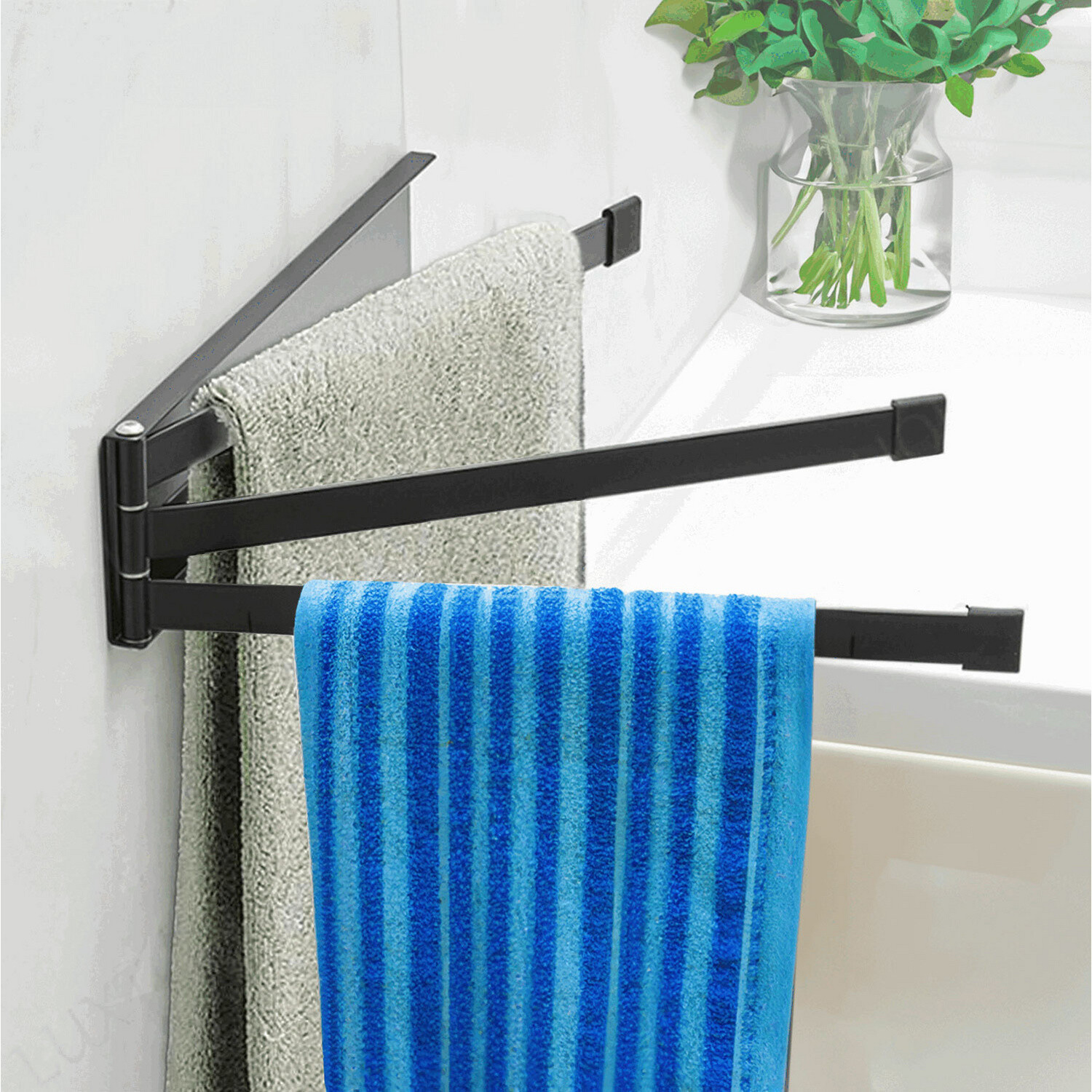 Trojramenný vešiak na uteráky do kúpeľne, na WC pre hostí a do kuchyne - stabilný a otočný. Jednoduché pripevnenie pomocou lepiacej lišty - pevne drží bez vŕtania alebo pribíjania.