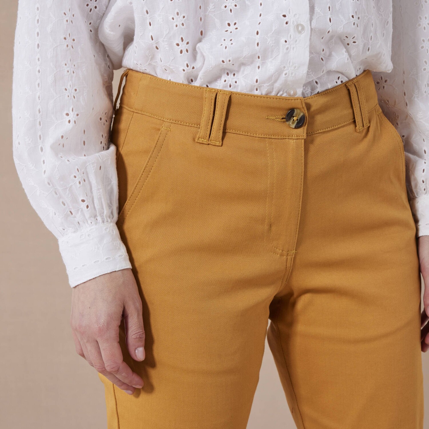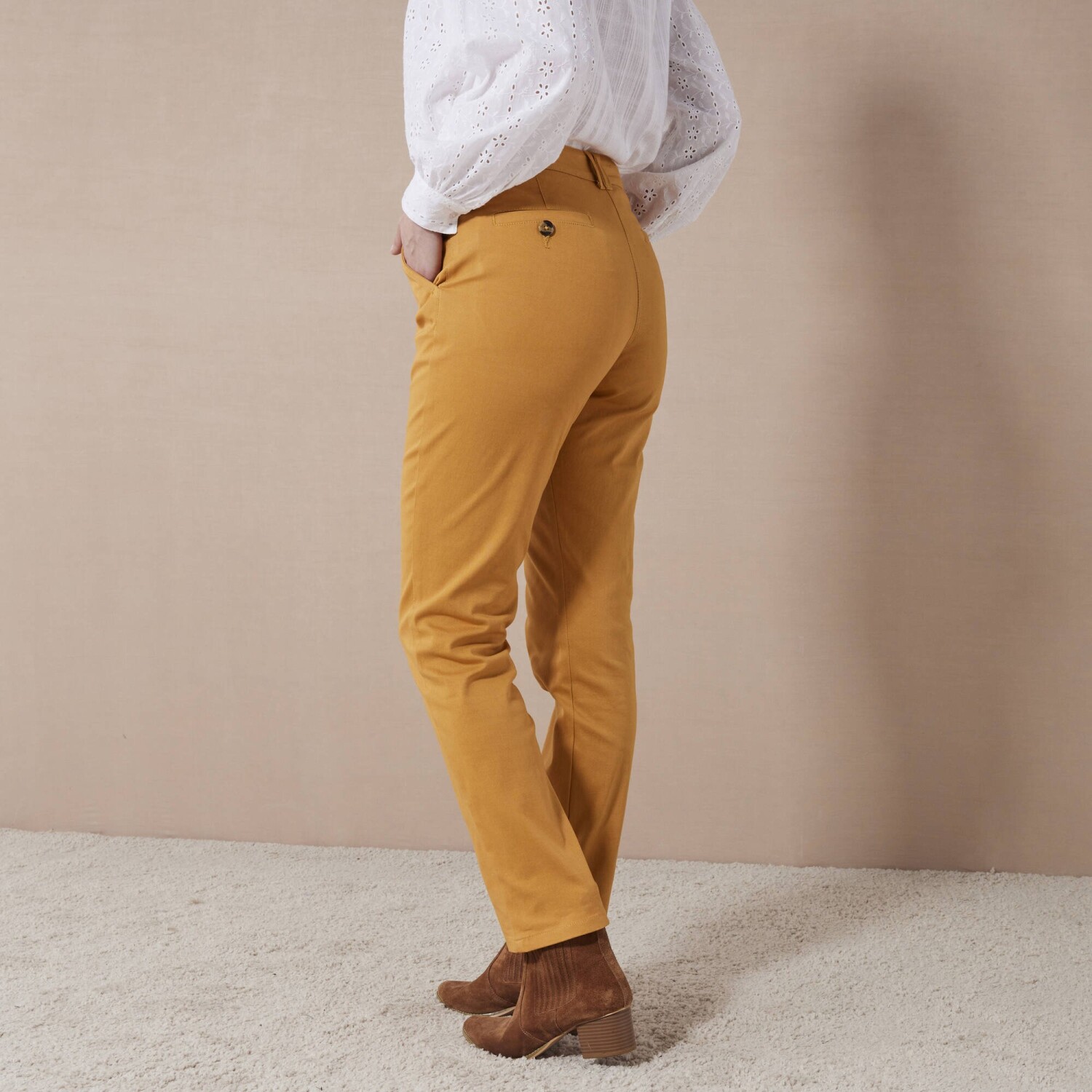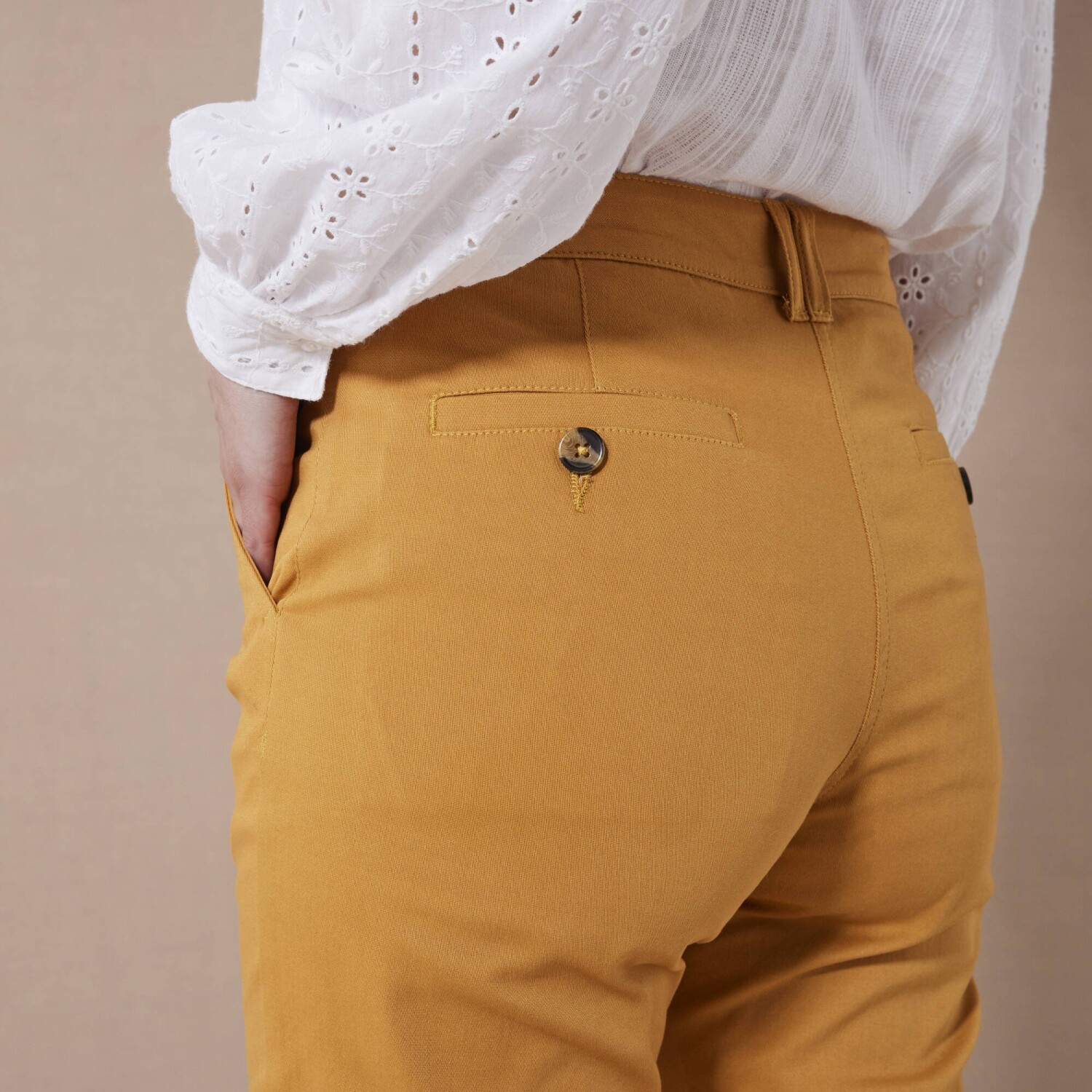 Veľmi módne nohavice v chino strihu možno ohrnúť podľa potreby. Nohavice majú bežnú výšku pása. Pás s pútkami, na bokoch pružný od veľkosti 44. Zapínanie na zips + gombík. Vpredu 2 klinové vrecká. Vzadu 2 záševky a 2 vrecká s paspulou na gombík. Standard 100 by Oeko-Tex (n° CQ 1216/3 IFTH). Táto známka označuje textilné výrobky, ktoré boli podrobené laboratórnym testom na široké spektrum škodlivých látok a výrobok je bezpečný nad rámec platných noriem. Možno prať v práčke.