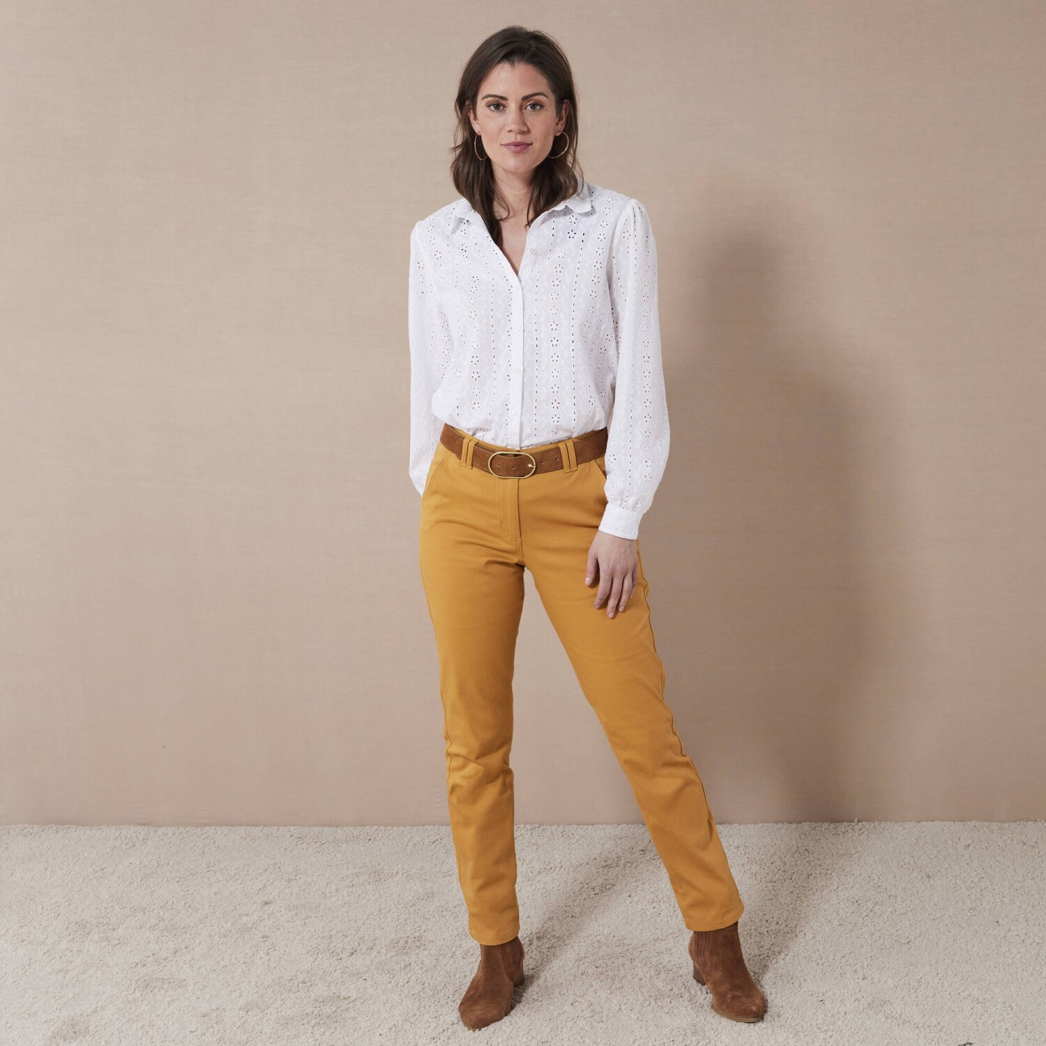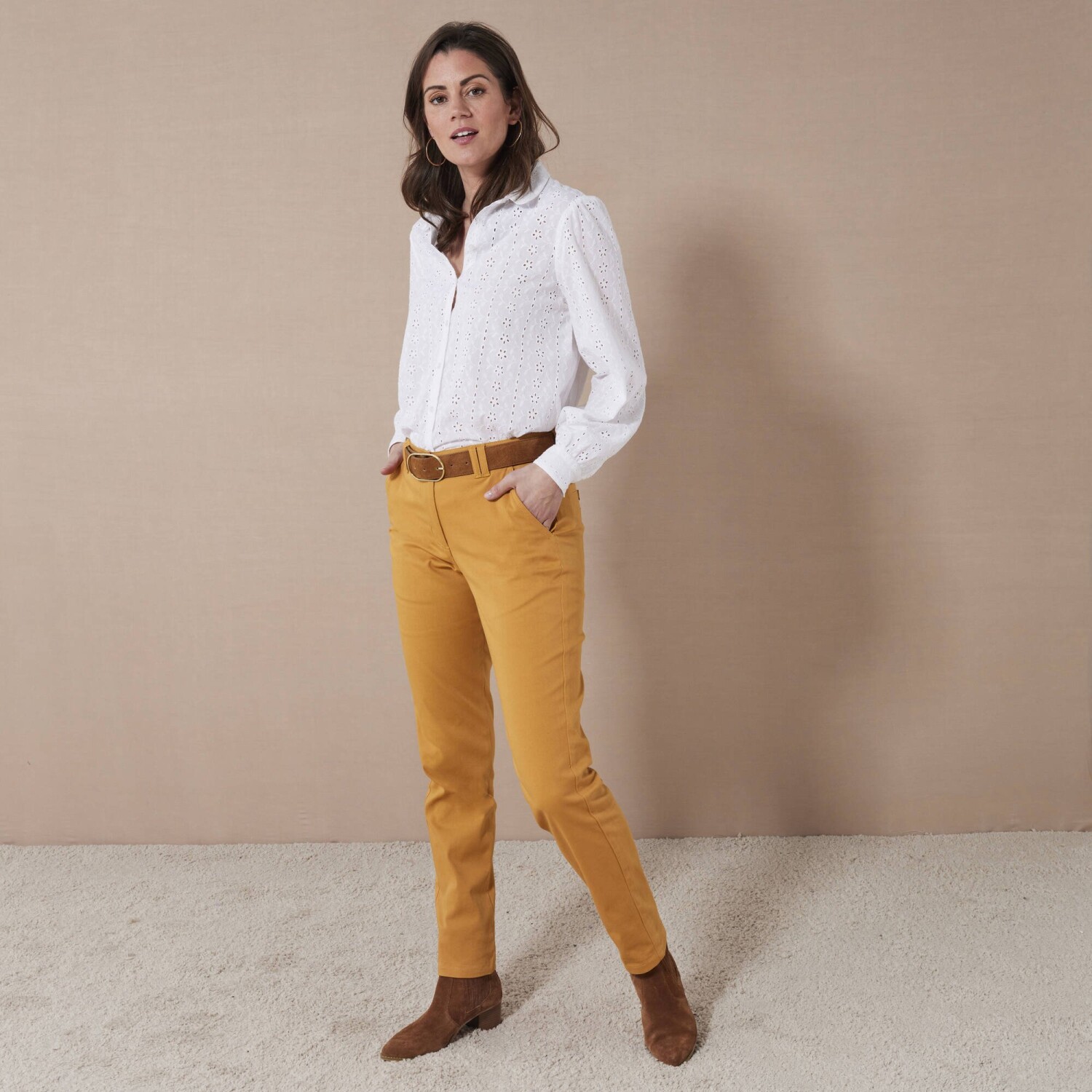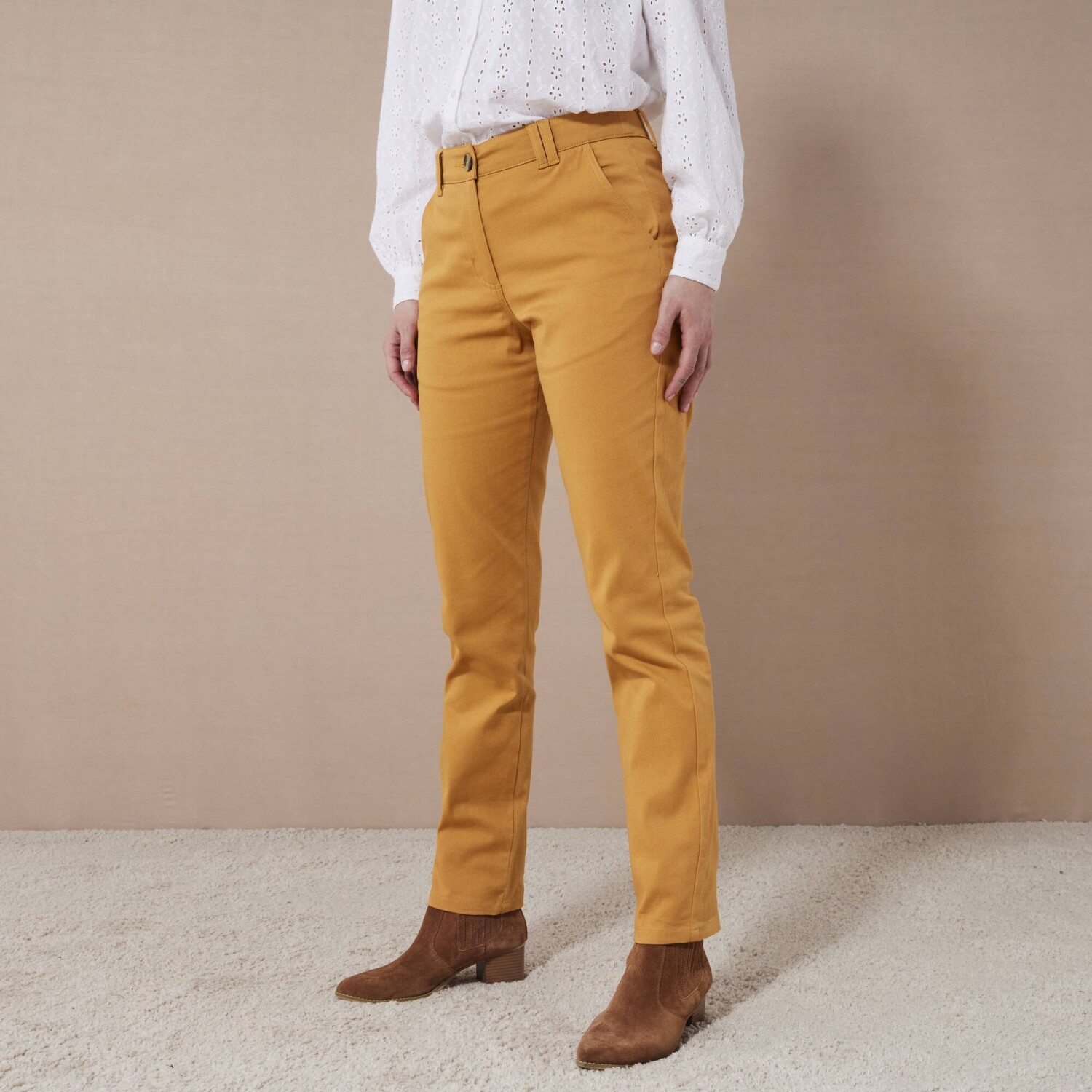 Veľmi módne nohavice v chino strihu možno ohrnúť podľa potreby. Nohavice majú bežnú výšku pása. Pás s pútkami, na bokoch pružný od veľkosti 44. Zapínanie na zips + gombík. Vpredu 2 klinové vrecká. Vzadu 2 záševky a 2 vrecká s paspulou na gombík. Standard 100 by Oeko-Tex (n° CQ 1216/3 IFTH). Táto známka označuje textilné výrobky, ktoré boli podrobené laboratórnym testom na široké spektrum škodlivých látok a výrobok je bezpečný nad rámec platných noriem. Možno prať v práčke.