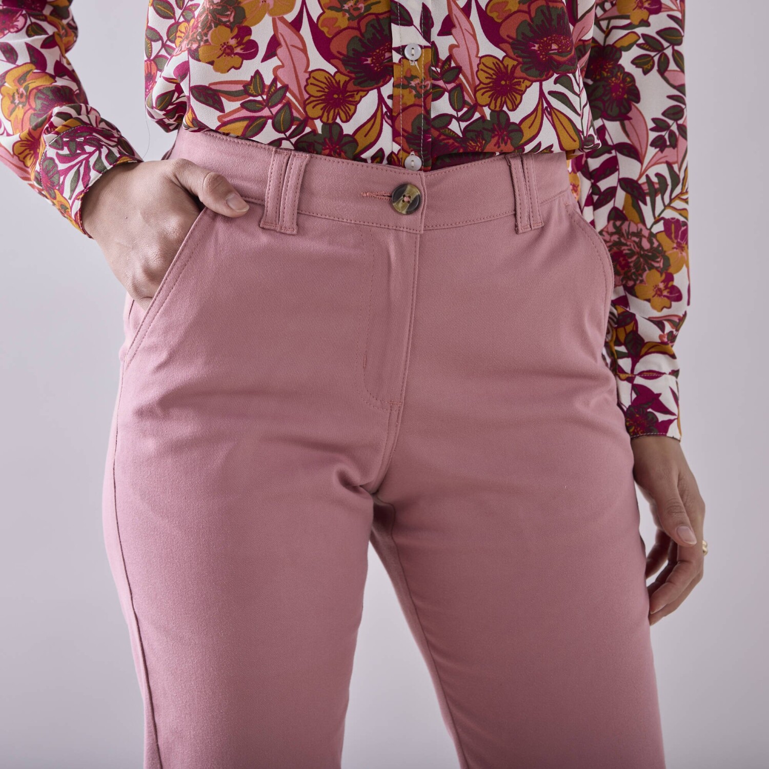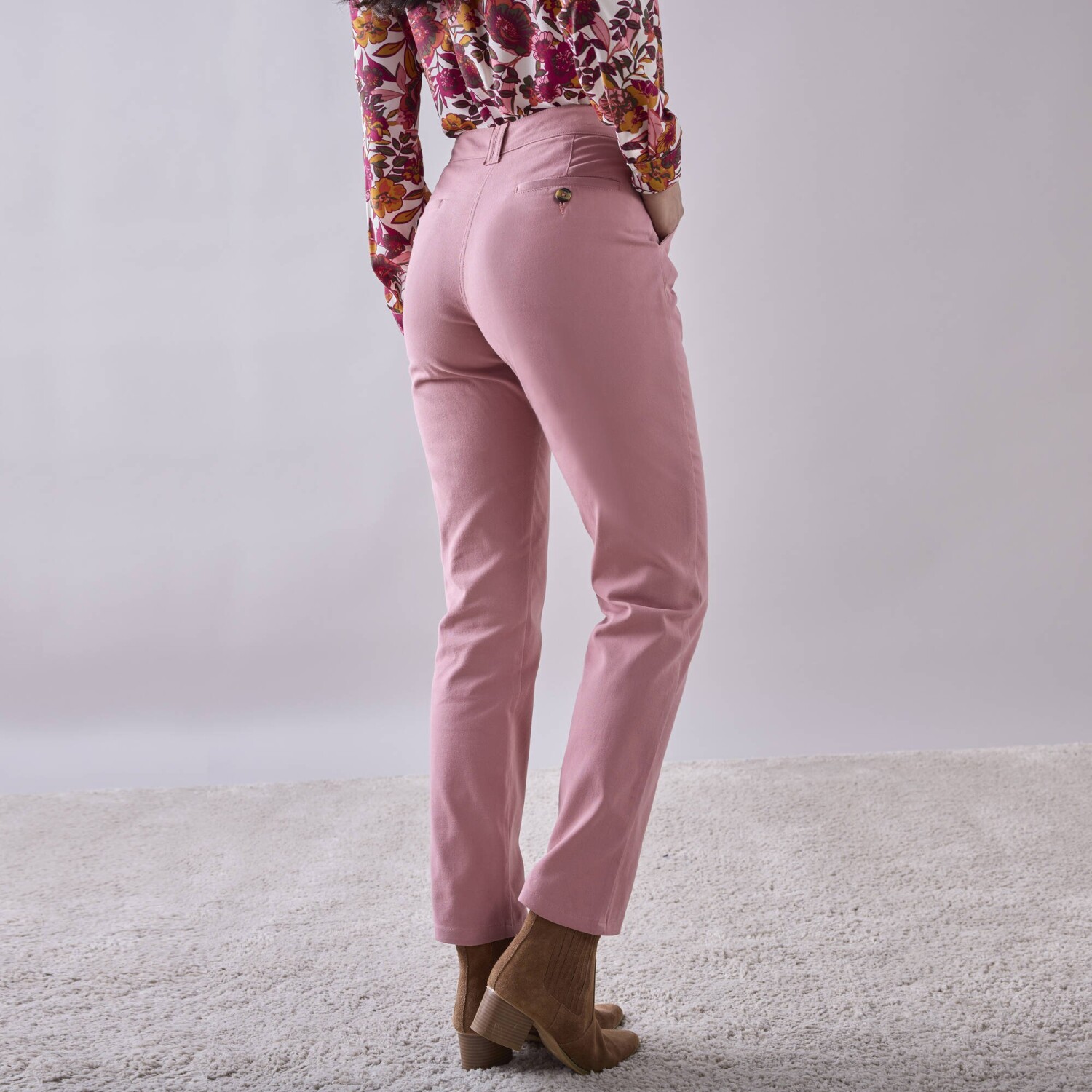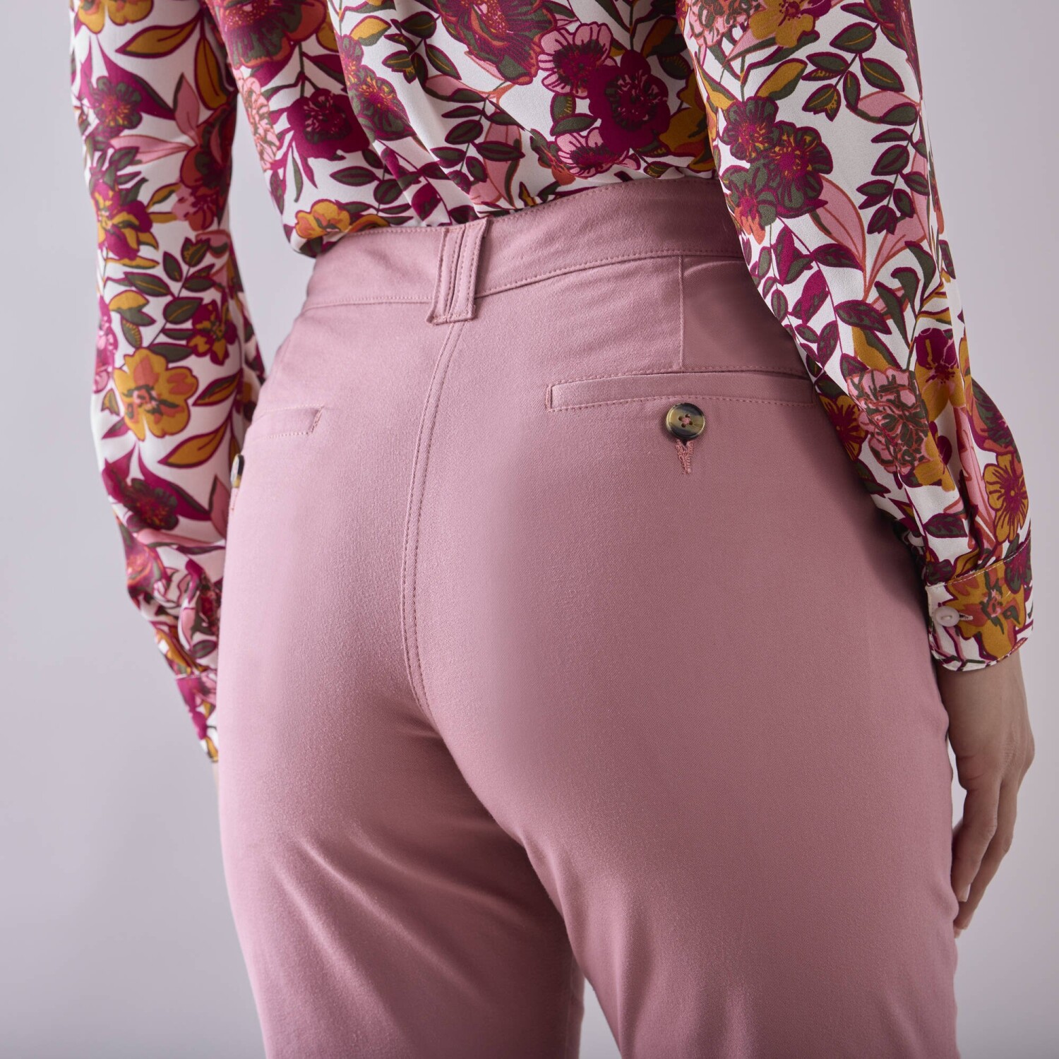 Veľmi módne nohavice v chino strihu možno ohrnúť podľa potreby. Nohavice majú bežnú výšku pása. Pás s pútkami, na bokoch pružný od veľkosti 44. Zapínanie na zips + gombík. Vpredu 2 klinové vrecká. Vzadu 2 záševky a 2 vrecká s paspulou na gombík. Možno prať v práčke.