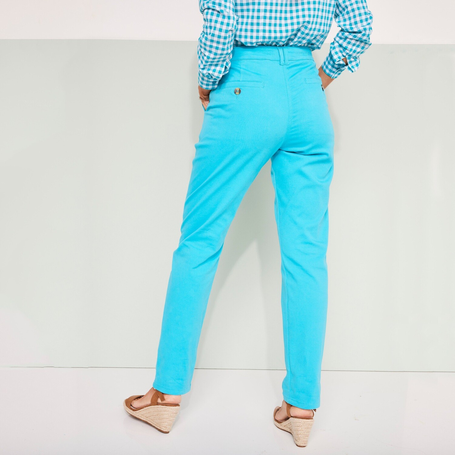 Veľmi módne nohavice v chino strihu možno ohrnúť podľa potreby. Nohavice majú bežnú výšku pása. Pás s pútkami, na bokoch pružný od veľkosti 44. Zapínanie na zips + gombík. Vpredu 2 klinové vrecká. Vzadu 2 záševky a 2 vrecká s paspulou na gombík. Možno prať v práčke.