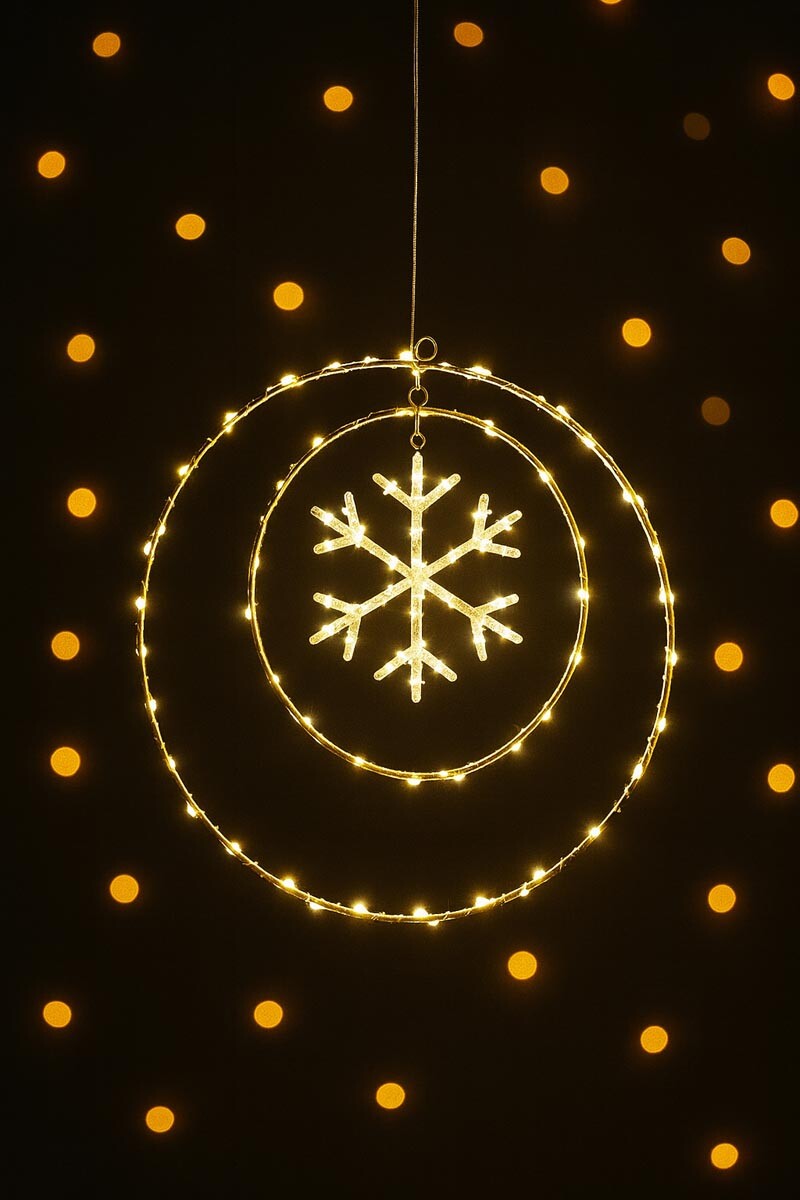 Táto elegantná LED dekorácia vnesie do vášho domova kúzelnú zimnú atmosféru. Kovová konštrukcia s dvoma kruhmi a vločkou uprostred je osvetlená desiatkami teplých bielych LED, ktoré vytvoria útulné svetlo v okne, na stene či v obývacej izbe. Prevádzka na 3x AA batérie (nie je súčasťou). Materiál: kov. Rozmery: priemer: cca 30 cm.