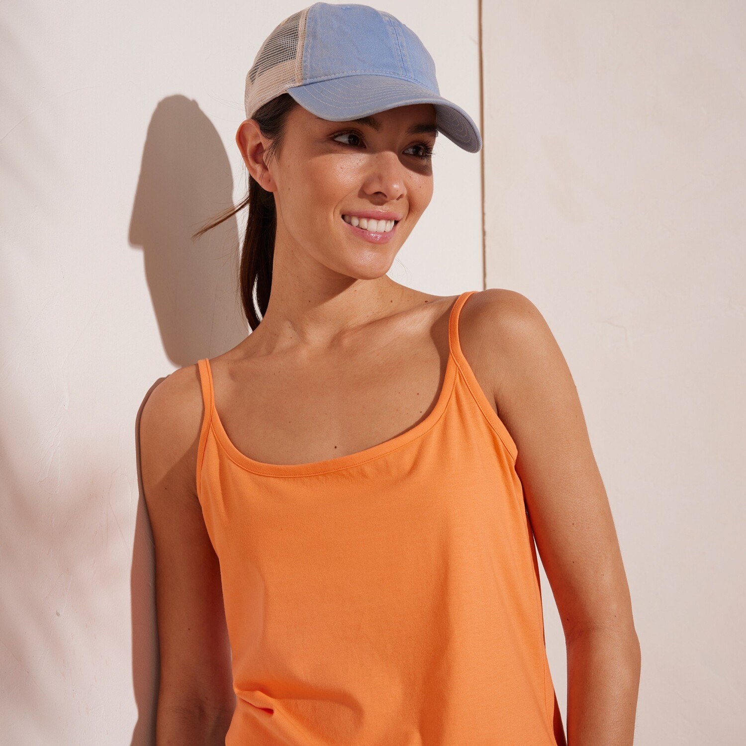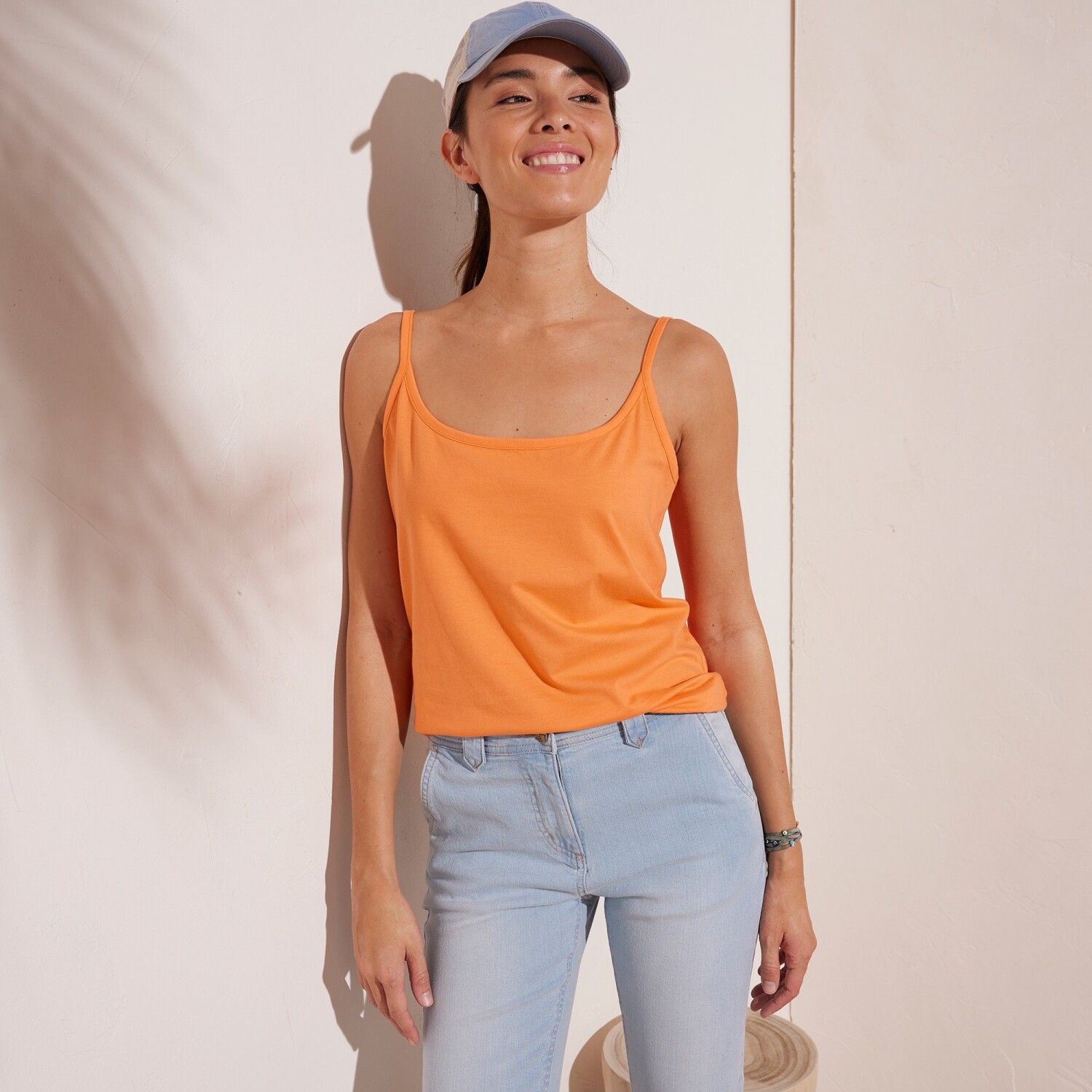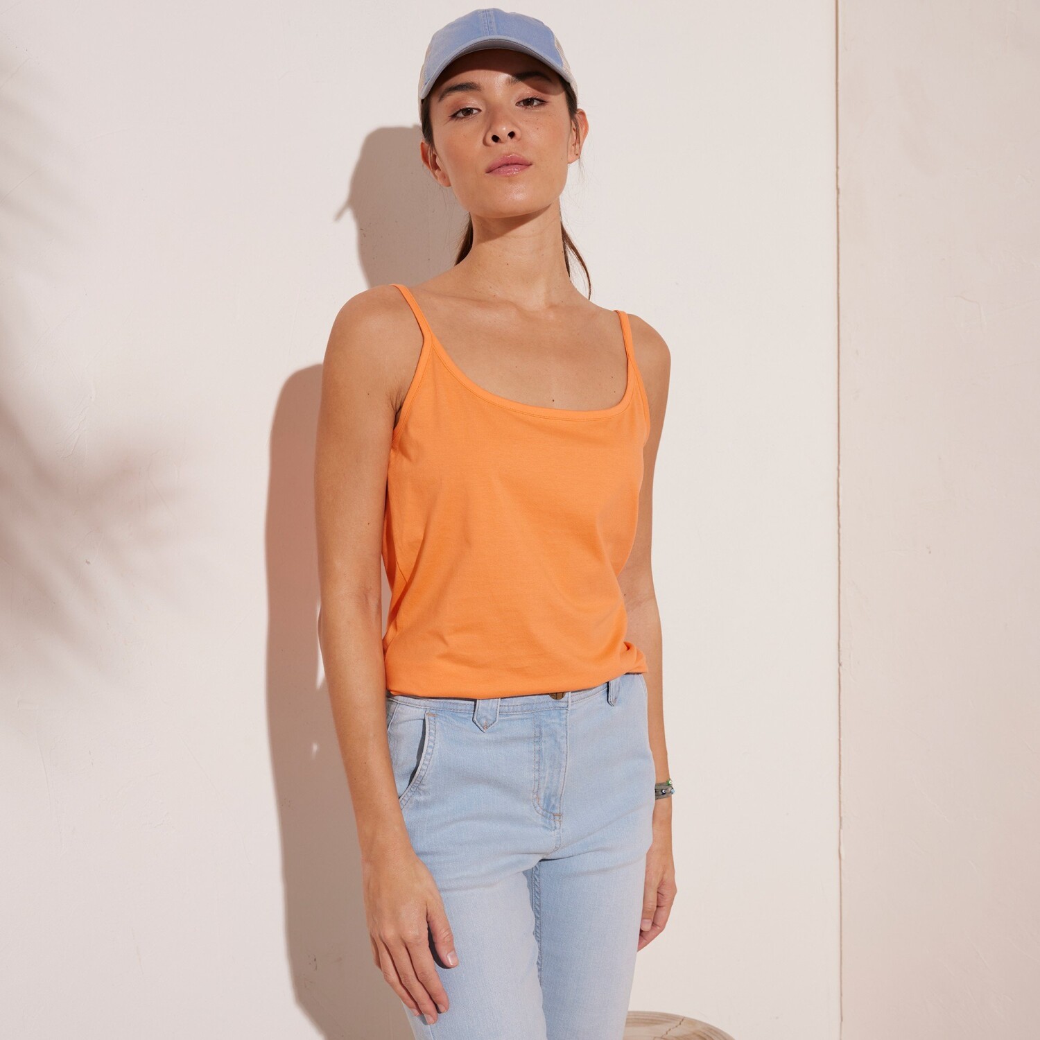 Džerzejový top s úzkymi ramienkami môžete nosiť pod vrchné tričko pre zmiernenie transparentného efektu alebo aj samostatne. Vždy bude skvelý! Vpredu a vzadu okrúhly výstrih. Úzke ramienka bez možnosti nastavenia. Voľný výstrih. Bavlnený džersej. Rovný spodný lem. Standard 100 by Oeko-Tex (Global Organic Textile Standard n° CU 811026GOTS). Táto známka označuje textilné výrobky, ktoré boli podrobené laboratórnym testom na široké spektrum škodlivých látok a výrobok je bezpečný nad rámec platných noriem. Možno prať v práčke.