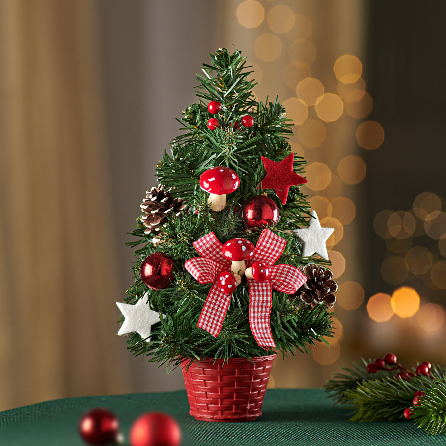Ako živý a neopadáva: malý, jemný vianočný stromček na každý rok. Ako pravý. Starostlivo zdobený. 30 cm vysoký.