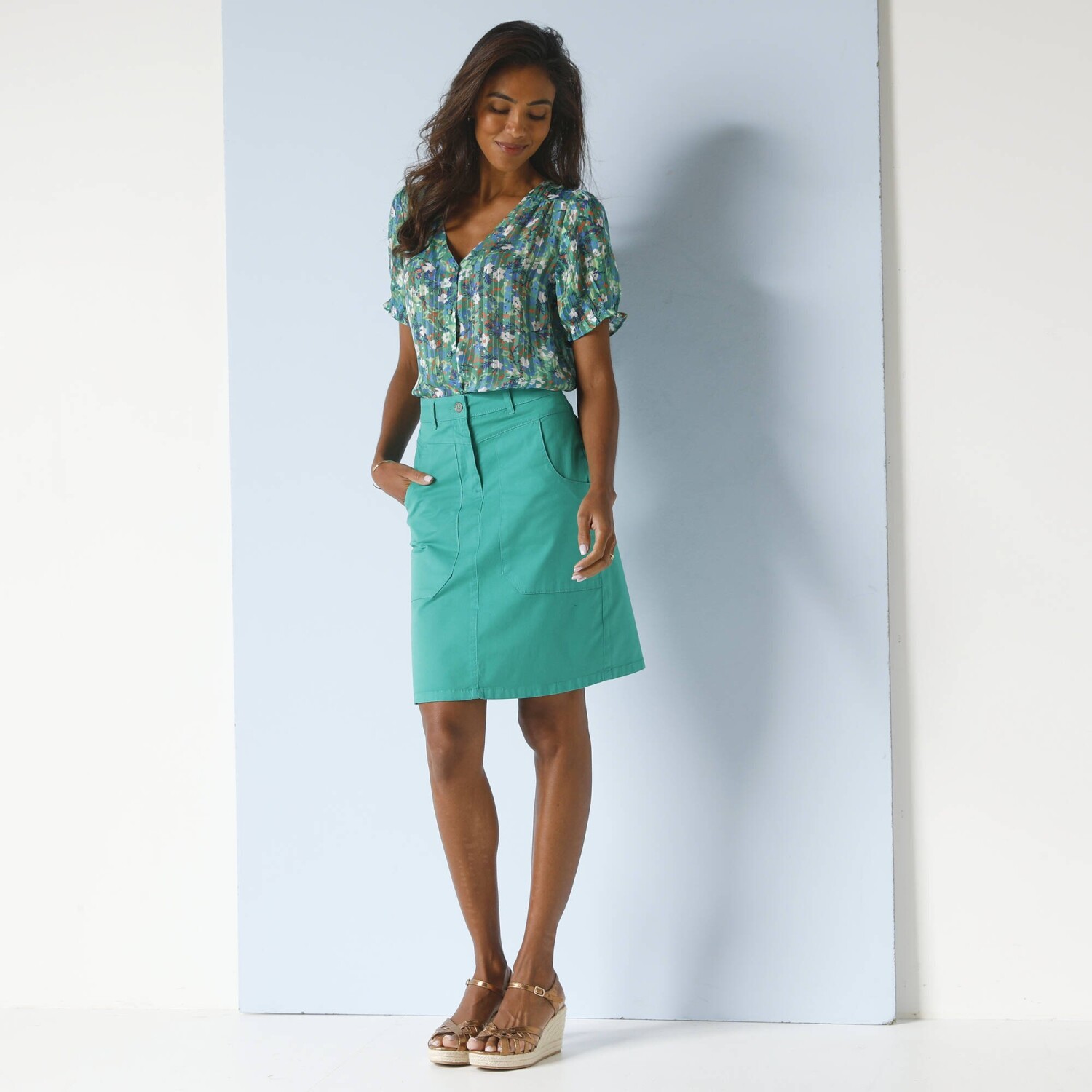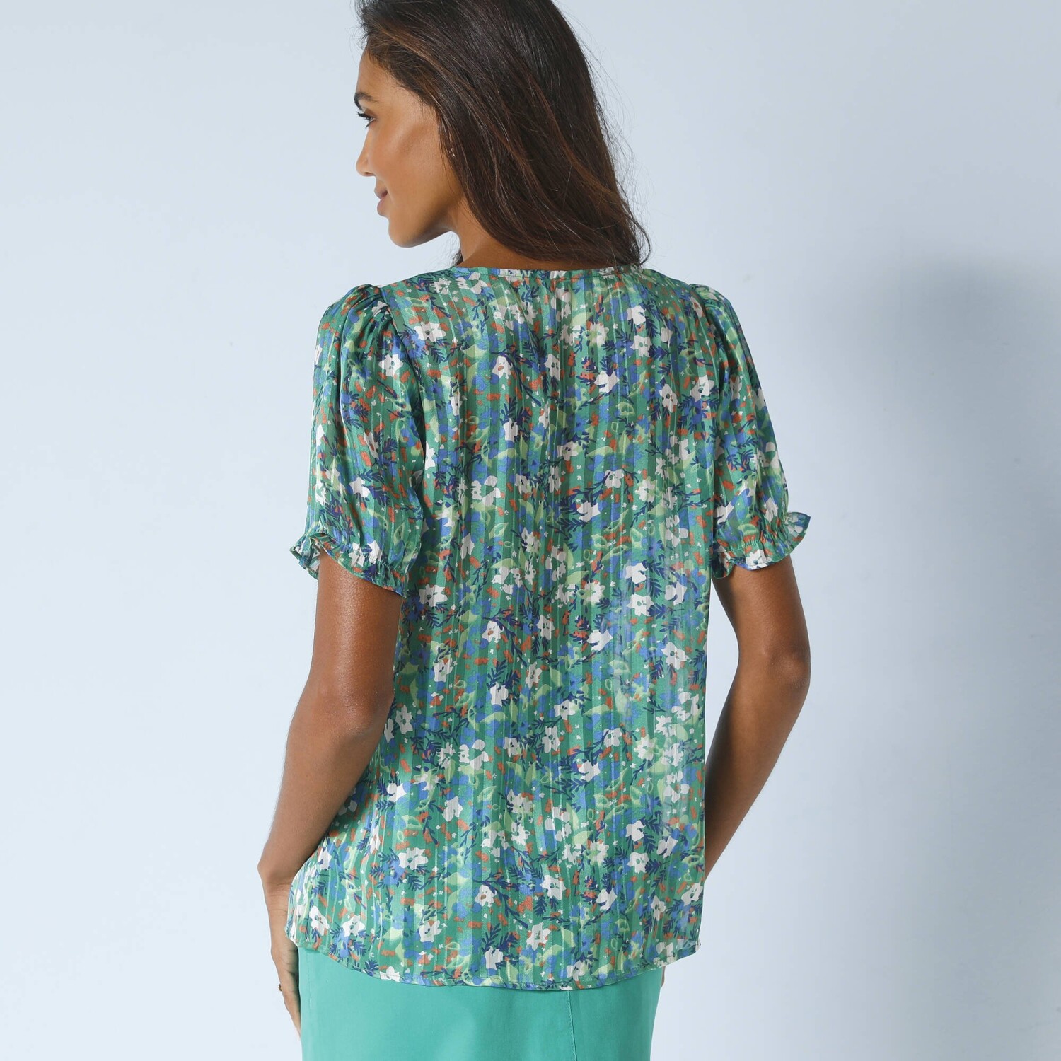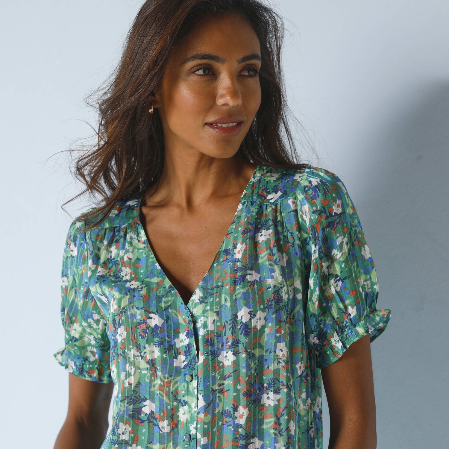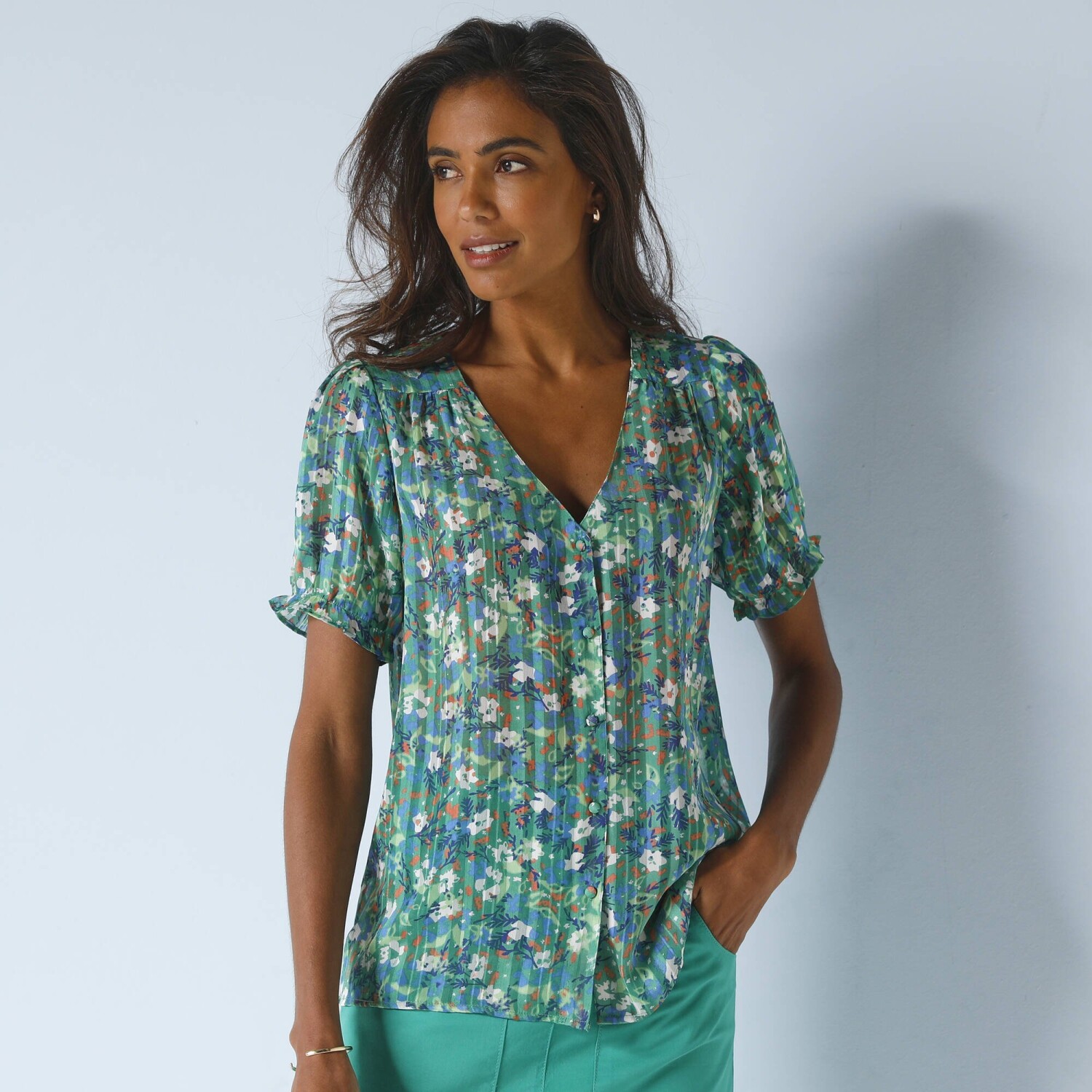 Košeľová blúzka z mušelínu a macramé stavia na ženský štýl. Z poddajného a ľahkého mušelínu. Stojačik s nariaseným volánom. Do V macramé vpredu. Na gombíky. Prsné záševky. Dlhé rukávy. Macramé manžety na gombík. Vzadu nariasená. Oblý dolný lem. Možno prať v práčke.