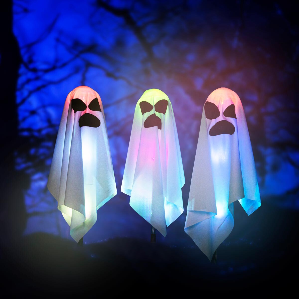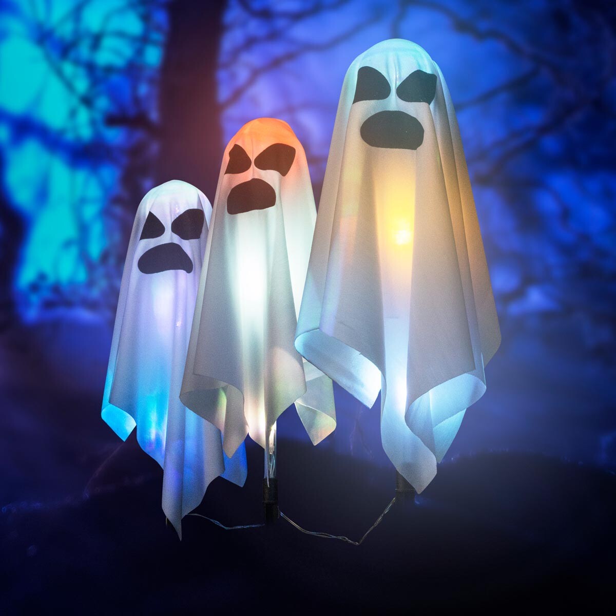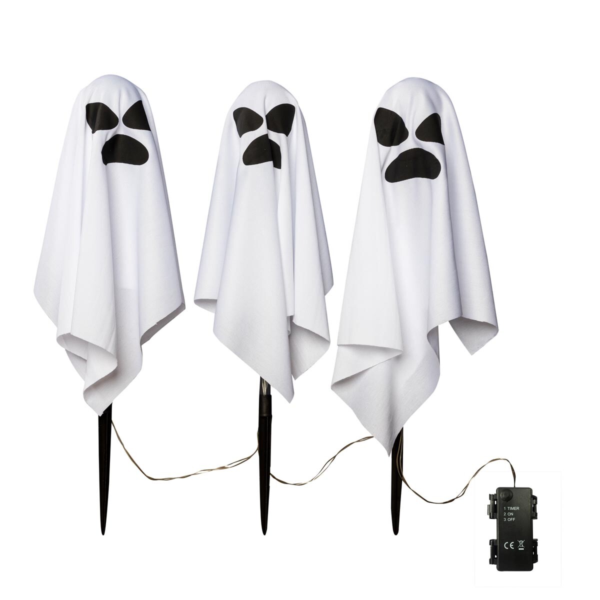 Sú 3, radi strašia a zvlášť na halloweenskej párty vám to radi predvedú. To sú LED diódami osvetlenia duchovia, ktoré vďaka zápichom stačí umiestniť pred domom do zeme. Zvyšok zariadi viacfarebné svetielka v ich telách. Prevádzka na 2x AA batérie (nie sú súčasťou), so 6hodinovým časovačom. Materiál: plast. Rozmery: každý duch cca 7 x 35 cm, zápich 14 cm.
