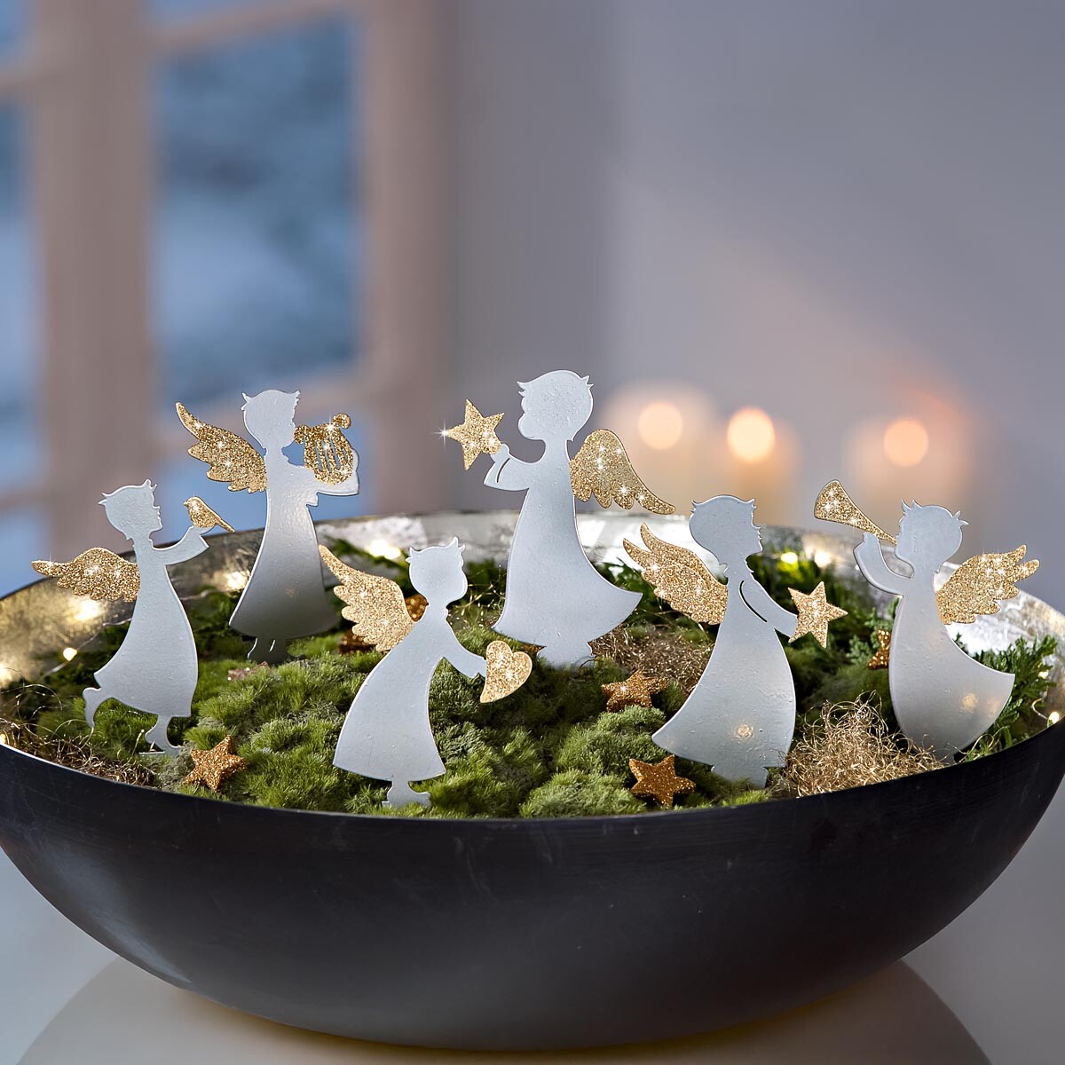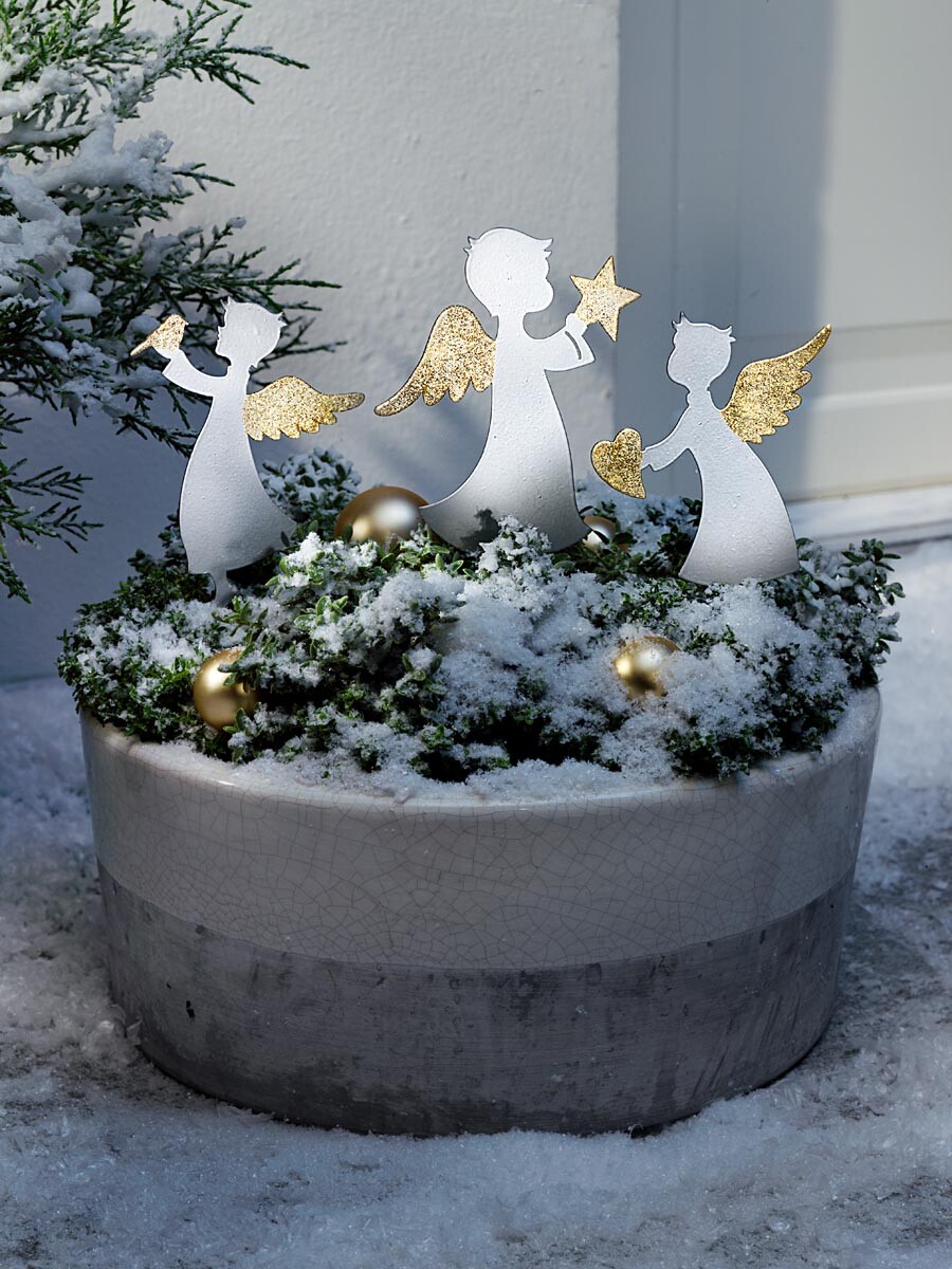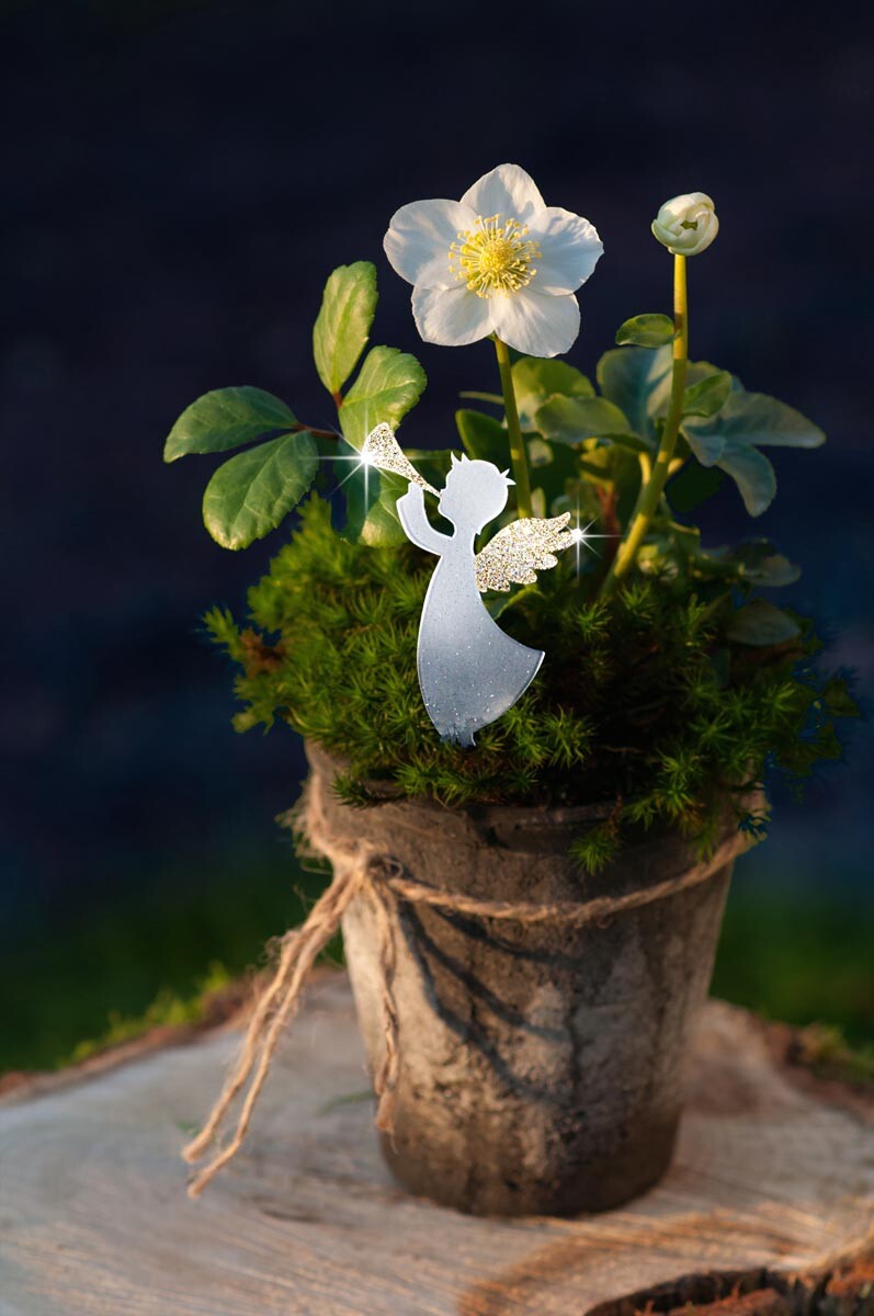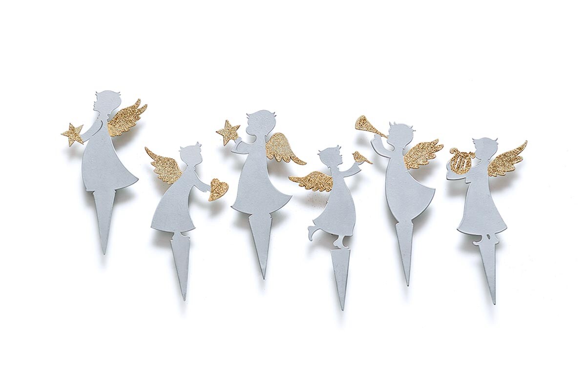 Kúzelní anjelici ako dekorácia do interiéru aj exteriéru ozdobia balkónové hrantíky, kvetináče aj ostatné vianočné dekorácie. Sada 6 zápichov so 6 motívmi a brúsenými hrotmi. Materiál: kov. Rozmery: výška 10 cm, zápich 5,5 cm.